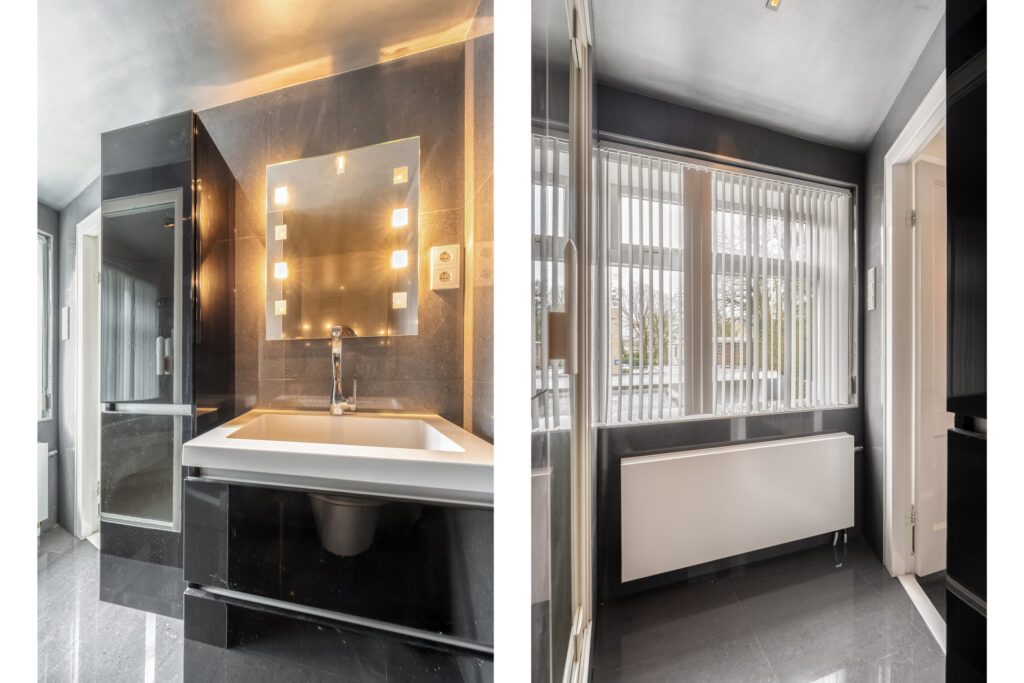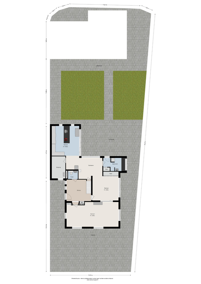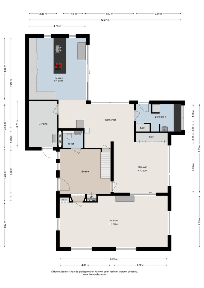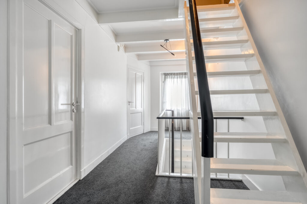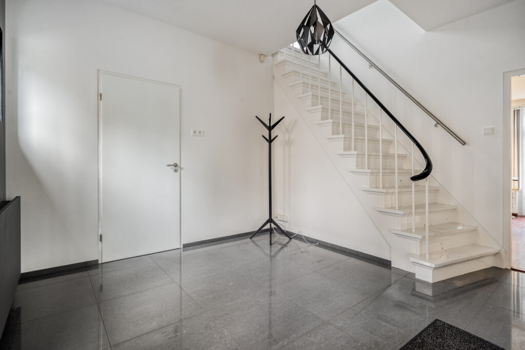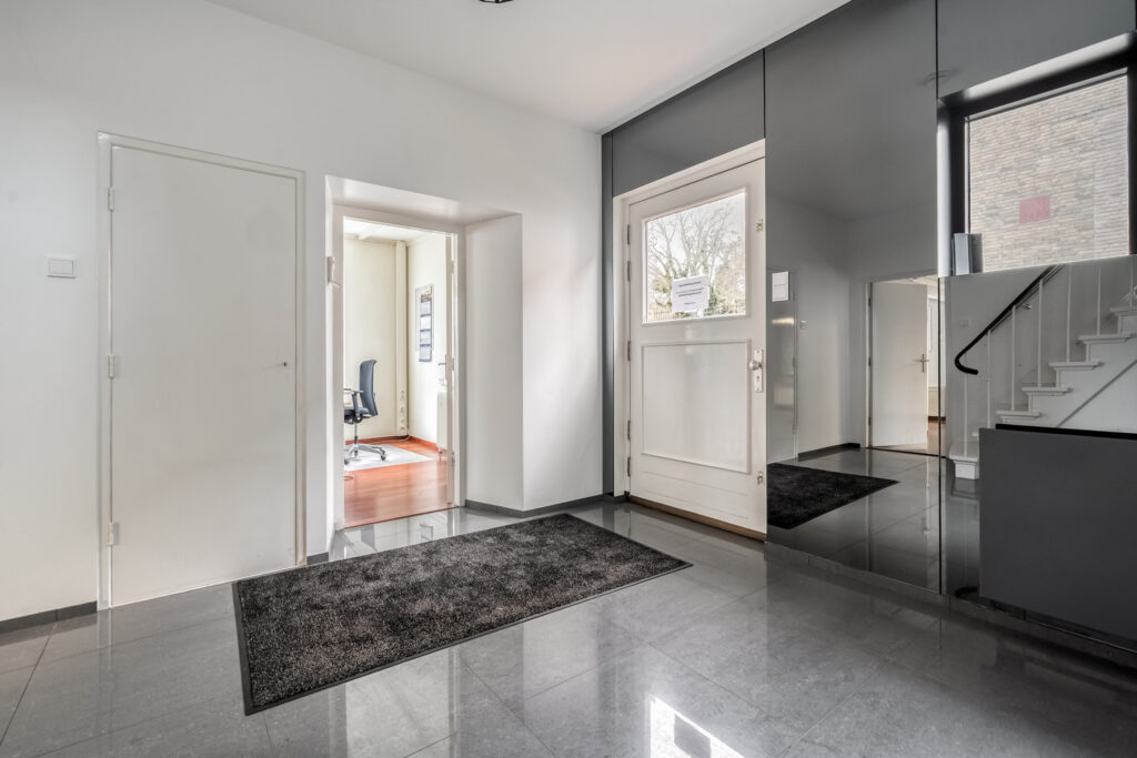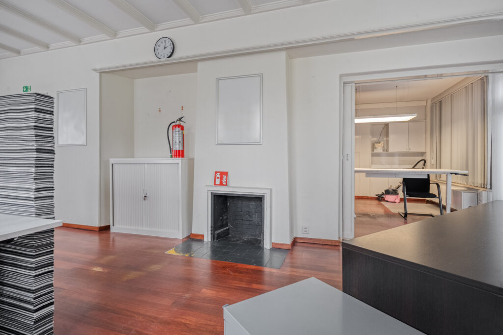 Begane grond: Entree met meterkast, toilet met fonteintje en trapopgang naar de eerste verdieping. Vanuit de hal is royale kantoorruimte te bereiken met toegang tot tweede werkruimte met vaste kast. Verder toegang tot bijkeuken, berging, keuken en kelder. Keuken is voorzien van grote keukenopstelling met inductiekookplaat, twee ovens en volop bergruimte.