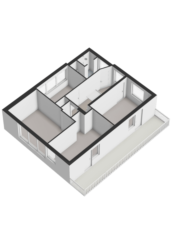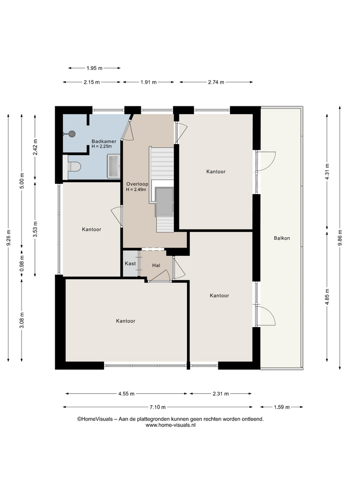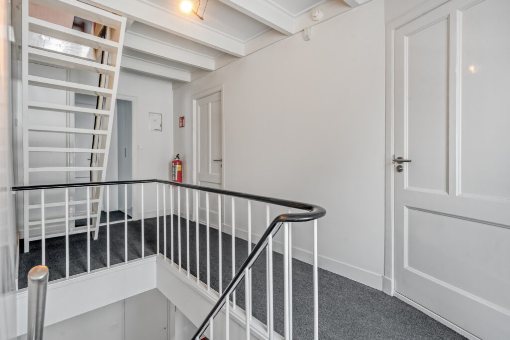 Eerste verdieping: overloop met toegang tot vier royale werkruimtes en badkamer. Twee werkkamers bieden toegang tot balkon. Via vaste trap is de zolder te bereiken.