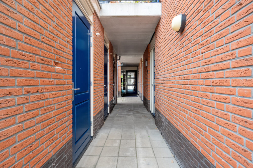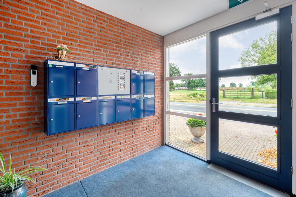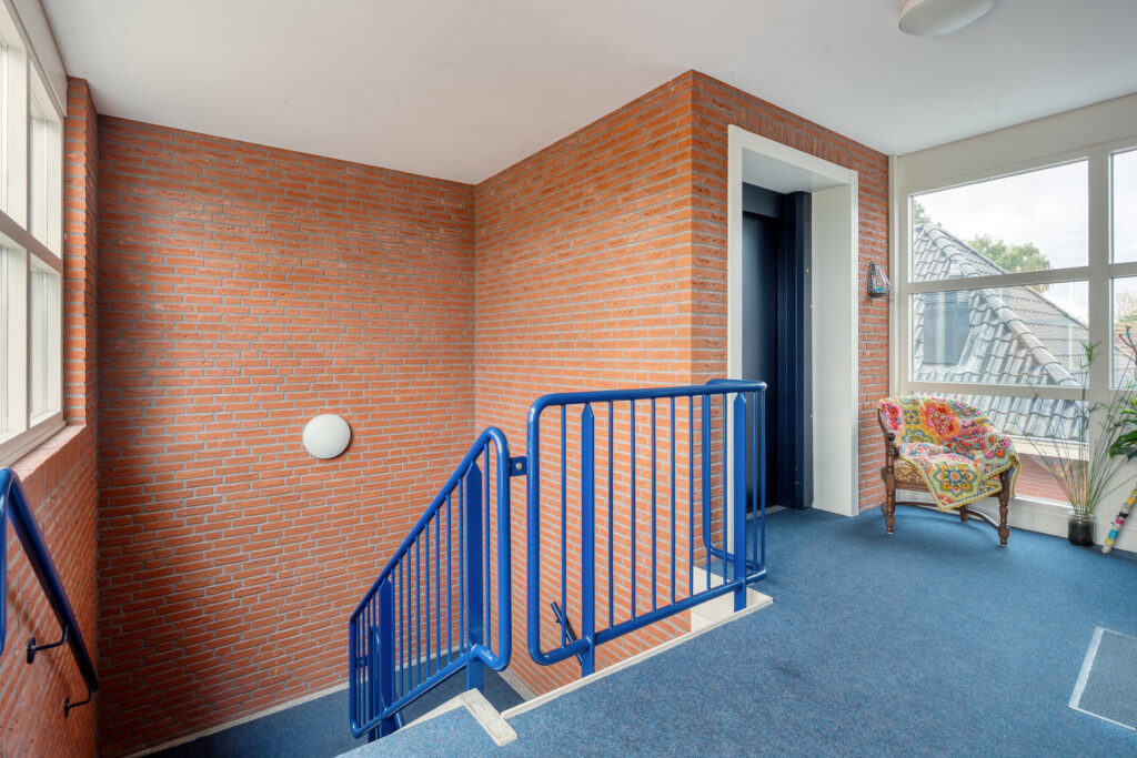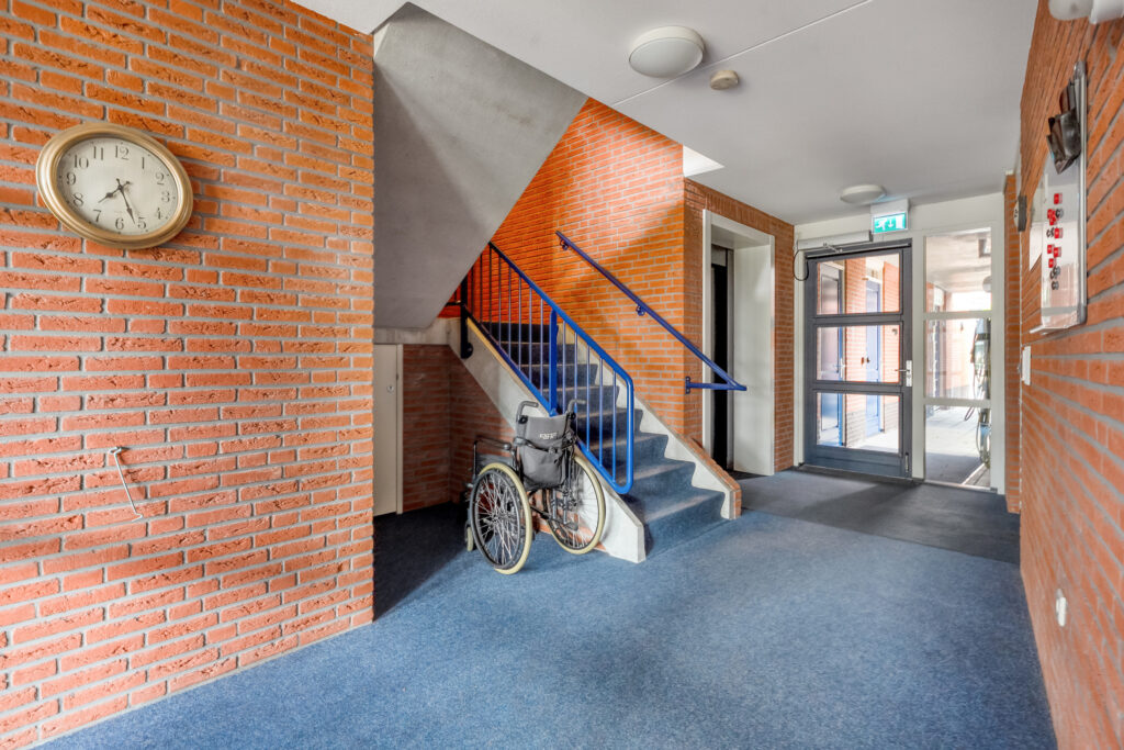 Centrale entree met postvakken en bellentableau, videofoon-/intercominstallatie, centraal trappenhuis met liftinstallatie.
