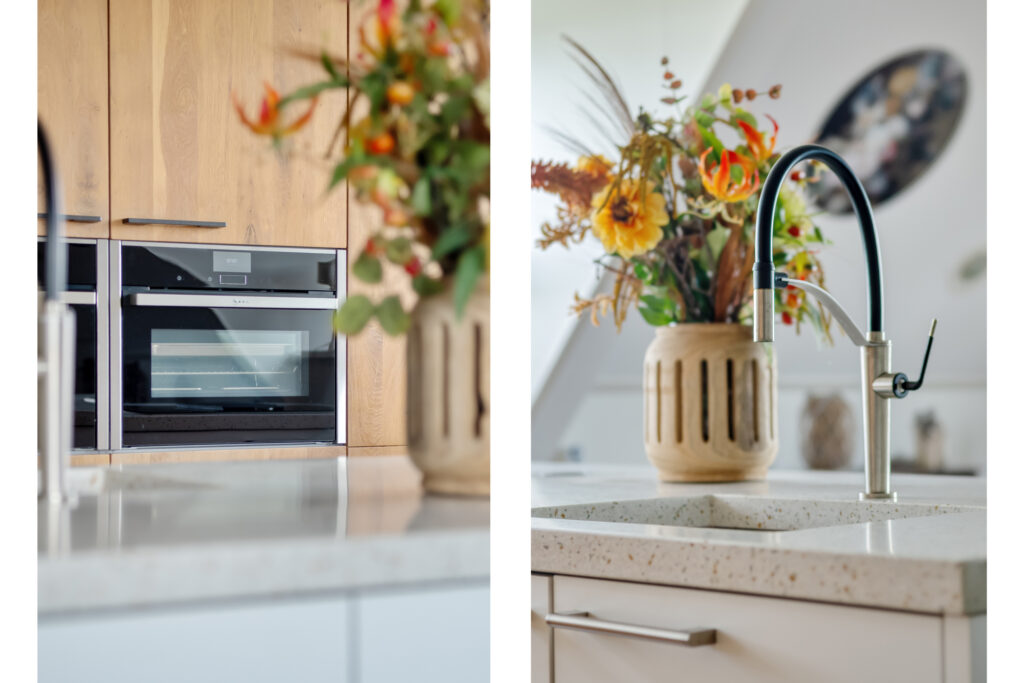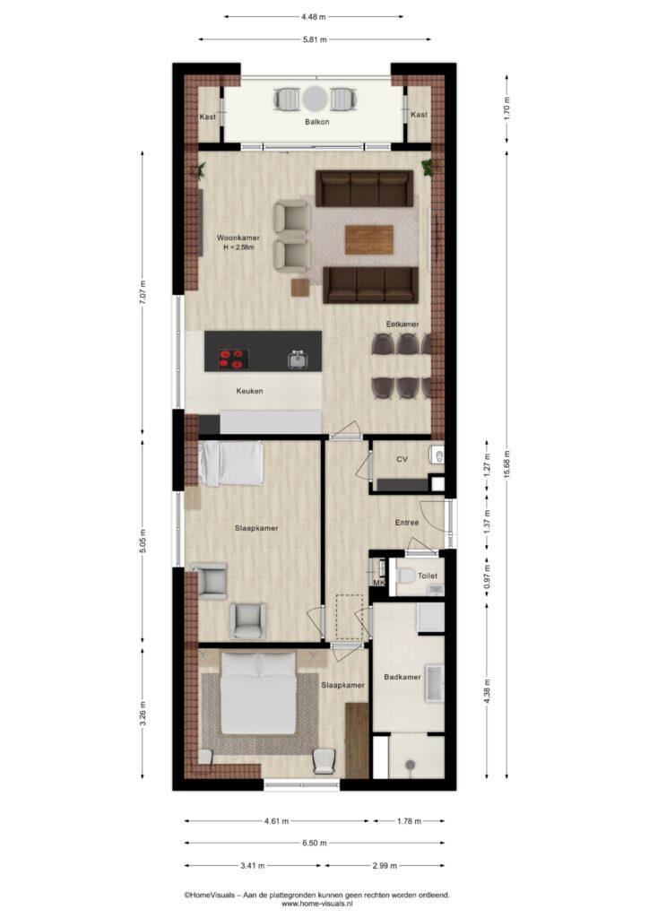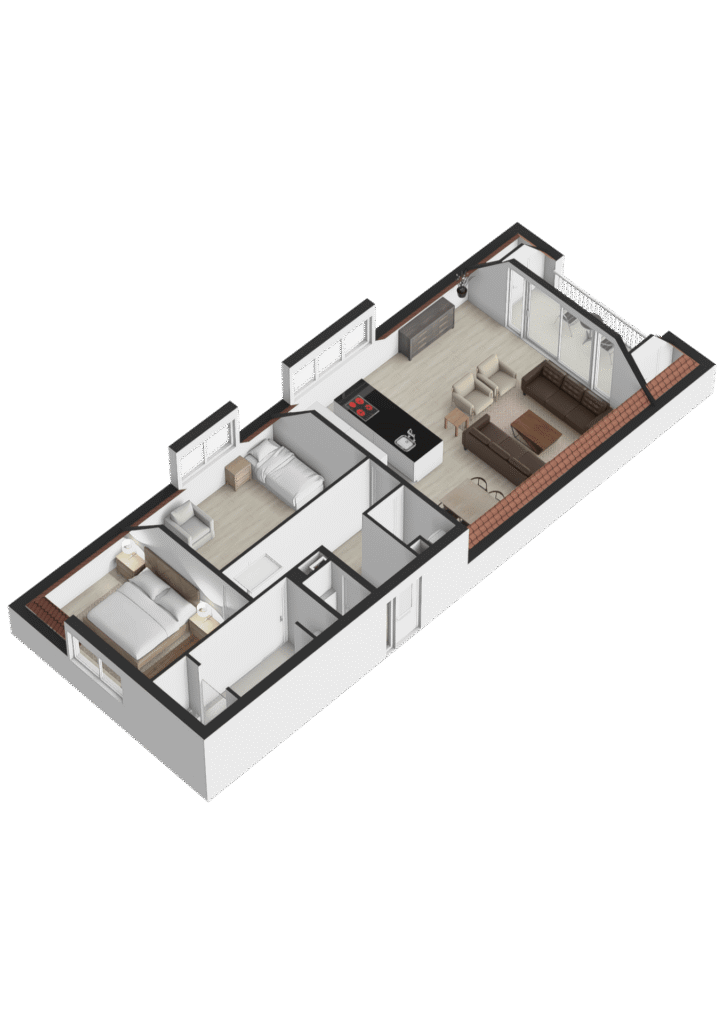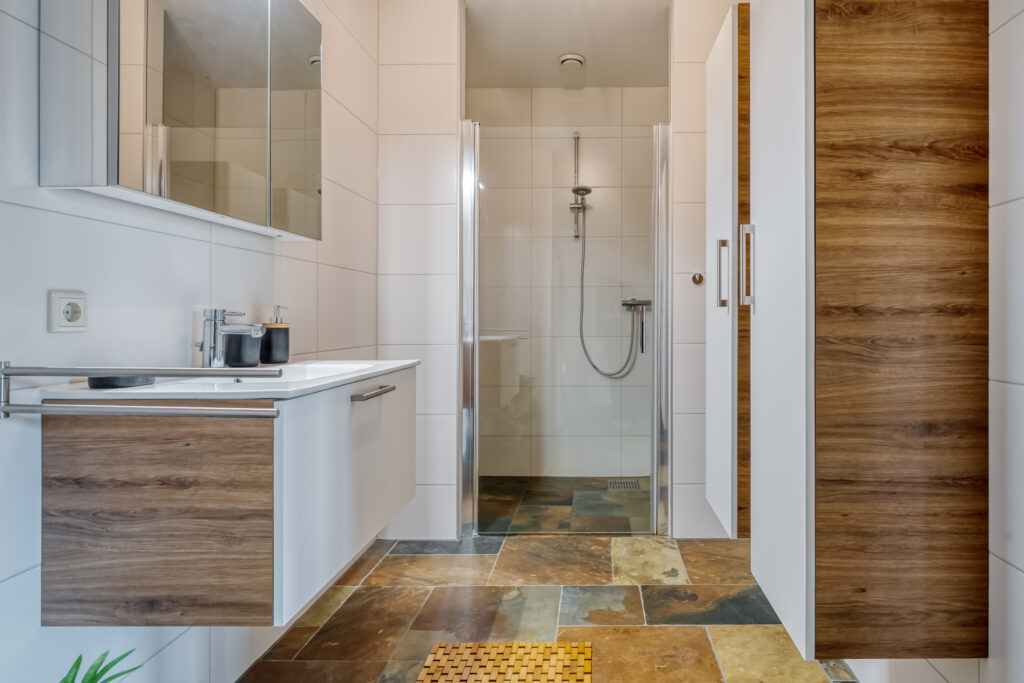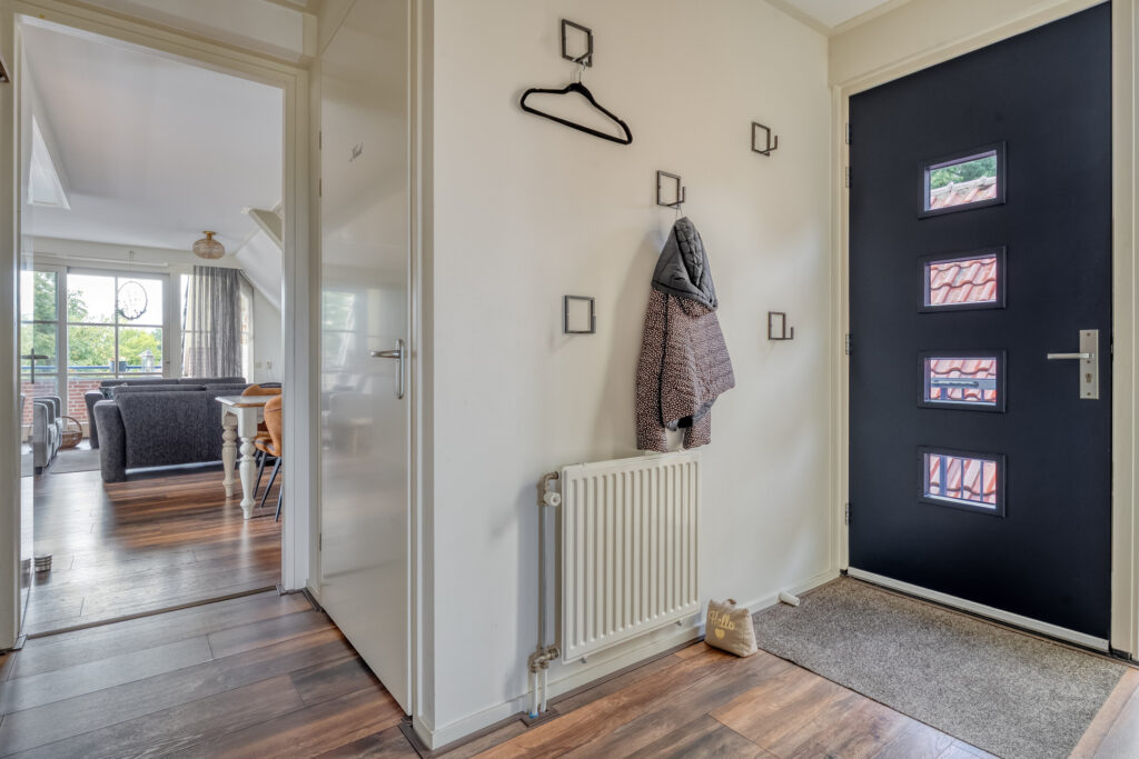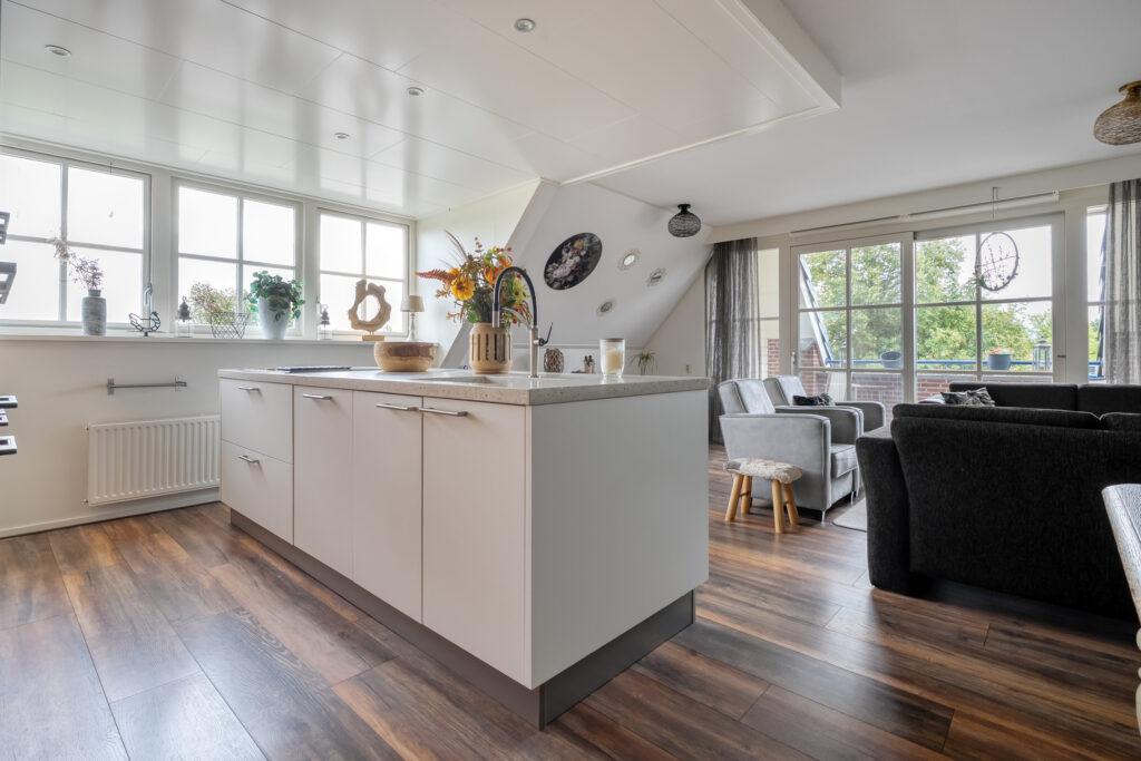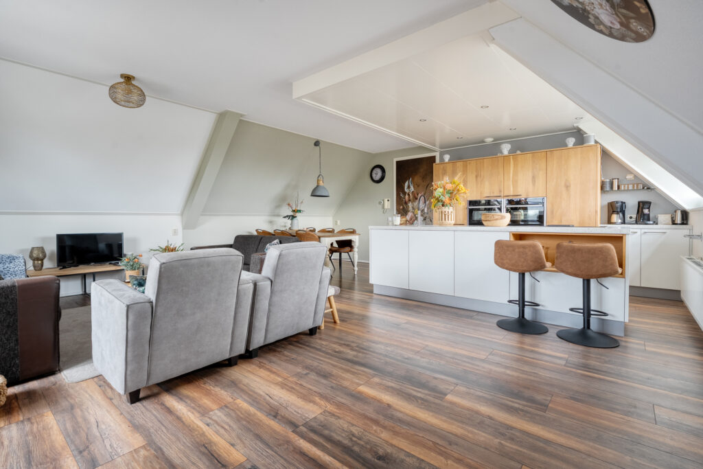 Bij binnenkomst stap je in de hal met meterkast, toilet (wandcloset) met fontein, C.V. ruimte en geeft deze toegang tot de overige vertrekken. Aan de rechterzijde bevindt zich de ruime en lichte woonkamer met een luxe open keuken van massief eiken. Grote ramen zorgen hier voor een overvloed aan daglicht, waardoor de ruimte uitnodigend en ruimtelijk aanvoelt. Vanuit de woonkamer heb je toegang tot de ruime loggia die aan beide zijden bergruimte biedt en waar je in de middag en avondzon kunt genieten van het uitzicht over het dorp. De open keuken met kookeiland heeft een natuurstenen blad en is voorzien van alle moderne gemakken waaronder een inductiekookplaat, zowel een stoomoven en combi-oven en vaatwasser. Terug in de hal vind je de twee slaapkamers, de eerste slaapkamer is ideaal als logeer- of werkkamer. Verder doorlopend kom je bij de tweede, royale slaapkamer die voldoende ruimte biedt voor een comfortabel tweepersoonsbed en kastruimte. De moderne badkamer ligt centraal in de woning en is uitgerust met een inloopdouche, wastafelmeubel en twee vaste kasten. Tevens is hier ook de aansluiting aanwezig voor de wasmachine- en droger.