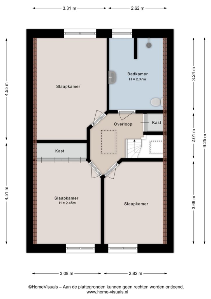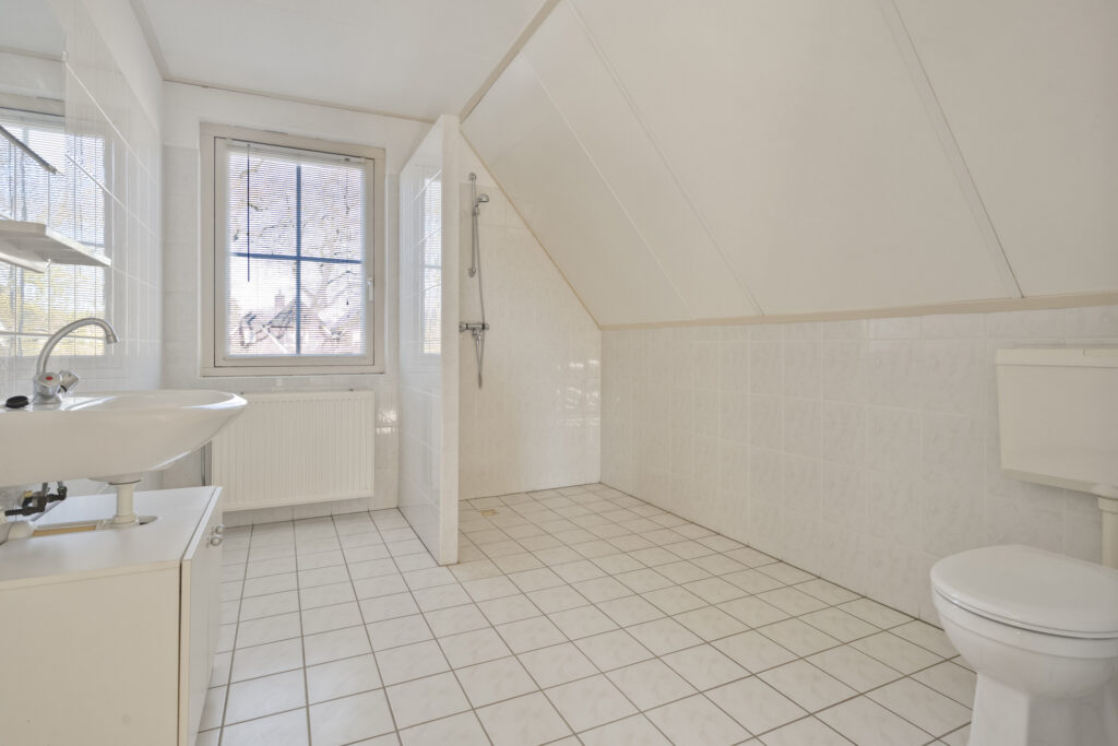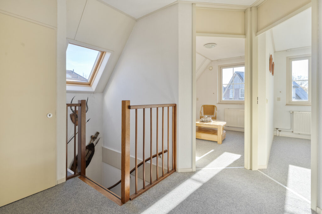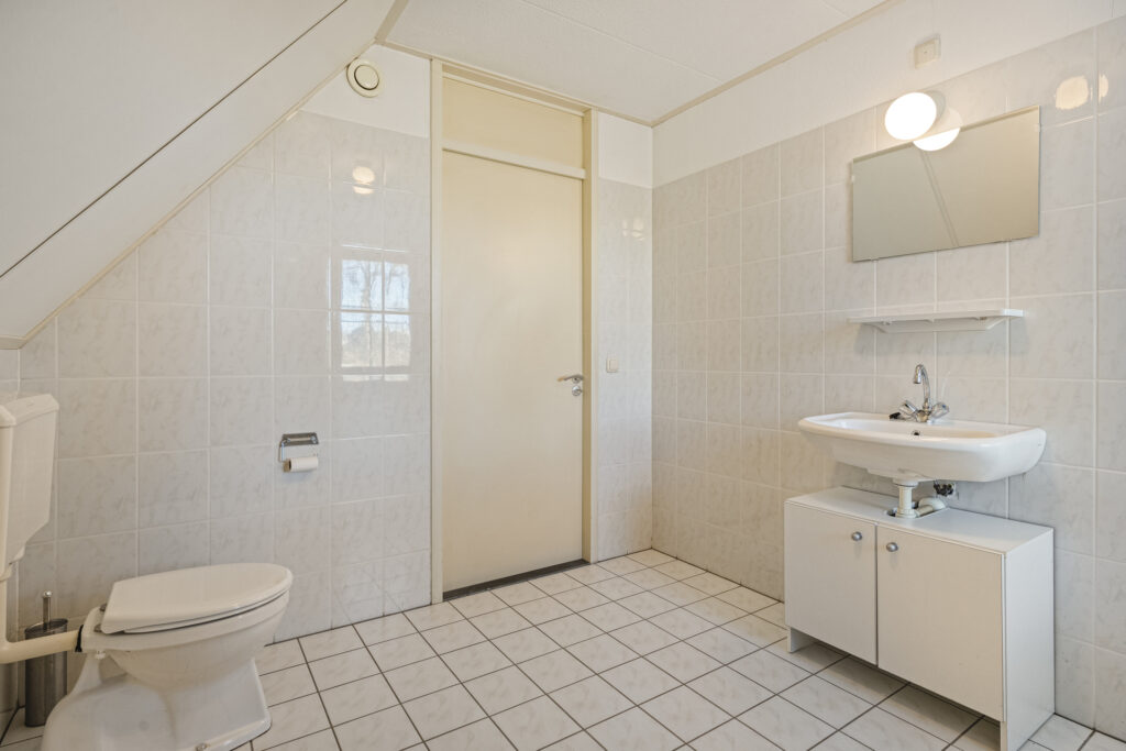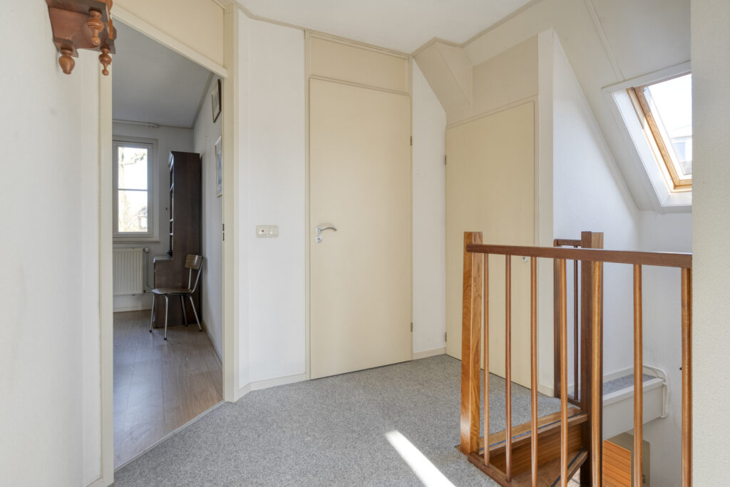 De overloop geeft toegang tot drie slaapkamers en de tweede badkamer. Eén van de slaapkamers is voorzien van een vaste kastenwand. De badkamer is uitgerust met een douche, wastafel en toilet.