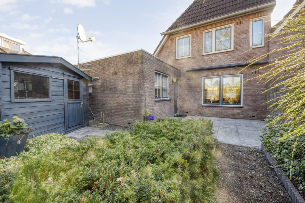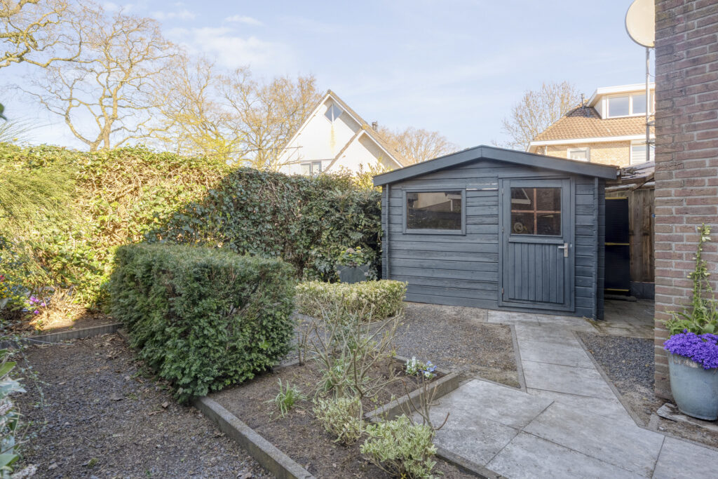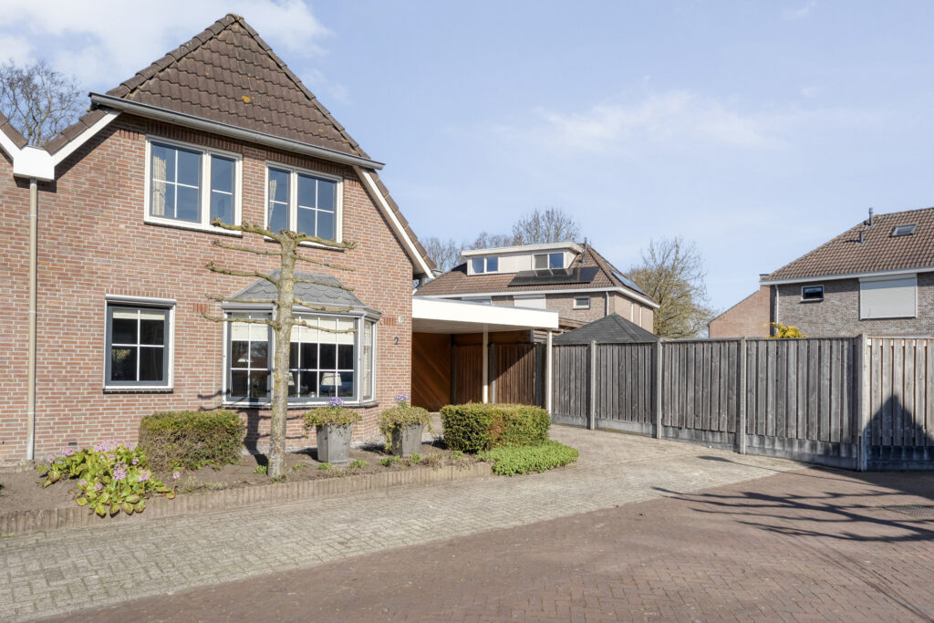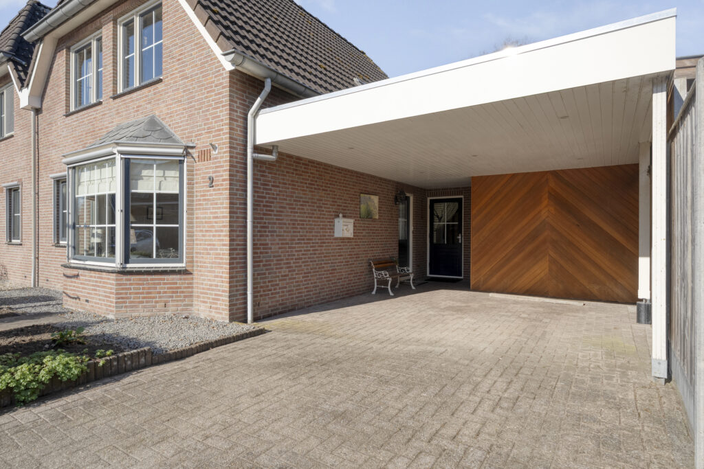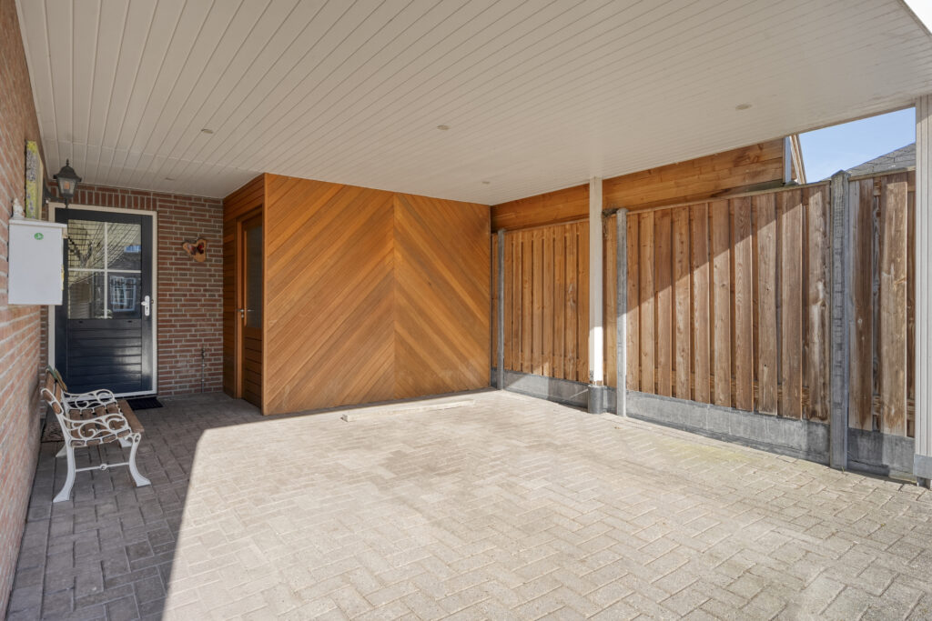 Aan de voorzijde van de woning bevindt zich een ruime oprit met plaats voor twee auto’s en een carport met aangebouwde berging. De achtertuin ligt op het zuiden en beschikt over een houten schuur en een zonnescherm aan de achtergevel.