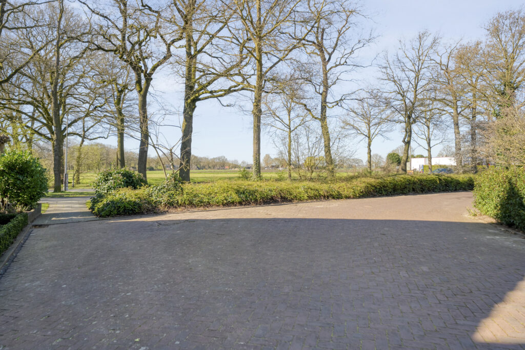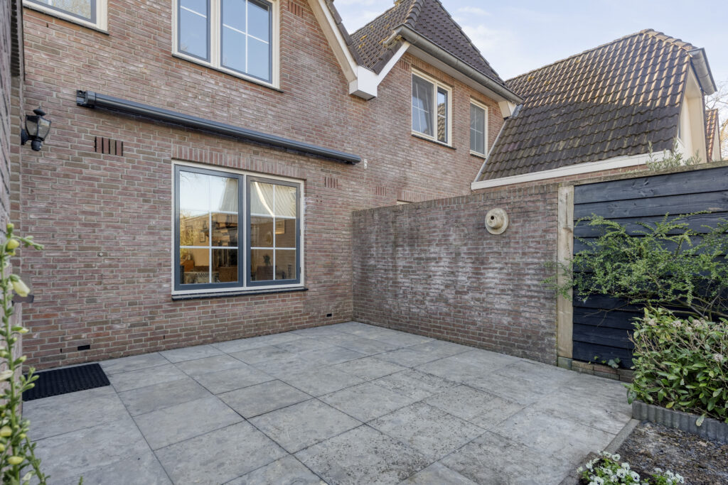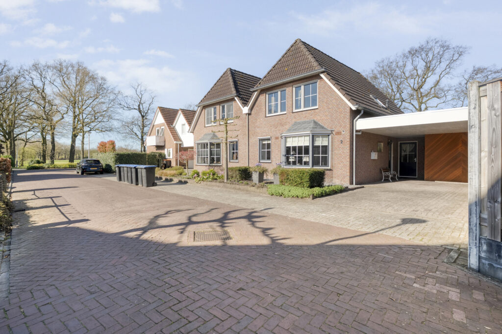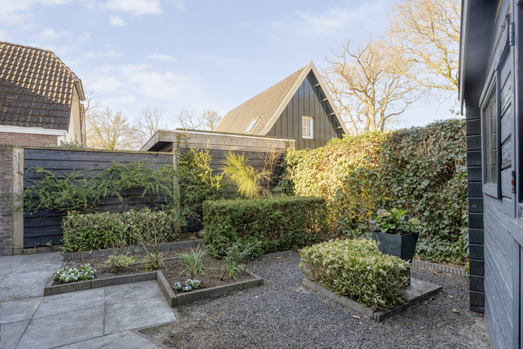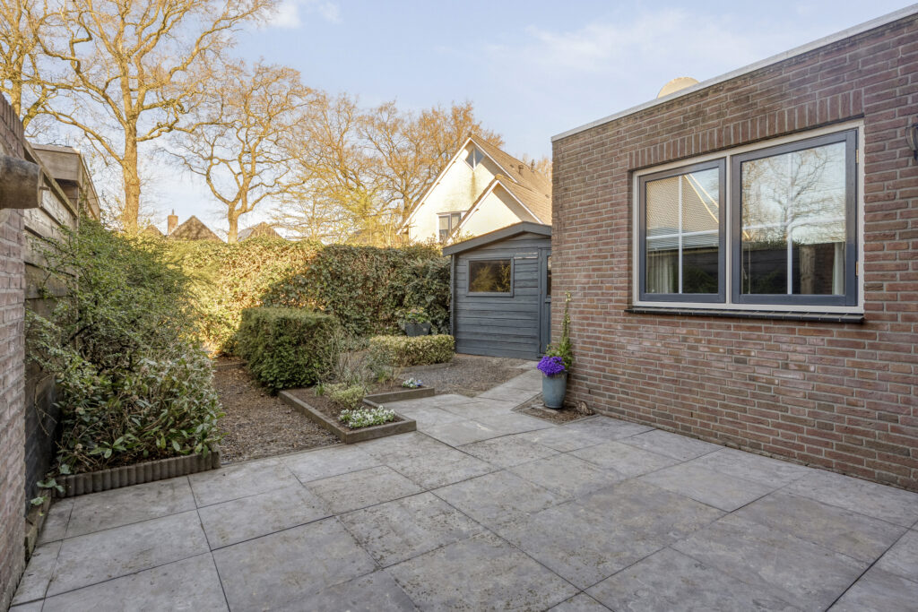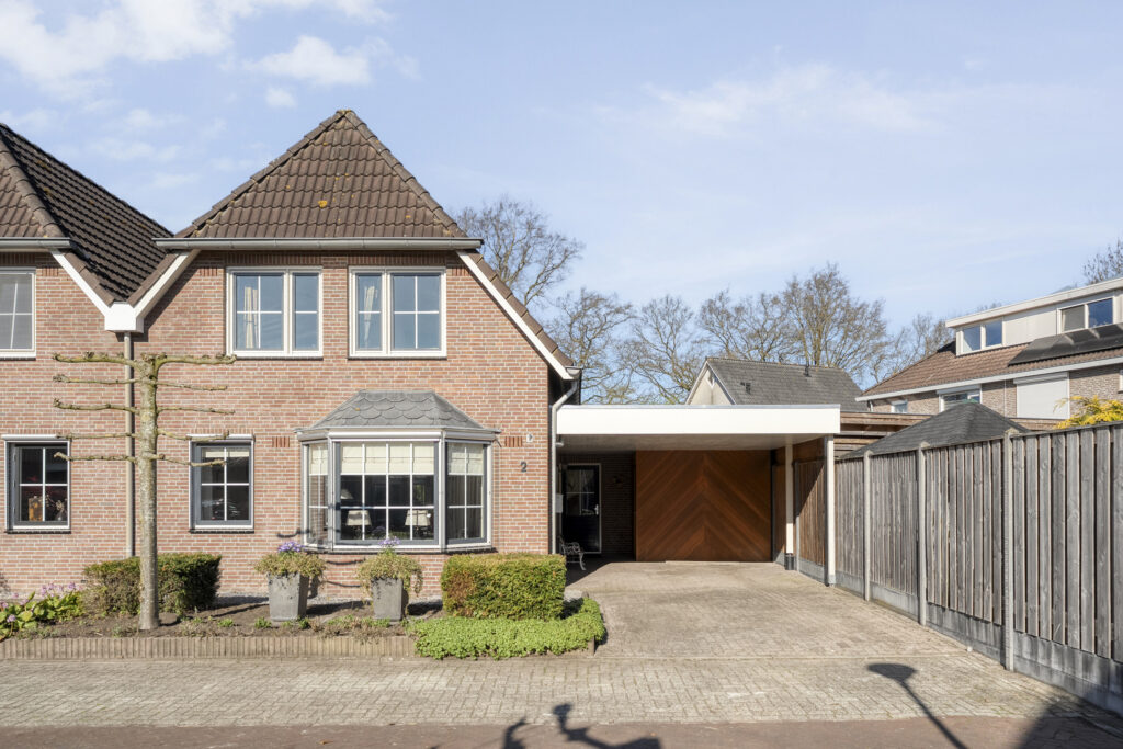 Aan de voorzijde van de woning bevindt zich een ruime oprit met plaats voor twee auto’s en een carport met aangebouwde berging. De achtertuin ligt op het zuiden en beschikt over een houten schuur en een zonnescherm aan de achtergevel.