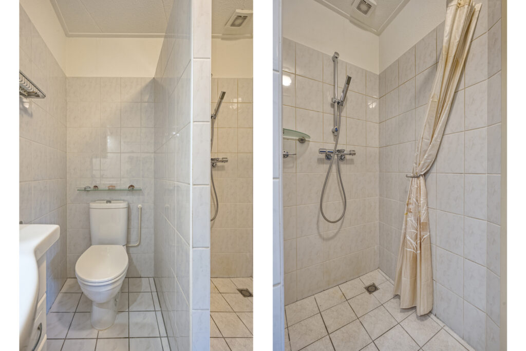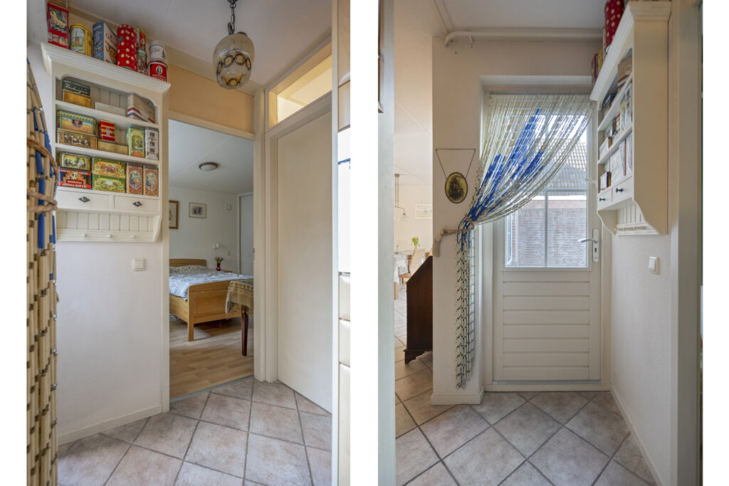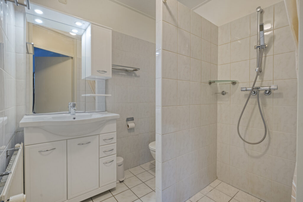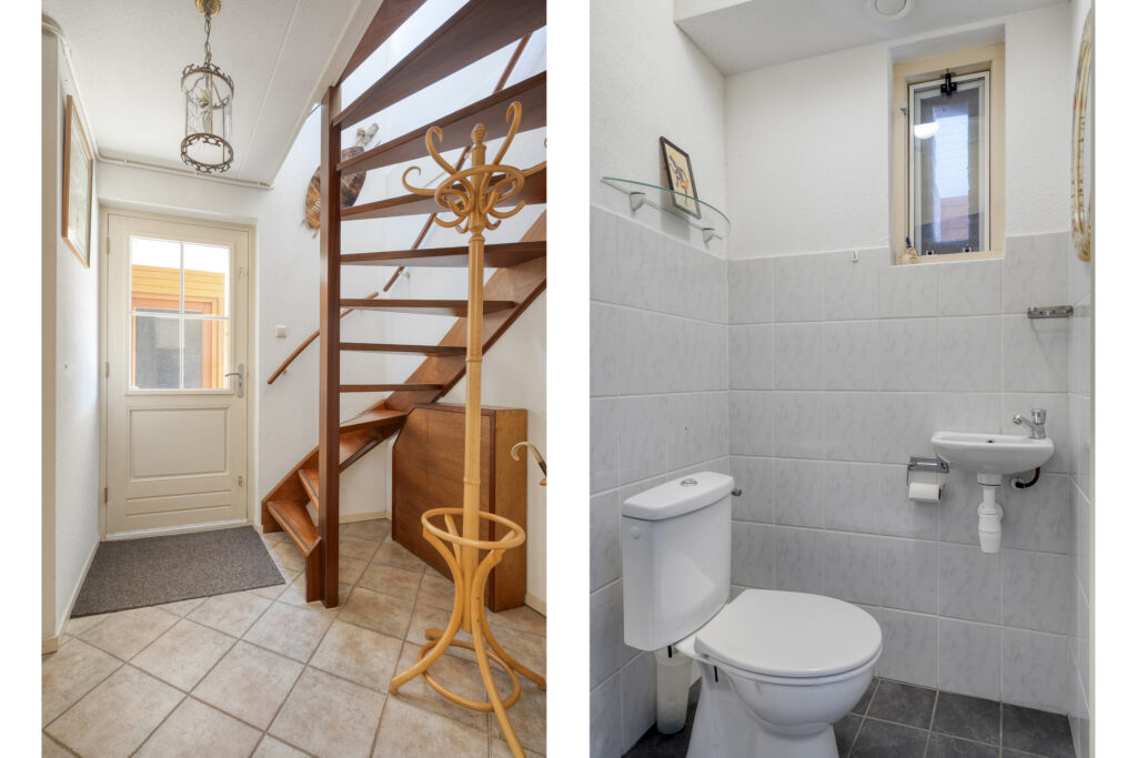 Via een hal aan de achterzijde bereik je de tuin, de bijkeuken en de slaapkamer met en-suite badkamer. De badkamer is ingericht met een douche, wastafelmeubel en toilet. De bijkeuken beschikt over een keukenblok met spoelbak, de cv-installatie en aansluitingen voor wasapparatuur.