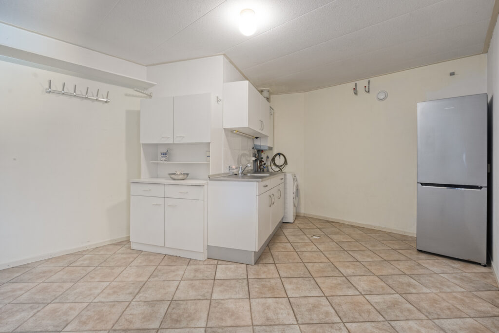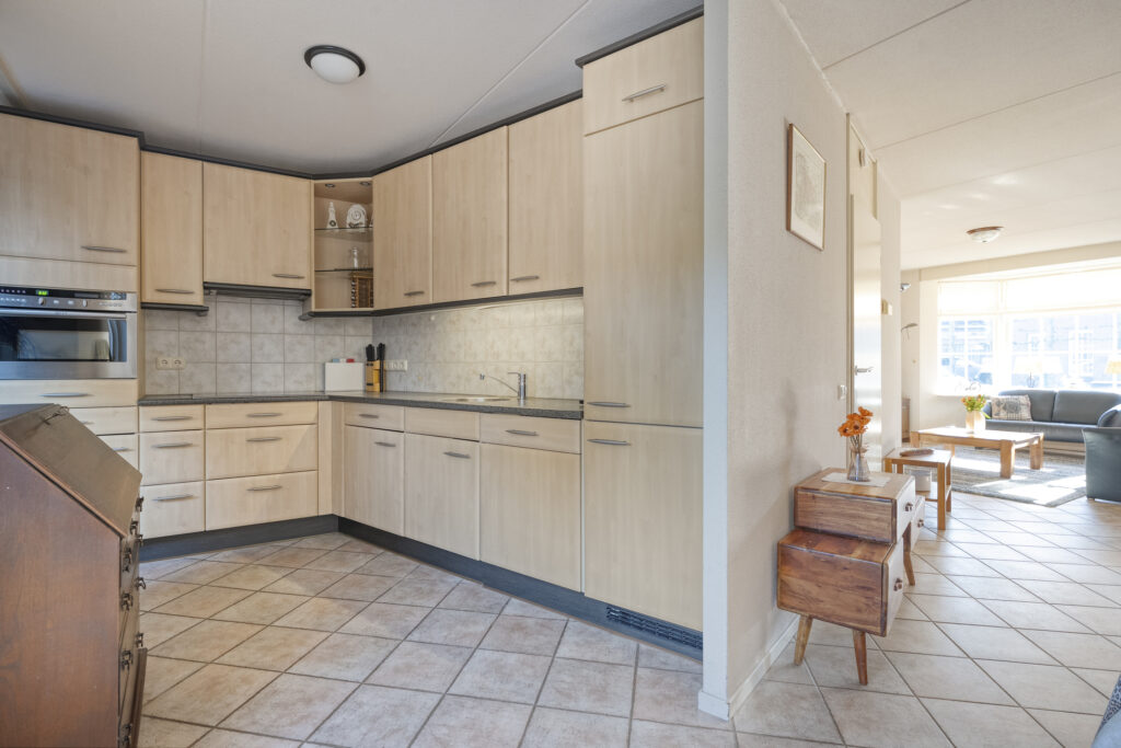 De keuken is aan de achterzijde gesitueerd en uitgevoerd in een hoekopstelling. Deze is voorzien van diverse inbouwapparatuur, waaronder een koelkast, vaatwasser, inductiekookplaat en een combi oven/magnetron. De woonkamer en keuken zijn beide voorzien van vloerverwarming.