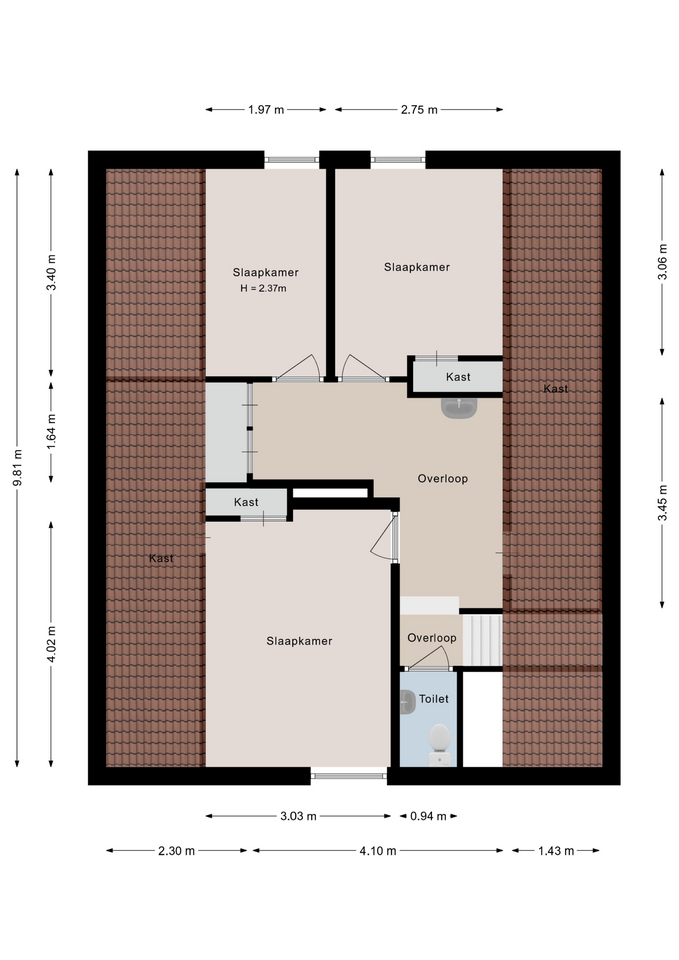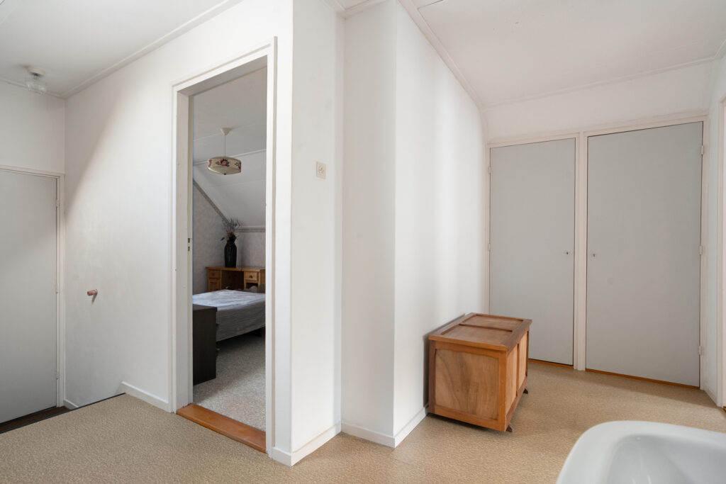 Eerste verdieping: Overloop met 2 vaste kasten, wastafel en toegang tot 3 slaapkamers en een apart toilet. Achter de knieschotten is er veel opbergruimte. Twee slaapkamers zijn voorzien van een vaste kast.