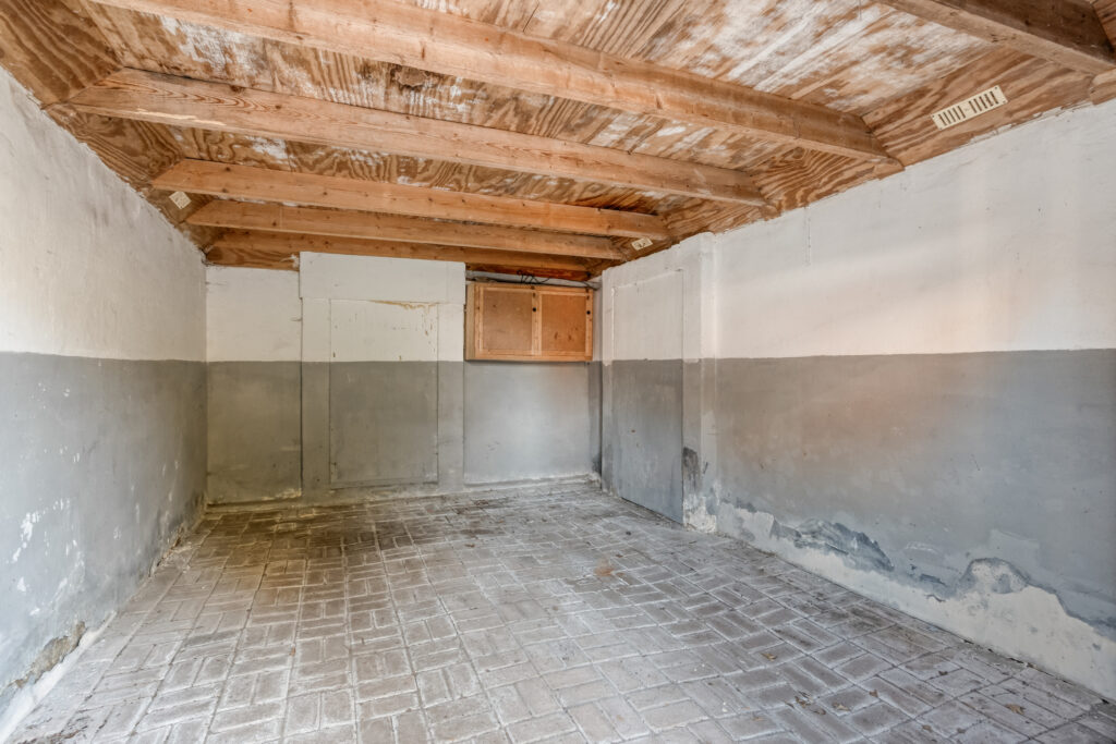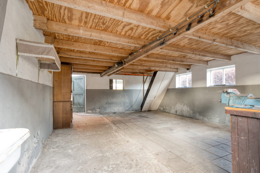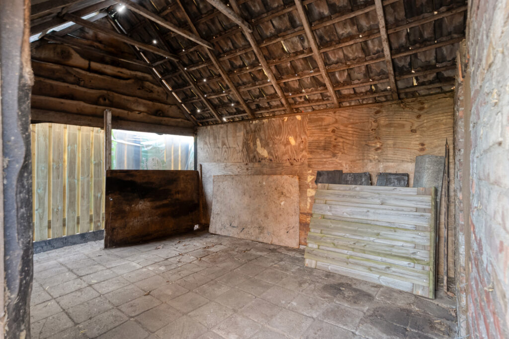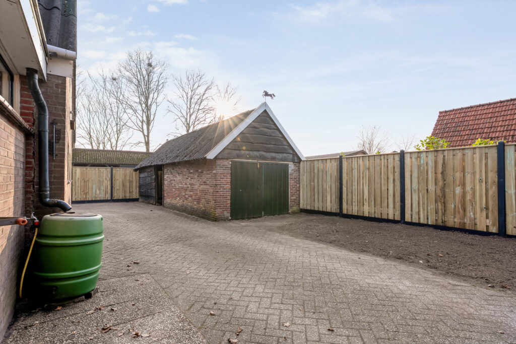 Buiten: Gelegen op een groot perceel met een vrijstaande stenen garage, (oude) stal met zolder, mestkelder en kapschuur. Het weiland leent zich uitstekend voor het houden van dieren of kleinvee.