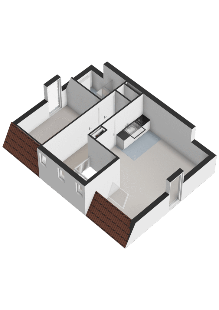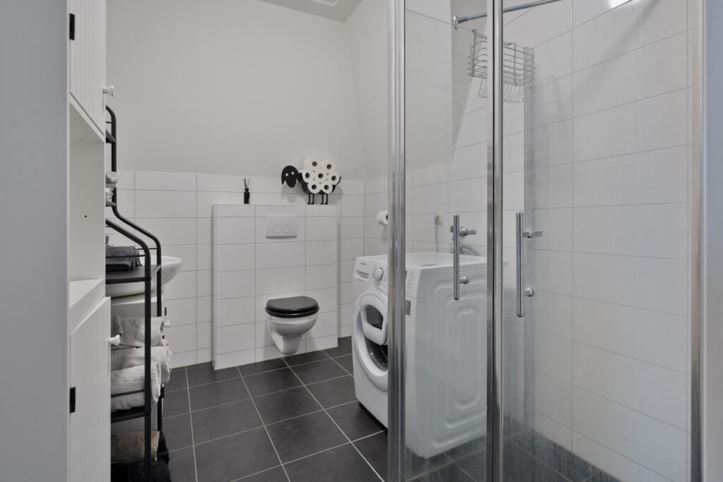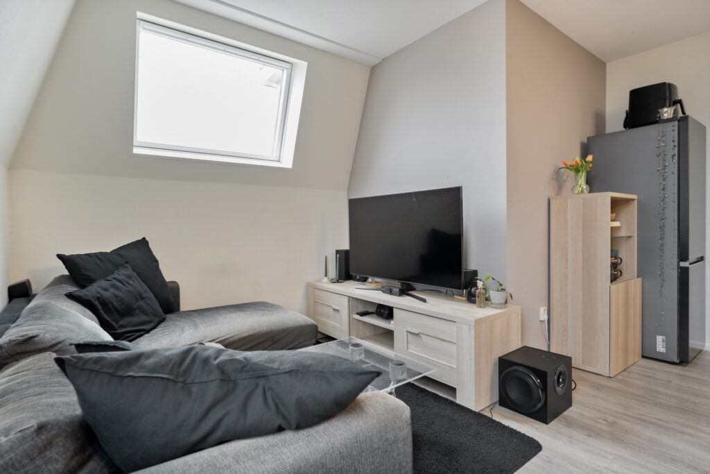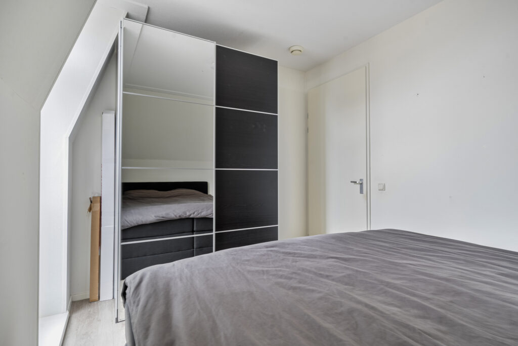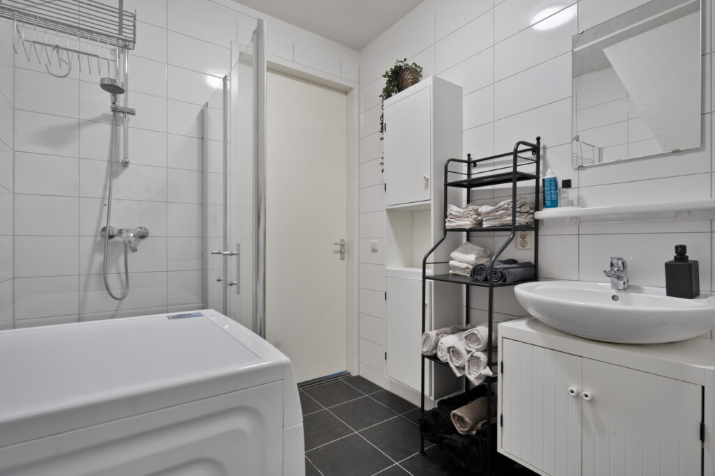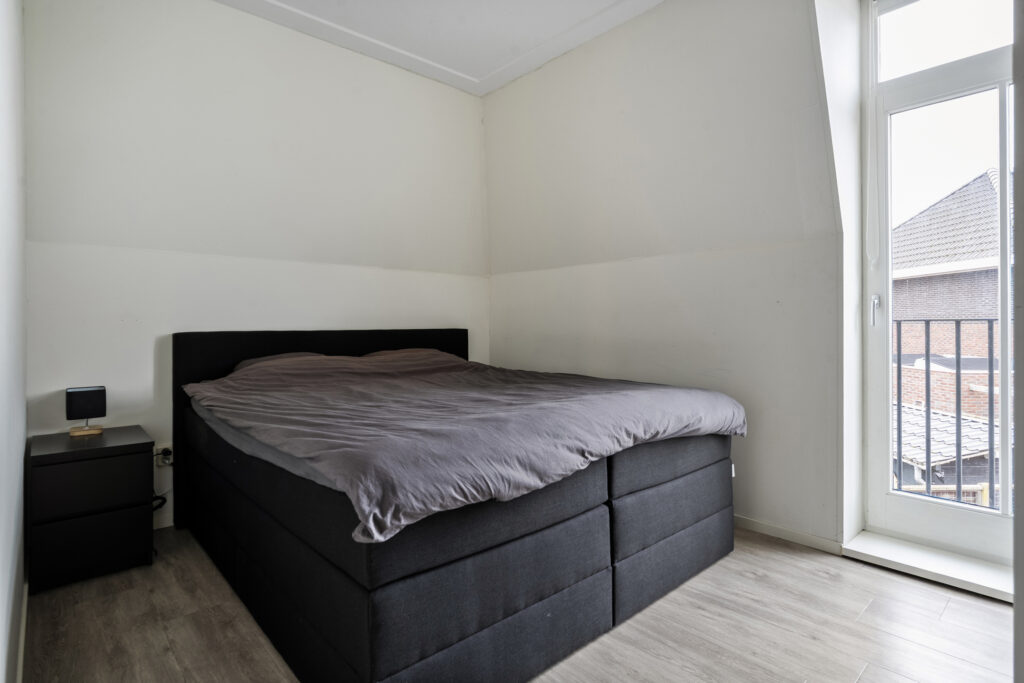 De slaapkamer is ruim opgezet en beschikt eveneens over een Frans balkon. Aangrenzend bevindt zich de badkamer, ingericht met een wandcloset, wastafel met spiegel en een douchehoek. Ook is hier de aansluiting voor de wasmachine aanwezig.