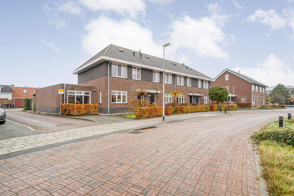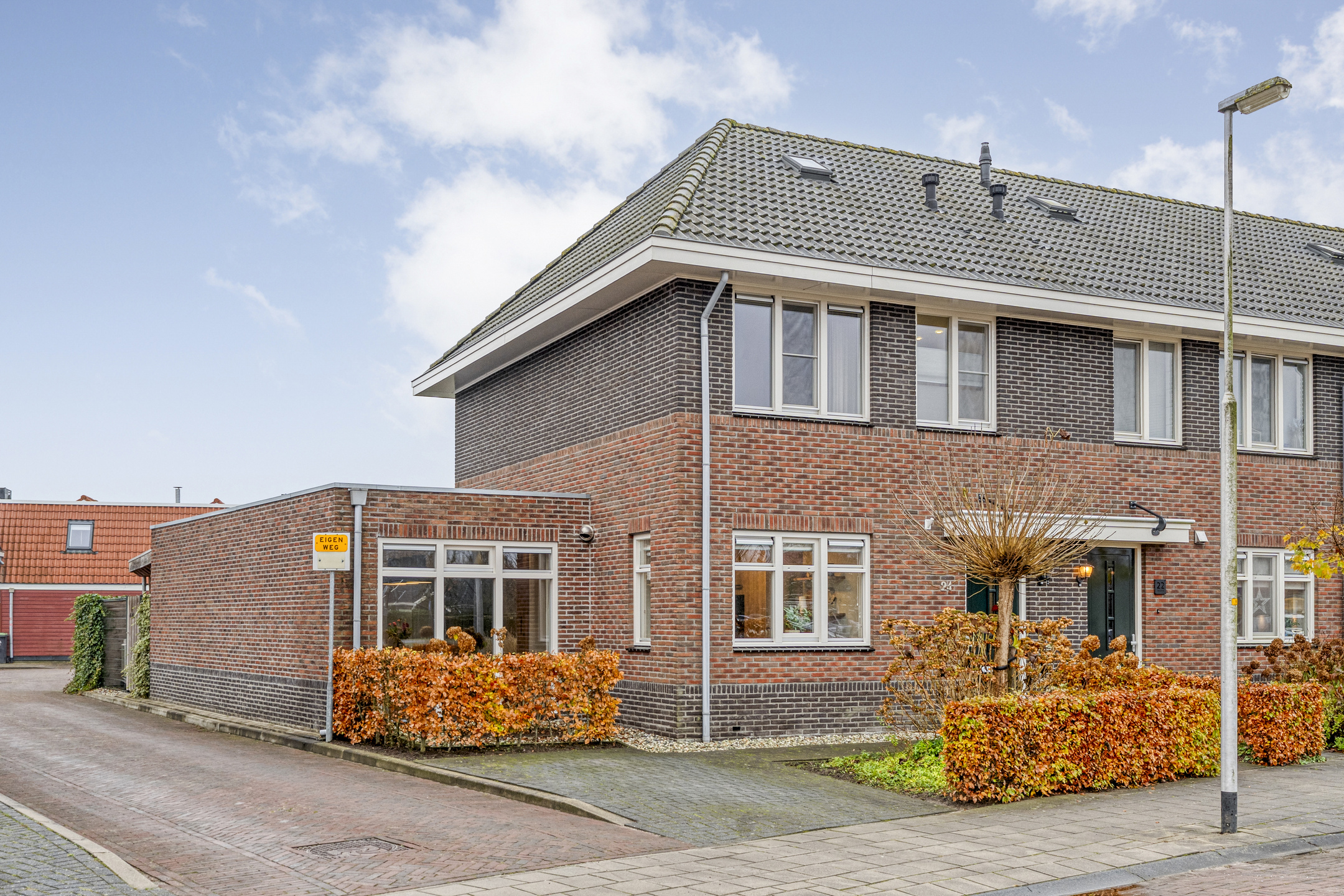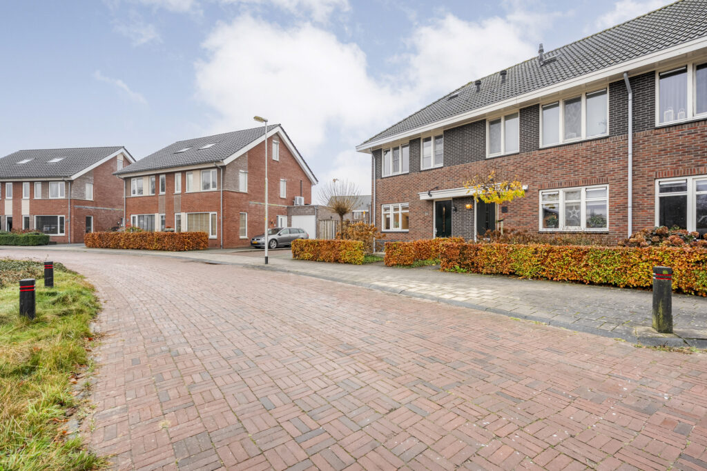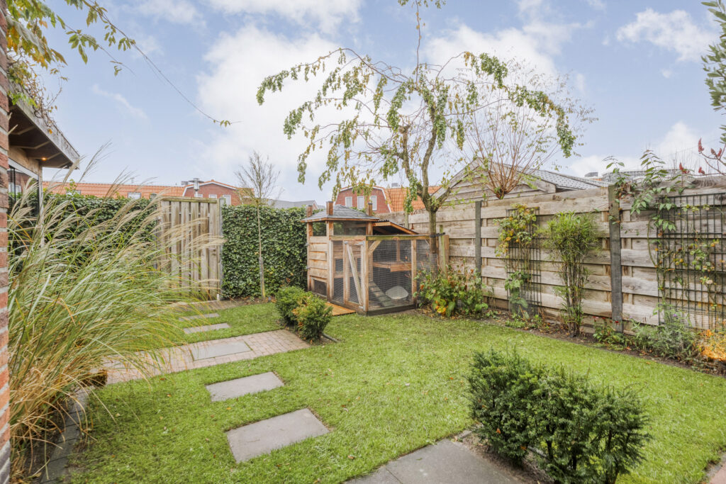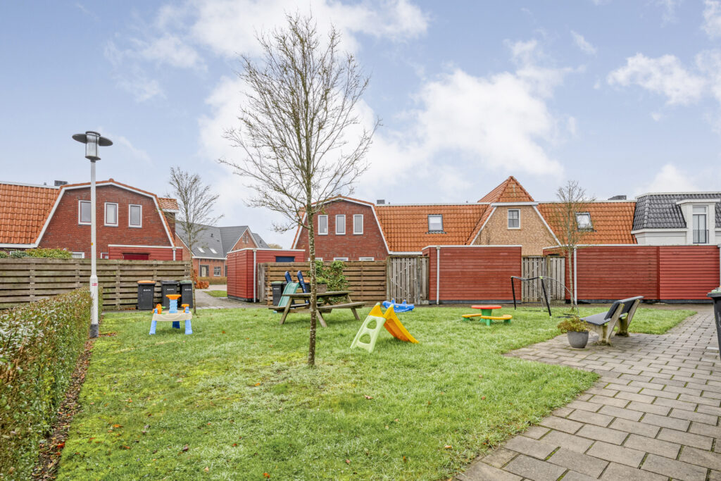 Buiten: voor de woning ligt een keurige tuin met ruimte om een auto te parkeren. De achtertuin is keurig onderhouden en voorzien van een gazon, diverse beplanting en een fraai serre die middels glazen schuifwanden af te sluiten is. Achter de woning is een gezamenlijk terrein gelegen met diverse parkeerplekken en een speeltuin.
