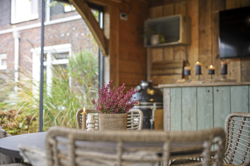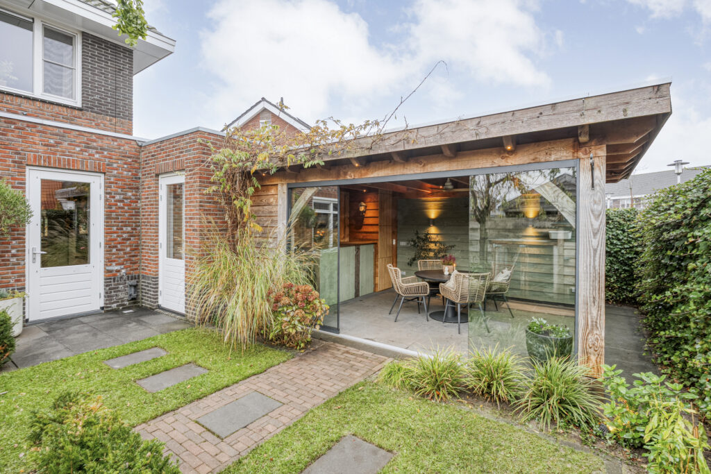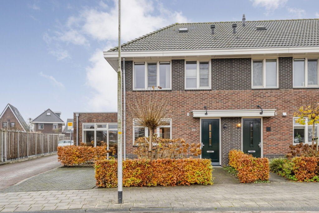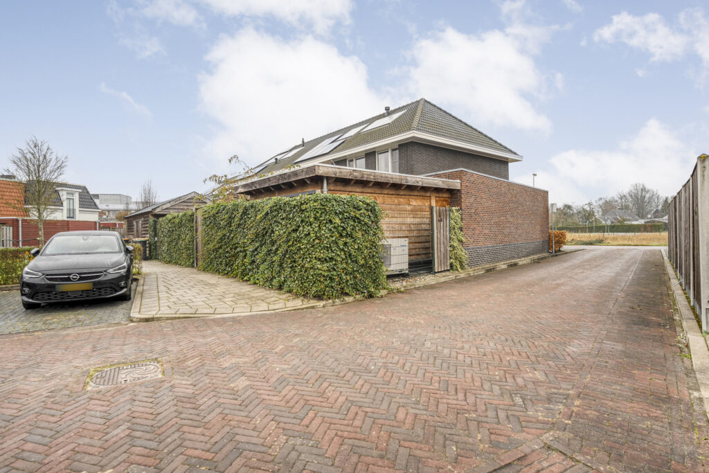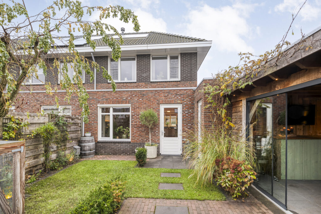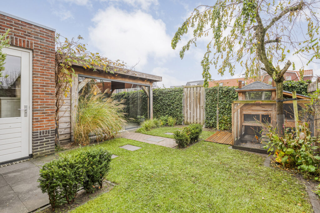Buiten: voor de woning ligt een keurige tuin met ruimte om een auto te parkeren. De achtertuin is keurig onderhouden en voorzien van een gazon, diverse beplanting en een fraai serre die middels glazen schuifwanden af te sluiten is. Achter de woning is een gezamenlijk terrein gelegen met diverse parkeerplekken en een speeltuin.