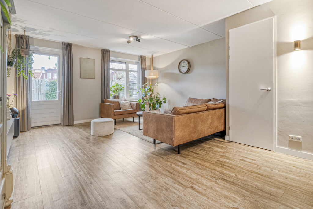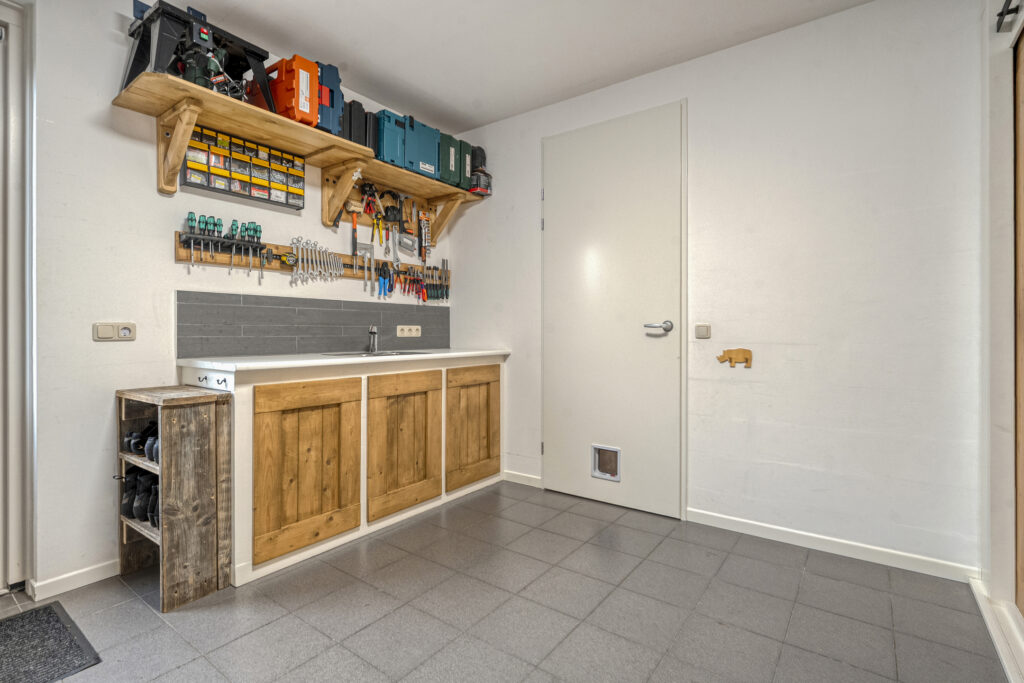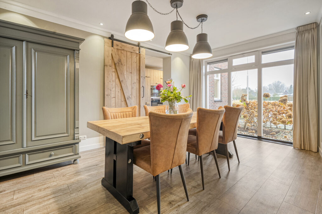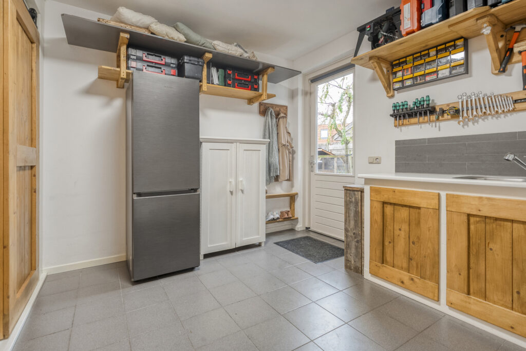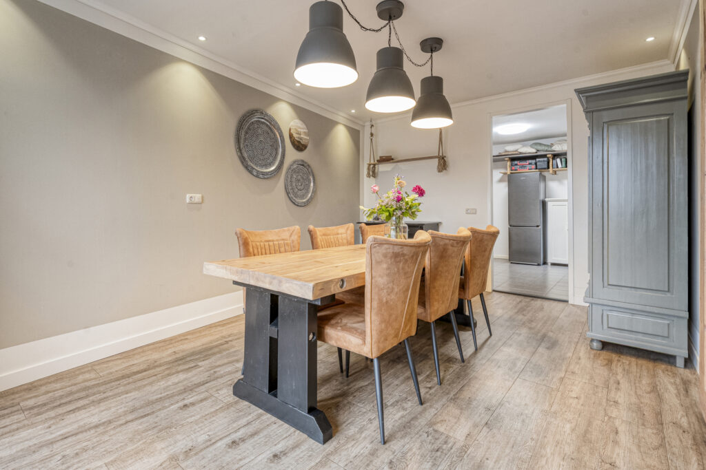 Begane grond: Entree/hal met toilet, meterkast en trapopgang naar de eerste verdieping. Vanuit de hal kom je in de ruime woonkamer, waar het zitgedeelte zich aan de achterzijde van de woning bevindt. De woonkamer is aangenaam licht en biedt toegang tot de achtertuin. De keuken bevindt zich aan de voorzijde, waar een fraaie keukenopstelling in U-vorm is geplaatst. Deze keukenopstelling beschikt over een inductiekookplaat, magnetron, oven, koel-vriescombinatie en een vaatwasmachine. Vanuit de keuken kom je verder in de riante eetkamer, waar volop ruimte is voor een grote eettafel. Je kunt deze ruimte ook uitstekend gebruiken als thuiswerkplek. De aangrenzende bijkeuken is een mooie toevoeging aan het geheel en biedt veel praktische bergruimte. Hier zijn tevens een aanrecht en een inbouwkast geplaatst.