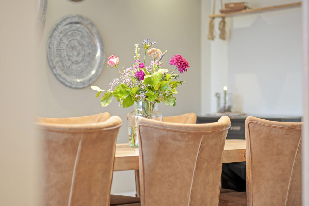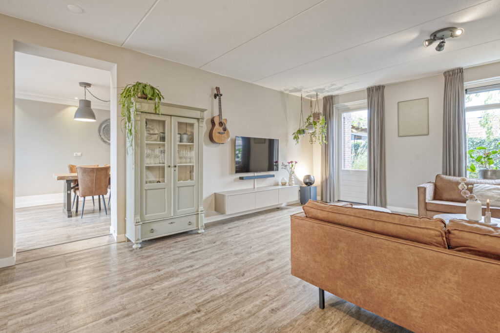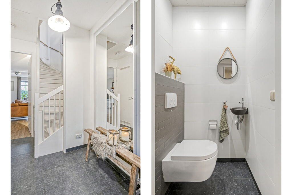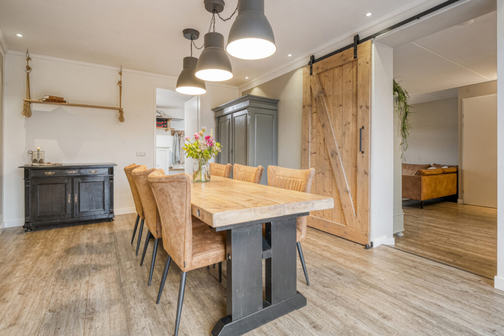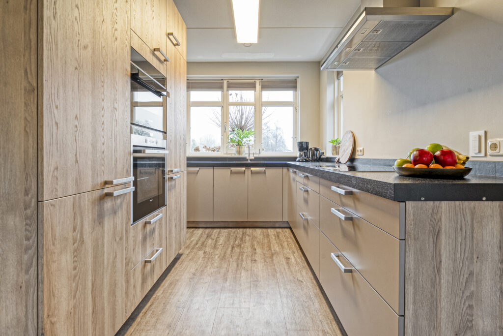 Begane grond: Entree/hal met toilet, meterkast en trapopgang naar de eerste verdieping. Vanuit de hal kom je in de ruime woonkamer, waar het zitgedeelte zich aan de achterzijde van de woning bevindt. De woonkamer is aangenaam licht en biedt toegang tot de achtertuin. De keuken bevindt zich aan de voorzijde, waar een fraaie keukenopstelling in U-vorm is geplaatst. Deze keukenopstelling beschikt over een inductiekookplaat, magnetron, oven, koel-vriescombinatie en een vaatwasmachine. Vanuit de keuken kom je verder in de riante eetkamer, waar volop ruimte is voor een grote eettafel. Je kunt deze ruimte ook uitstekend gebruiken als thuiswerkplek. De aangrenzende bijkeuken is een mooie toevoeging aan het geheel en biedt veel praktische bergruimte. Hier zijn tevens een aanrecht en een inbouwkast geplaatst.