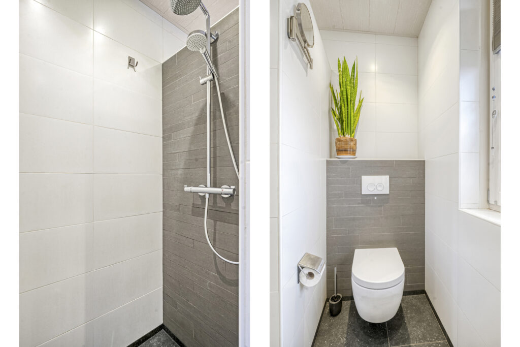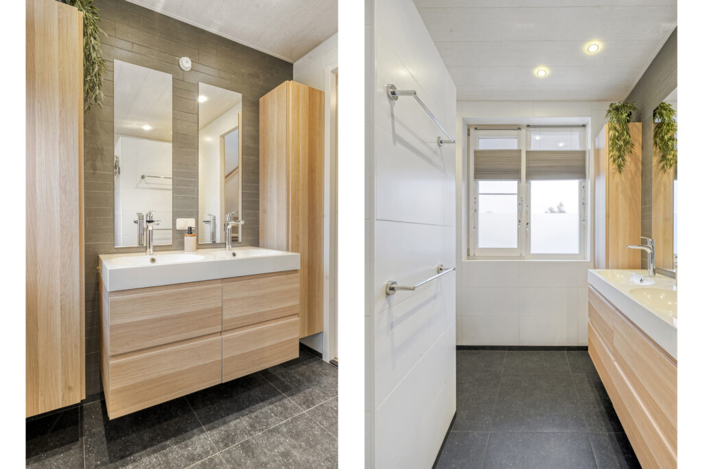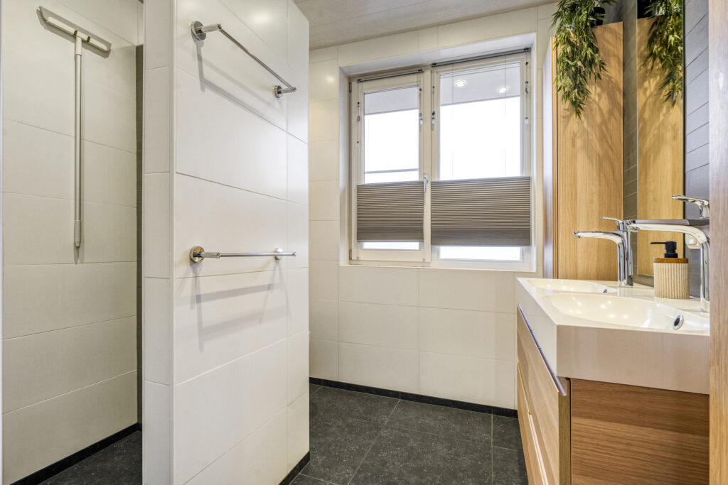 Eerste verdieping: vanaf de overloop is er toegang tot een drietal fijne slaapkamers en een nette badkamer. In de badkamer heb je de beschikking over een inloopdouche, toilet en een wastafelmeubel met dubbele wastafels.