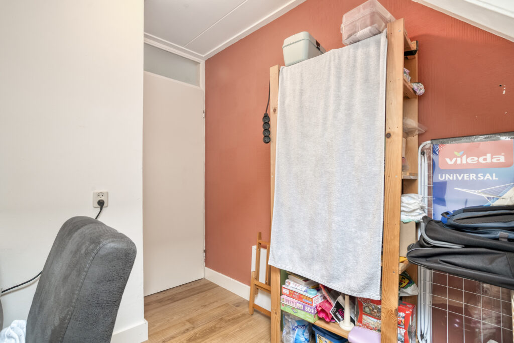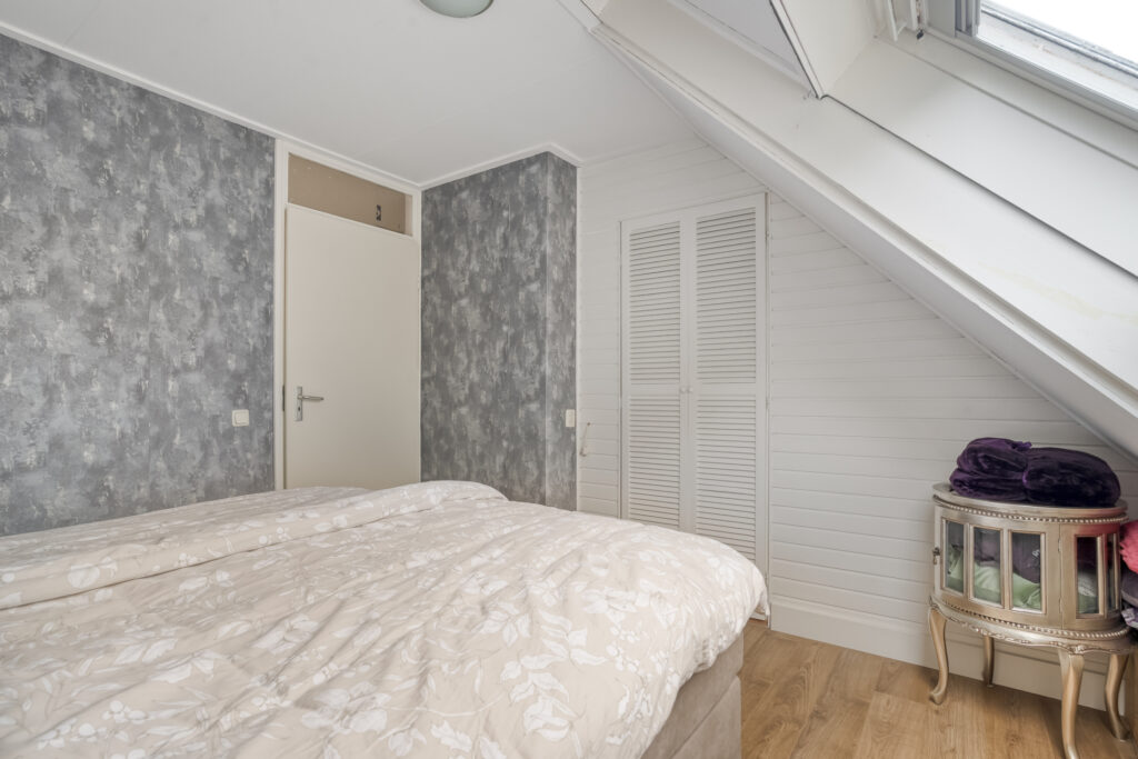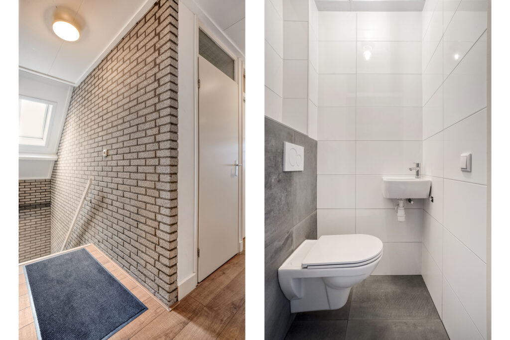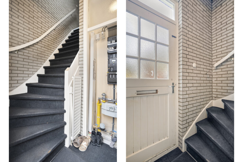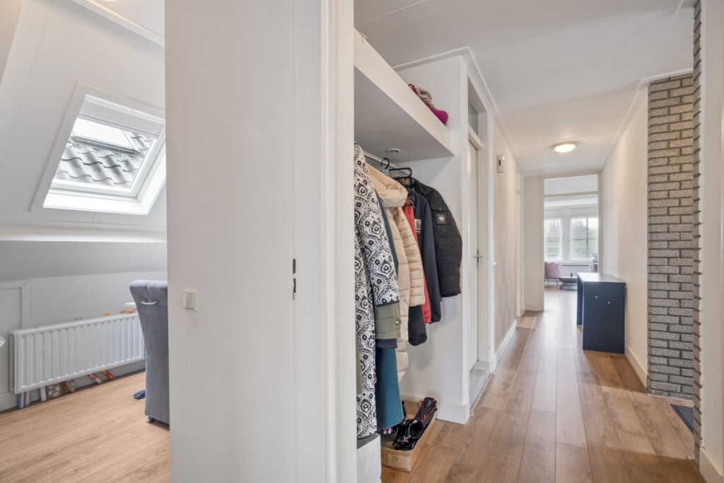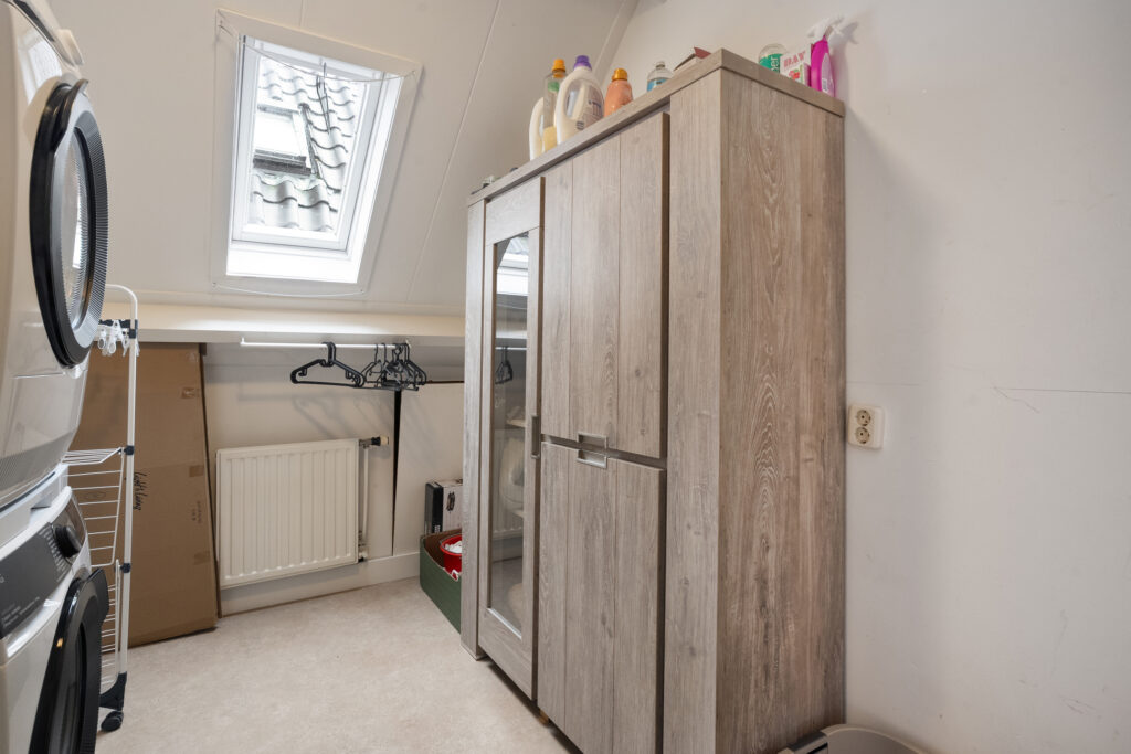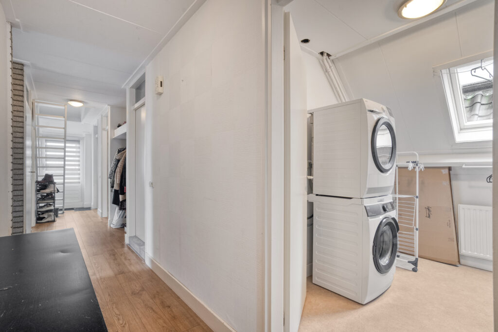 Bovenwoning: Entree op de begane grond met meterkast en middels een trap toegang tot de bovenwoning. Binnengekomen in de hal tref je een toiletruimte en een garderobe aan. Aan het einde van de hal is er toegang tot de ruime woonkamer, die dankzij de dakkapel en de grote dakramen aangenaam licht is. Middels een open doorgang is de keuken te bereiken, waar een nette keukenopstelling in hoekvorm is gesitueerd. Deze keuken beschikt over een gasfornuis met oven, magnetron, koelkast en vaatwasser. Terug in de hal is er verder toegang tot een drietal slaapkamers, de badkamer, bijkeuken en het balkon. Eén slaapkamer beschikt over een vaste kast en in de badkamer tref je een breed wastafelmeubel en een inloopdouche aan. In de bijkeuken zijn de witgoedaansluitingen te vinden.