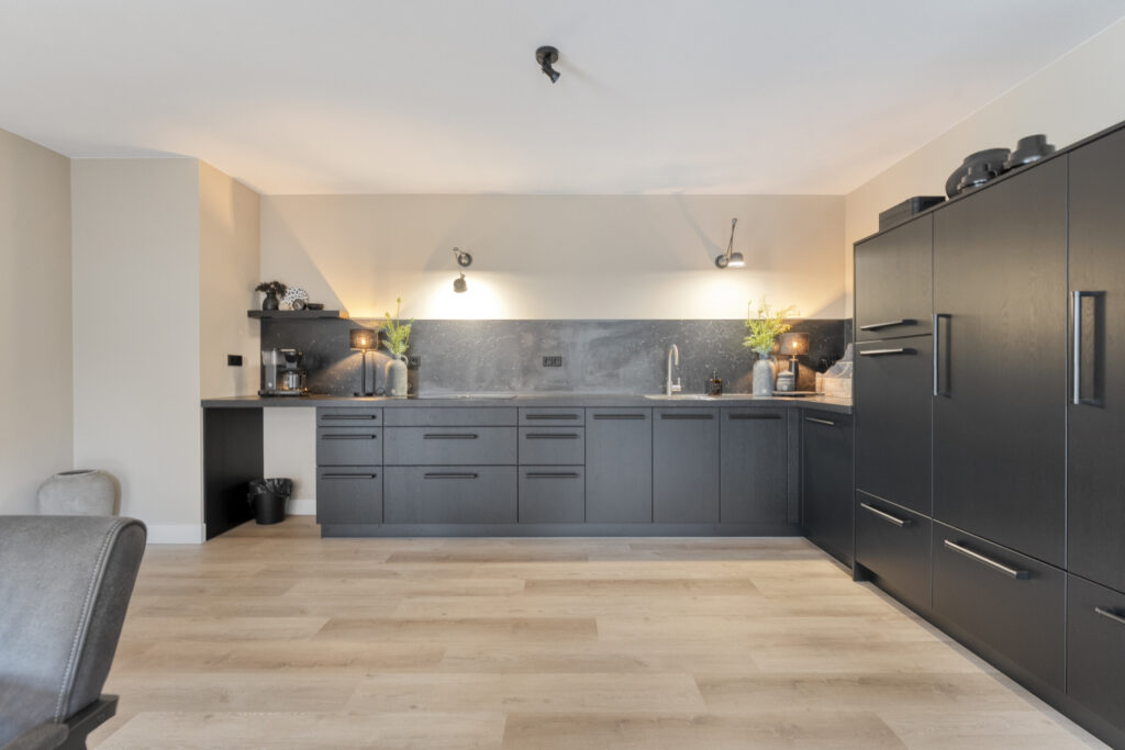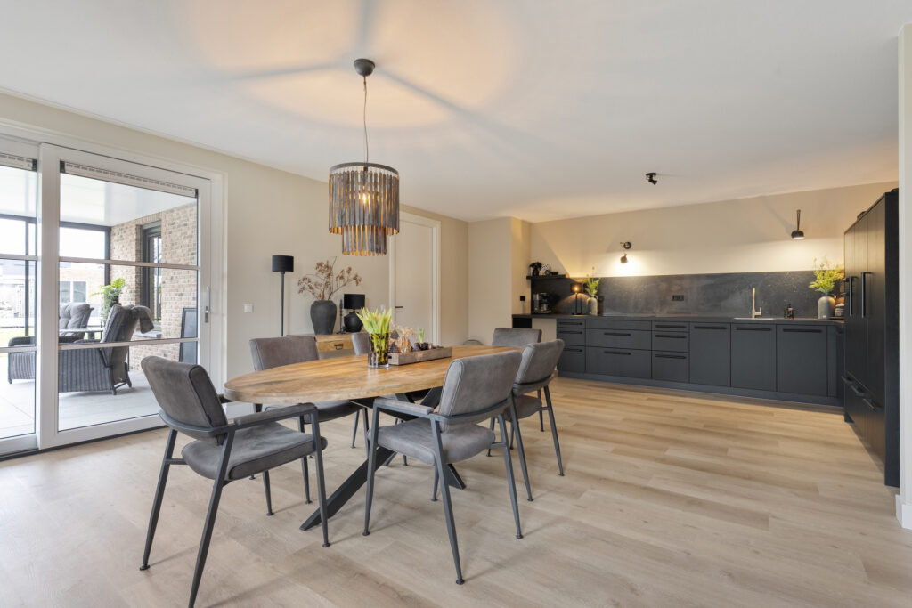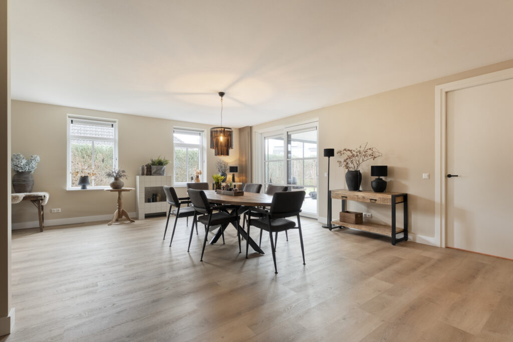 Begane grond: via de royale oprit toegang tot de overdekte entree aan de zijkant van de woning. Binnenkomst in een ruime hal met fraaie plavuizenvloer en stijlvolle trap. Verder tref je hier de meterkast en het toilet met fonteintje aan en er is toegang tot de woonkamer en het kantoor. De woonkamer ademt ruimte en licht, mede dankzij de stijlvolle afwerking en de grote raampartijen rondom. Ondanks de grootte geeft de woonkamer een gezellig en behaaglijk gevoel doordat er in het plafond akoestische panelen zijn verwerkt die weerkaatsing van geluid tegengaan. Aan de achterzijde is er volop ruimte voor een gezellig eetgedeelte waar je een grote eettafel kwijt kunt. Ook hier aangenaam veel licht en via de brede schuifpui is er toegang tot de fraaie serre. Al in het vroege voorjaar kun je hier heerlijk zitten. Vanuit het eetgedeelte is de royale keuken te bereiken die net als de woning nagenoeg ongebruikt is. De L-vormige keukenopstelling in stijlvol zwart is voorzien van een grote inbouwkoelkast, vaatwasser op inpakhoogte en een inductiekookplaat met ingebouwde afzuiging. Om de keuken en het sanitair mooi strak te houden is er een waterontharder aanwezig in de woning.