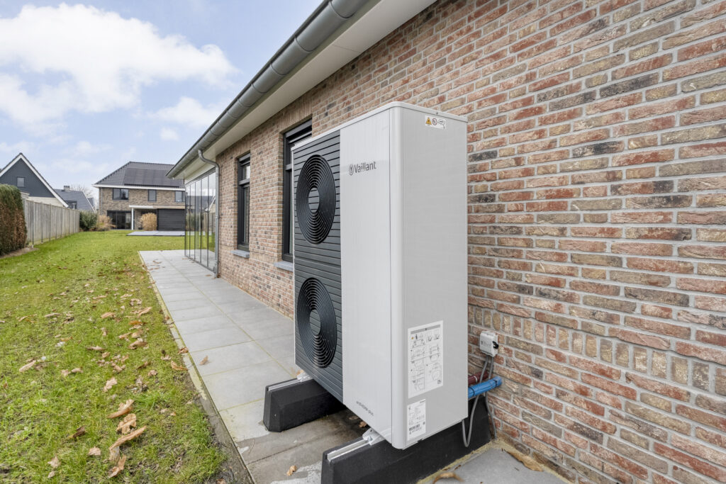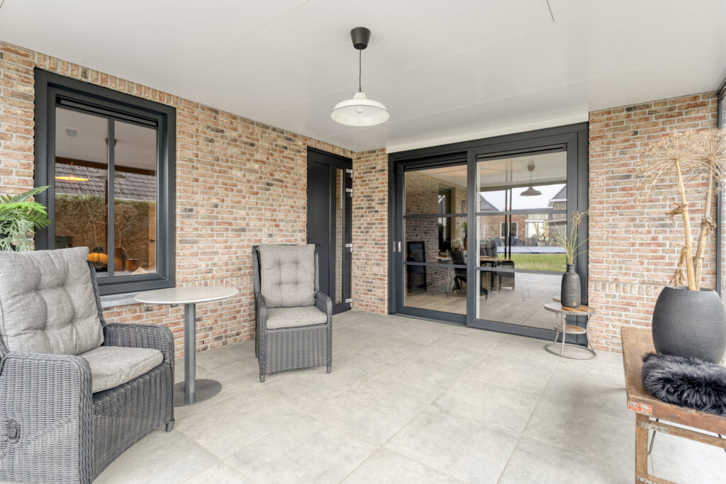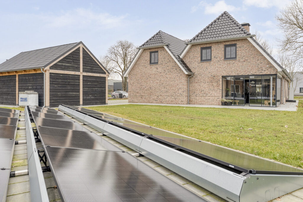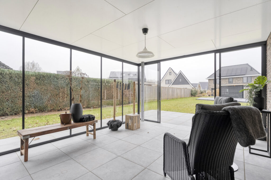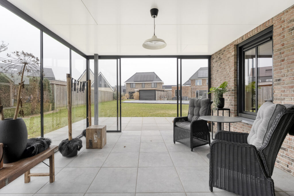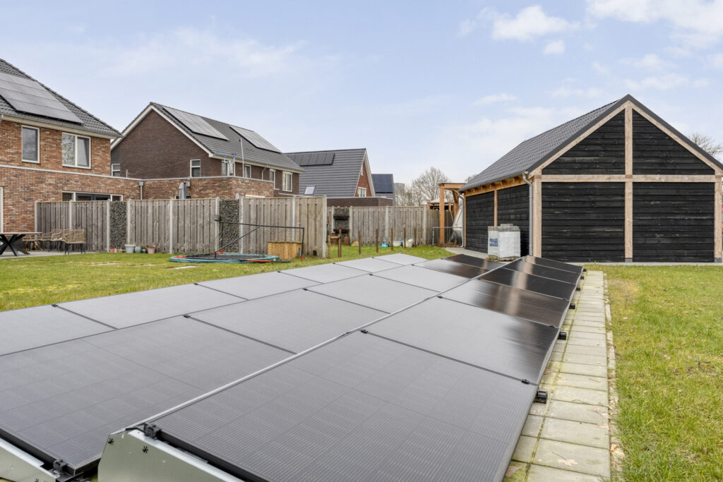 Direct achter de woning ligt een terras in het verlengde van de serre en naast de woning staat de buitenunit van de warmtepompinstallatie. Achter de woning ligt een groot gazon met daarin de zonnepanelen. Eventueel kunnen deze zonnepanelen op het dak worden geplaatst. Het gazon biedt nog allerlei mogelijkheden voor eigen invulling.