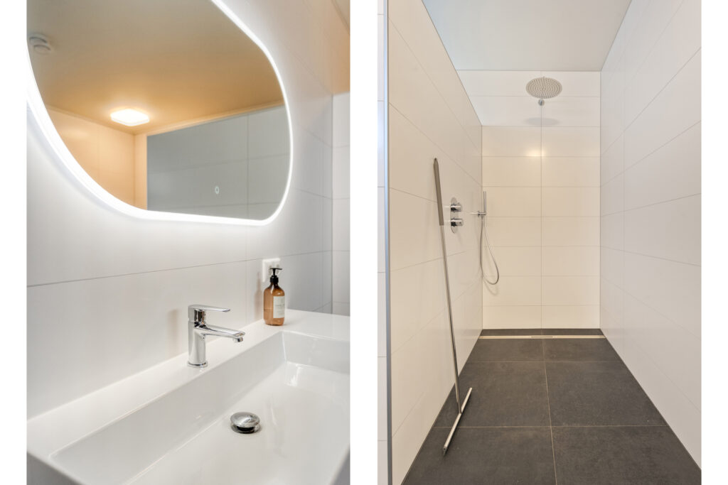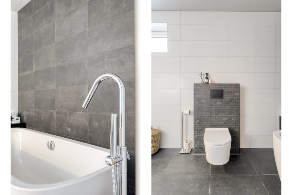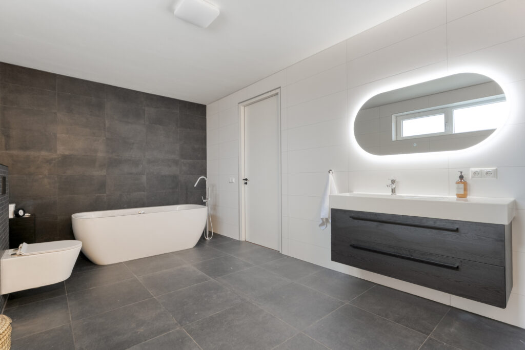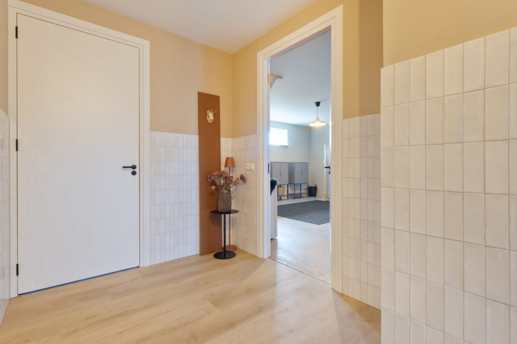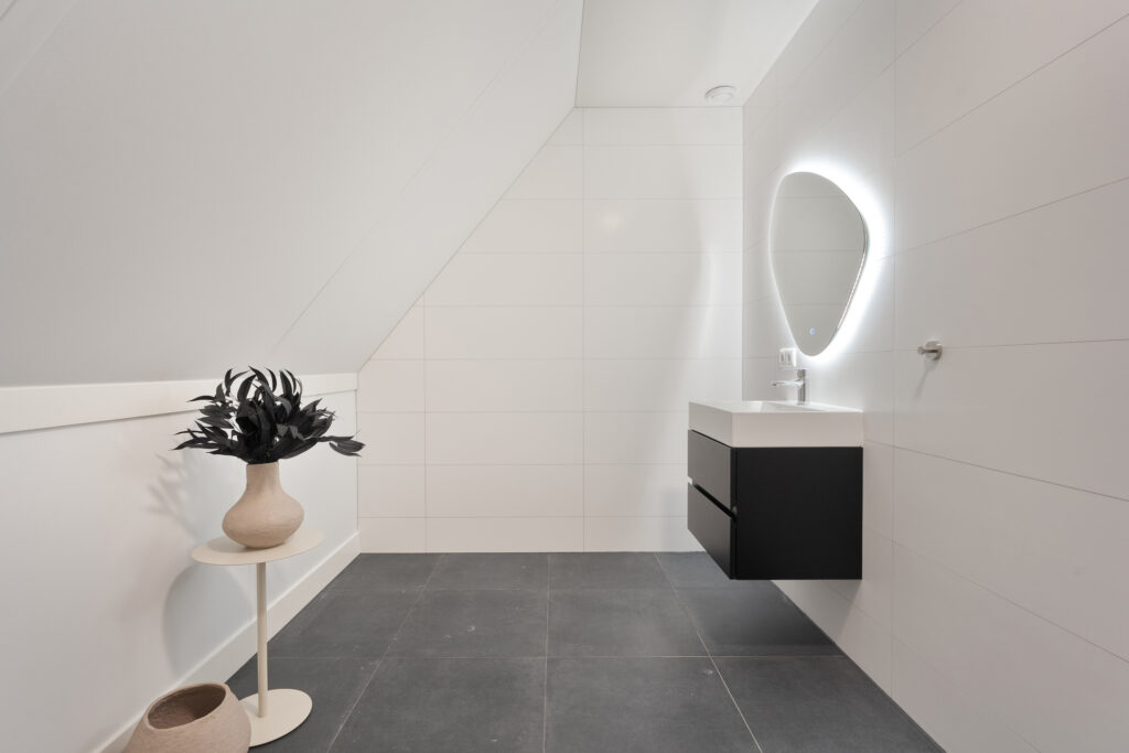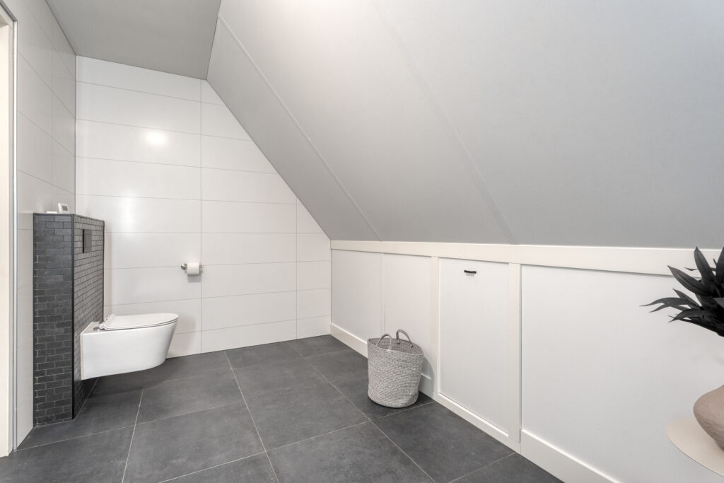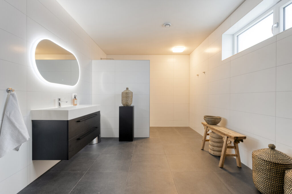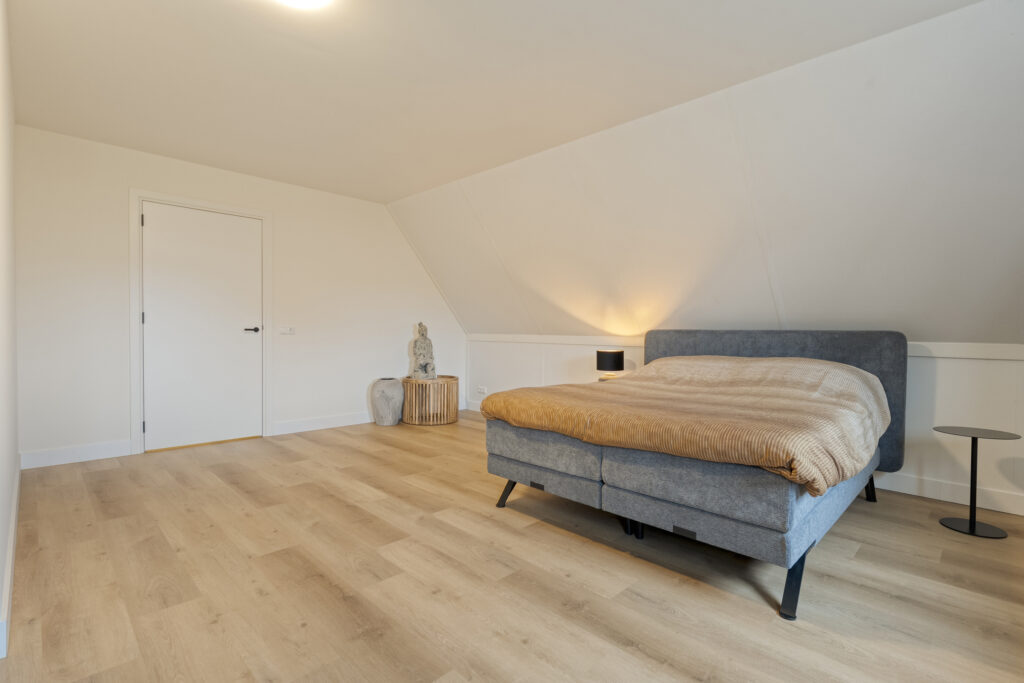 Vanuit de keuken kom je in de hal aan de achterzijde. Hiervandaan is een royale slaapkamer, evenzo royale badkamer en een praktische berging annex bijkeuken te bereiken. Dankzij de slaap- en badkamer op de begane grond kun je hier gelijkvloers wonen en slapen. Net als de rest van de woning zijn deze vertrekken voorzien van vloerverwarming. In de badkamer tref je een fraai vrijstaand bad aan, evenals een breed wastafelmeubel, toilet en een inloopdouche.