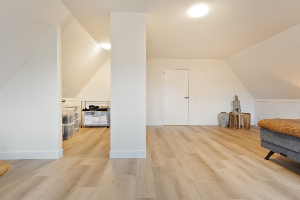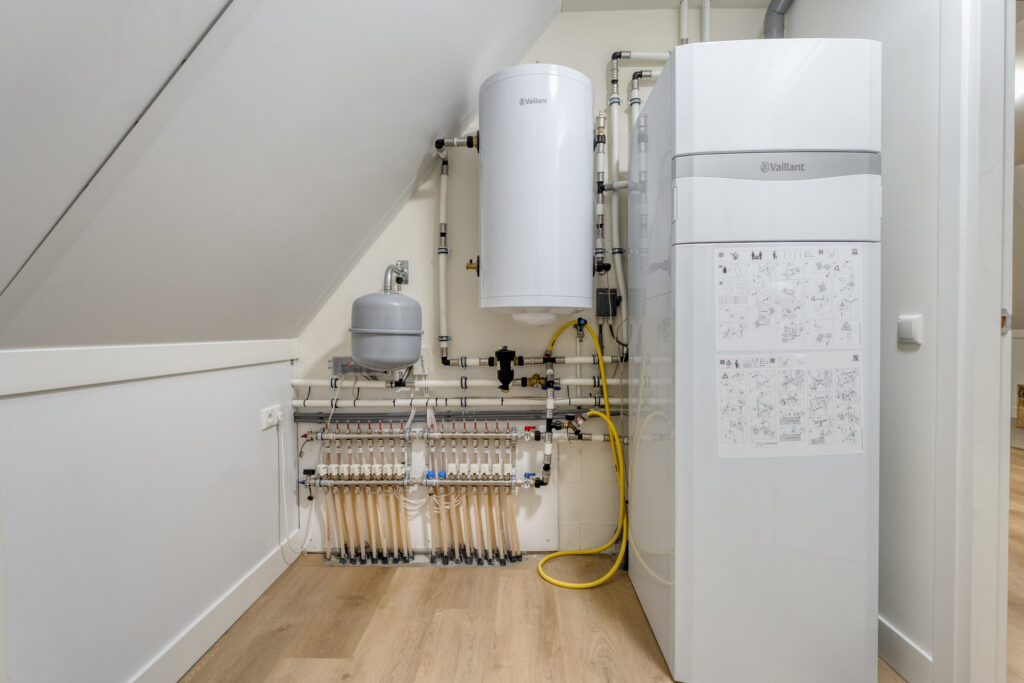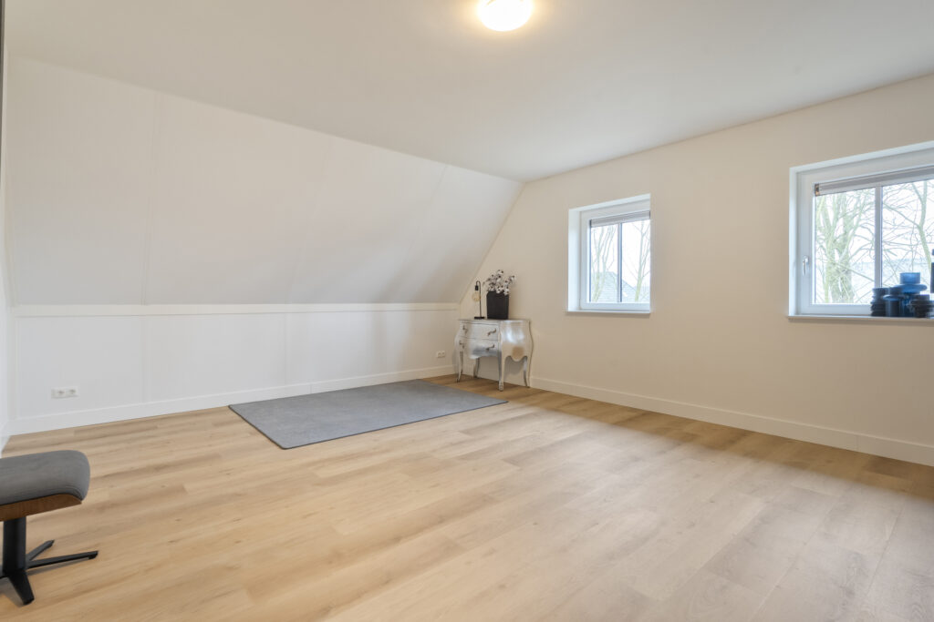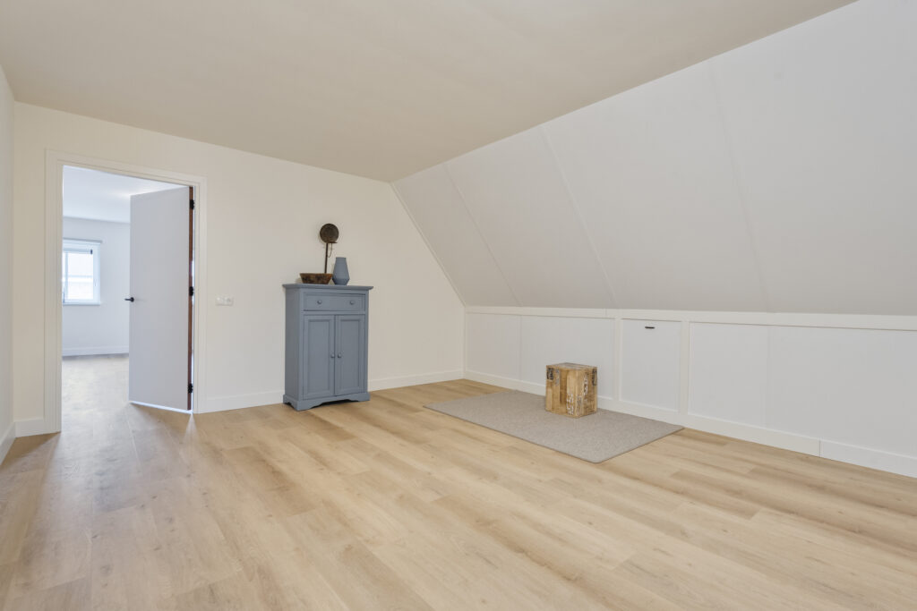 Eerste verdieping: vanaf de trap kom je op een grote overloop vanwaar er toegang is tot twee slaapkamers aan weerszijden en een berging en badkamer daartussenin. Mocht je meer slaapkamers nodig hebben, dan kun je beide kamers relatief eenvoudig opdelen. Verder beschikt één van de kamers over een inloopkast. In de badkamer is een toilet en wastafel aanwezig en er is de mogelijkheid om hier een douchecabine te plaatsen. De berging huisvest de technische installaties van de woning. Daarnaast is er vanaf de overloop middels een vlizotrap toegang tot een praktische vliering.