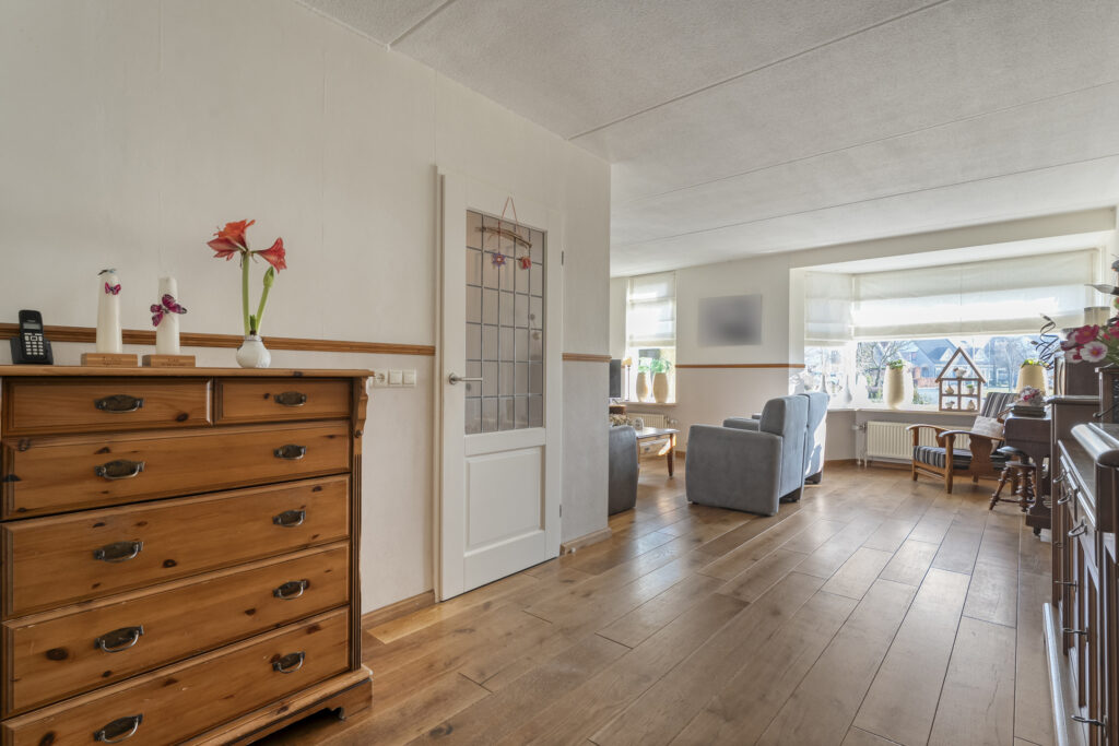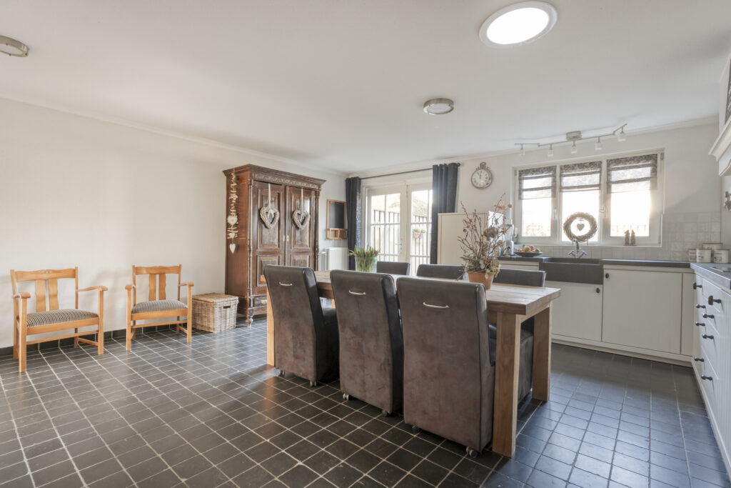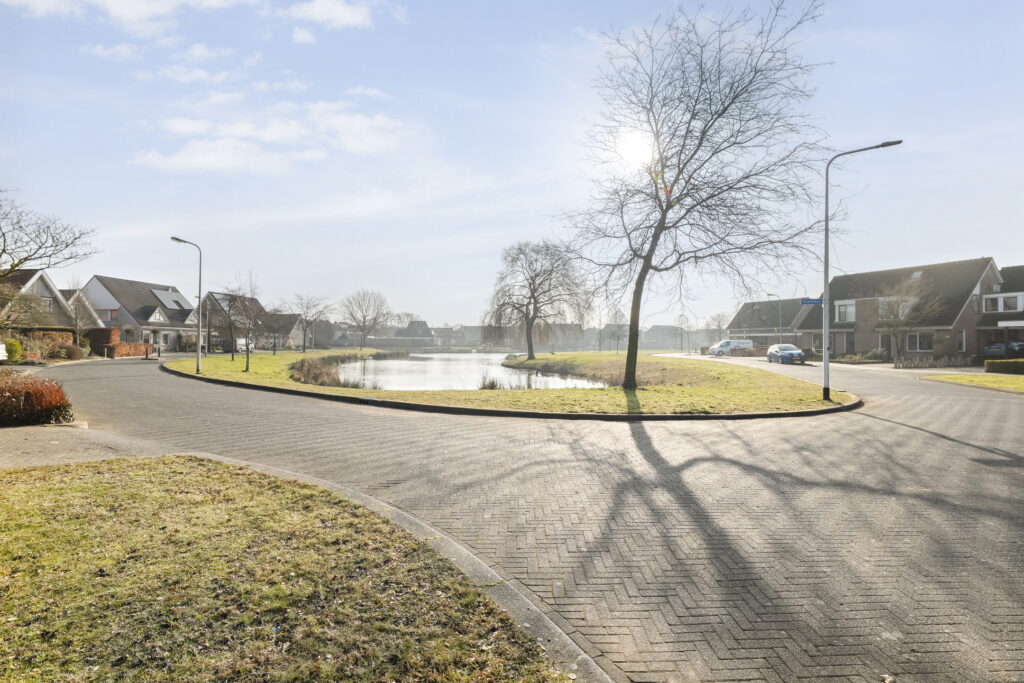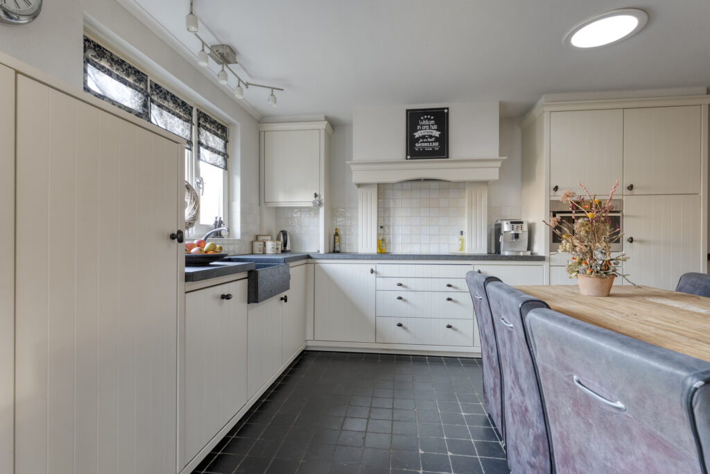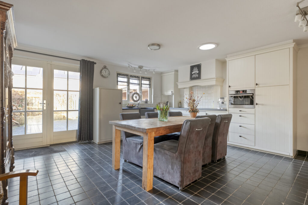 De woonkamer aan de voorzijde is voorzien van een karakteristieke erker die zorgt voor veel lichtinval. Bovendien kijk je vanuit de woonkamer vrij uit over de vijver in het midden van de wijk. De royale woonkeuken aan de achterzijde beschikt over een keukenopstelling in hoekvorm en biedt via openslaande deuren direct toegang tot de achtertuin. De keukenopstelling is voorzien van een gaskookplaat, combi-oven, koelkast en vaatwasmachine.