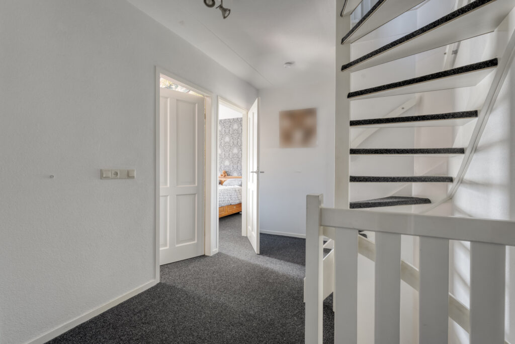 Eerste verdieping: Via de vaste trap kom je op de ruime overloop, waarvandaan alle vertrekken op deze verdieping te bereiken zijn. De eerste verdieping is zeer royaal opgezet, waar de opbouw op de garage een steentje aan heeft bijgedragen.