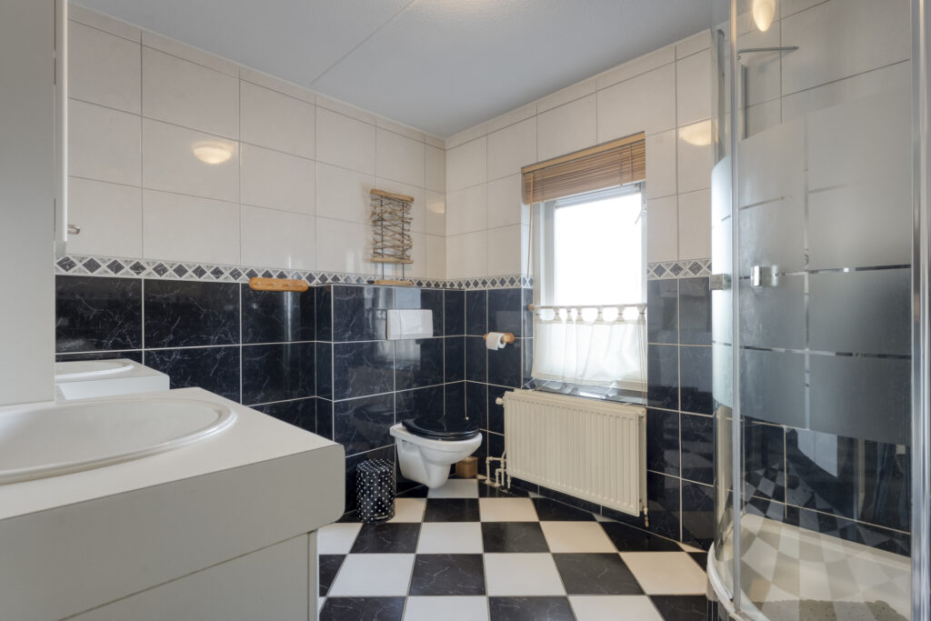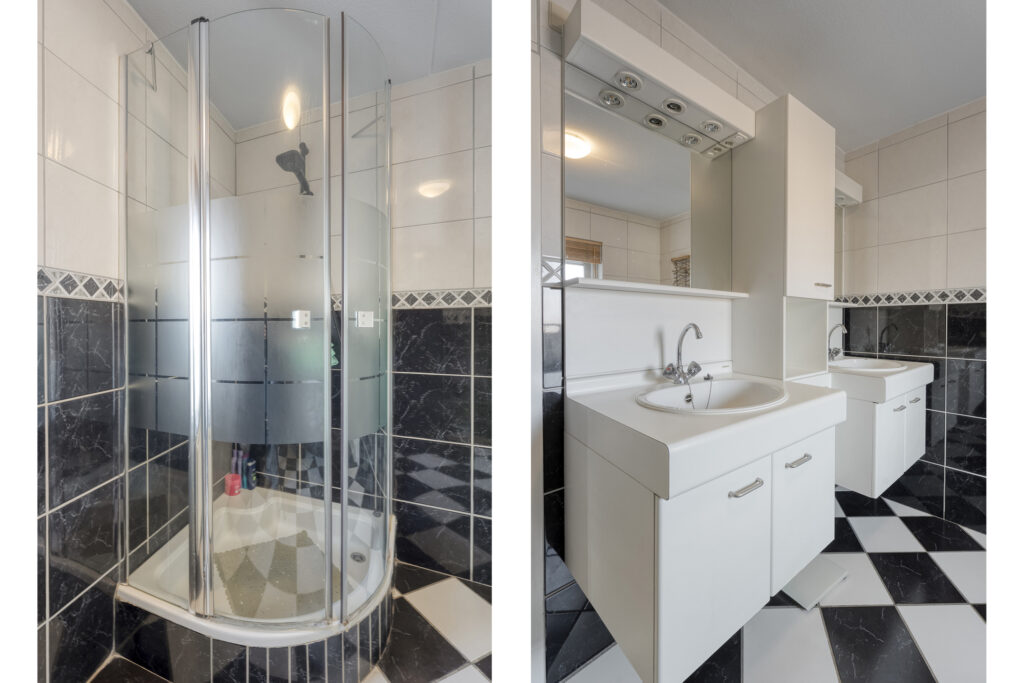 De badkamer is centraal op de verdieping gelegen en is ingericht met een douche, een tweede toilet en een dubbel wastafelmeubel. Bovendien is de badkamer voorzien van vloerverwarming.