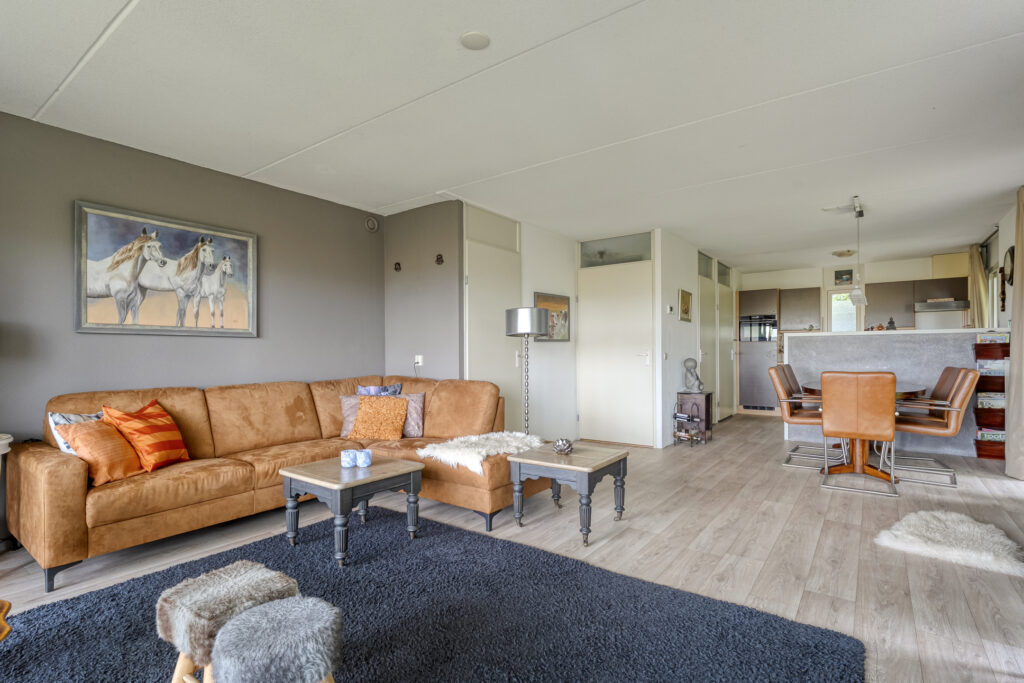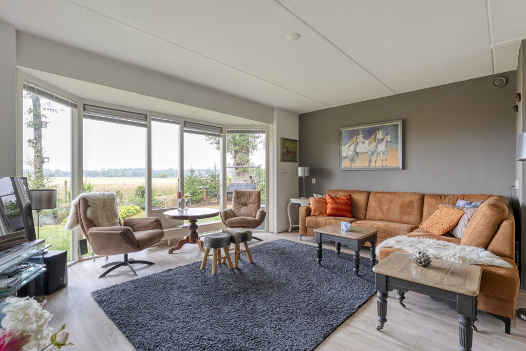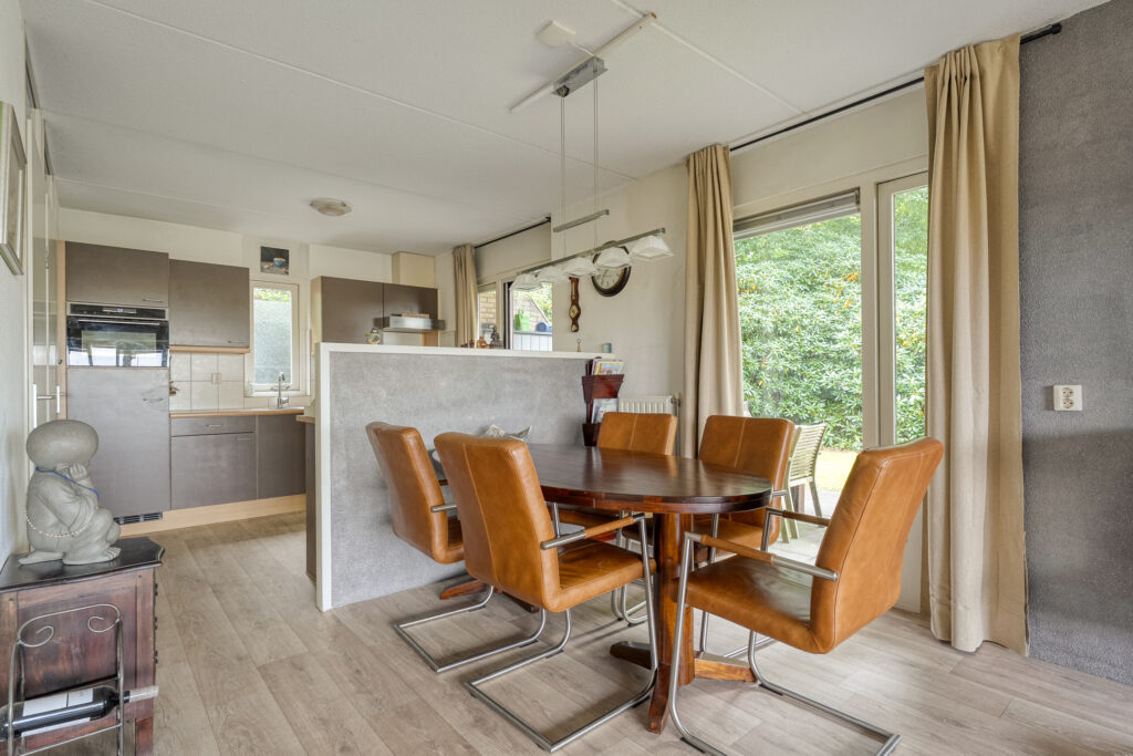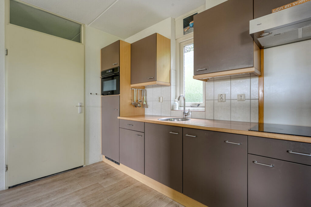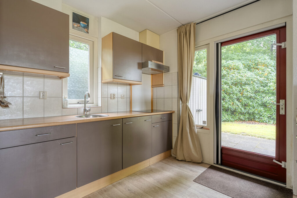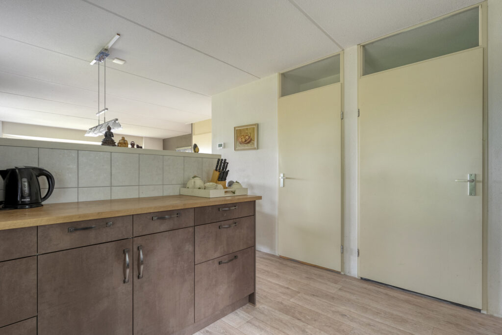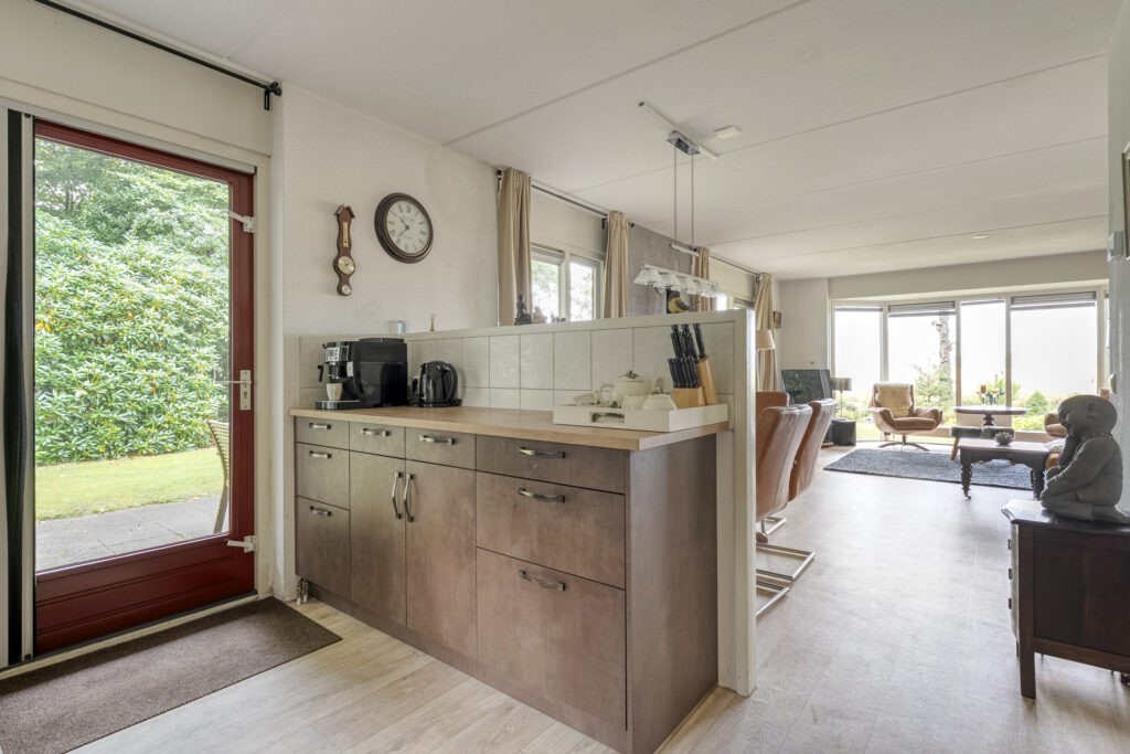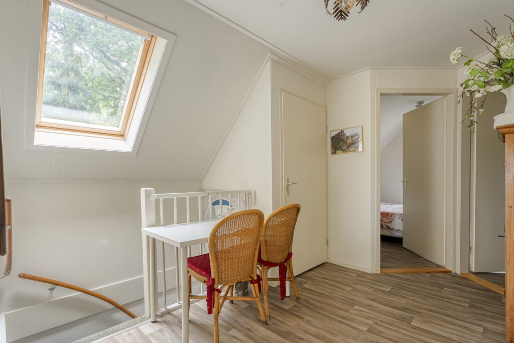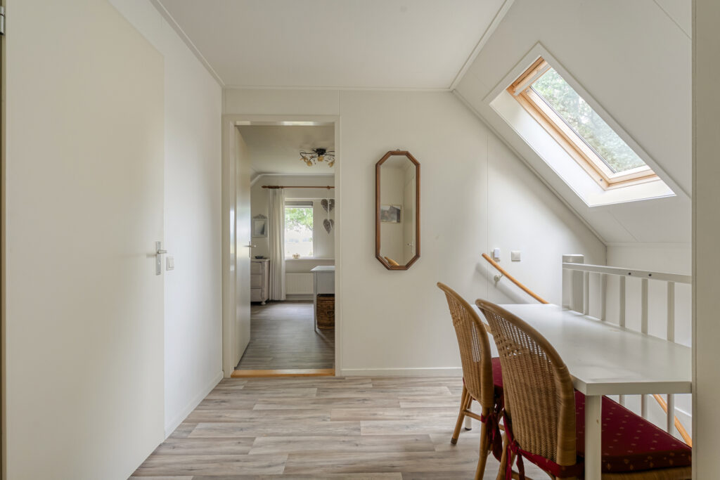 Entree/hal met toegang tot het toilet, de woonkamer en trapopgang naar de eerste verdieping. De lichte woonkamer biedt dankzij de erker een prachtig uitzicht over de omliggende landerijen. De sfeervolle gashaard en de aanwezigheid van horren dragen bij aan een comfortabel verblijf. Vanuit de woonkamer is een trappenkast te bereiken wat voor handige opbergruimte zorgt. Aan de woonkamer grenst de gemoderniseerde open keuken welke is voorzien van verschillende inbouwapparatuur welke ca. 5 jaar geleden is vervangen. De keuken beschikt over een inductie kookplaat met afzuigkap, koelkast, spoelbak, vaatwasser en combimagnetron. Verder is er nog een koffiezetapparaat en waterkoker aanwezig. Vanuit de keuken is de bijkeuken met witgoedaansluiting te bereiken. De bijkeuken is eenvoudig om te bouwen tot 2e badkamer, waardoor slapen en baden op de begane grond te realiseren is.