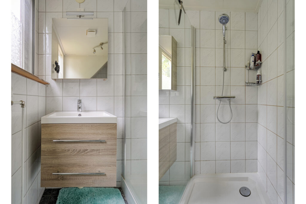 1e verdieping: Via de ruime overloop zijn 3 slaapkamers, de badkamer en technische ruimte met de cv-ketel te bereiken. De badkamer beschikt over een douche cabine, wastafelmeubel, toilet en design radiator. De ruime slaapkamer biedt de mogelijkheid om op te splitsen tot twee kleinere slaapkamers.