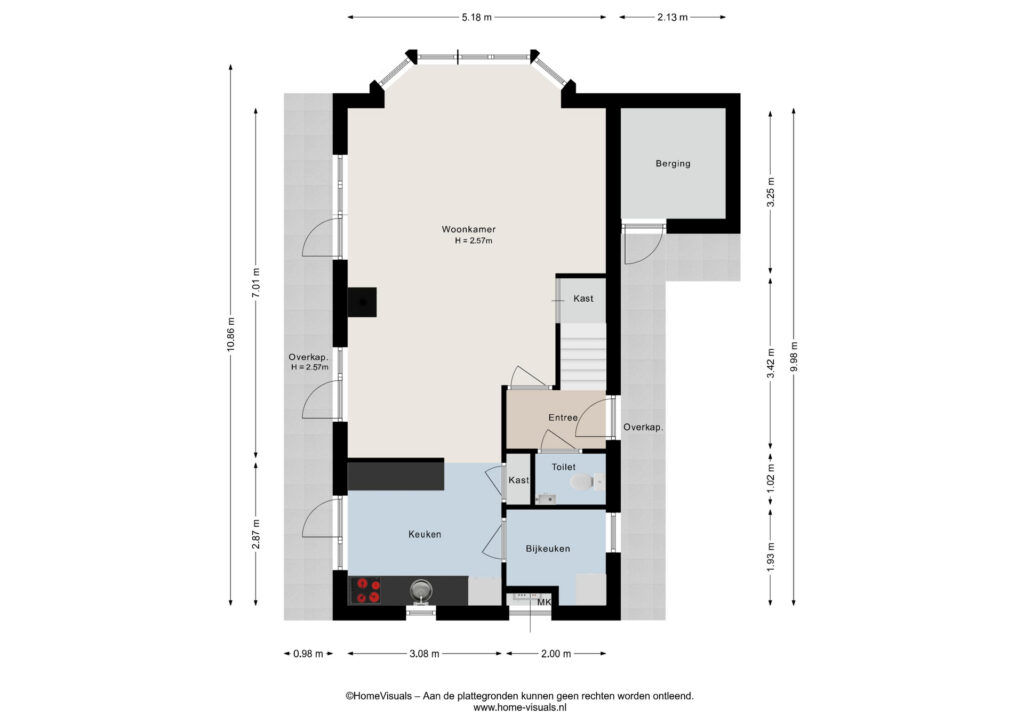 Begane grond: Via buiten zijn de berging met elektra aansluiting en de meterkast te bereiken.