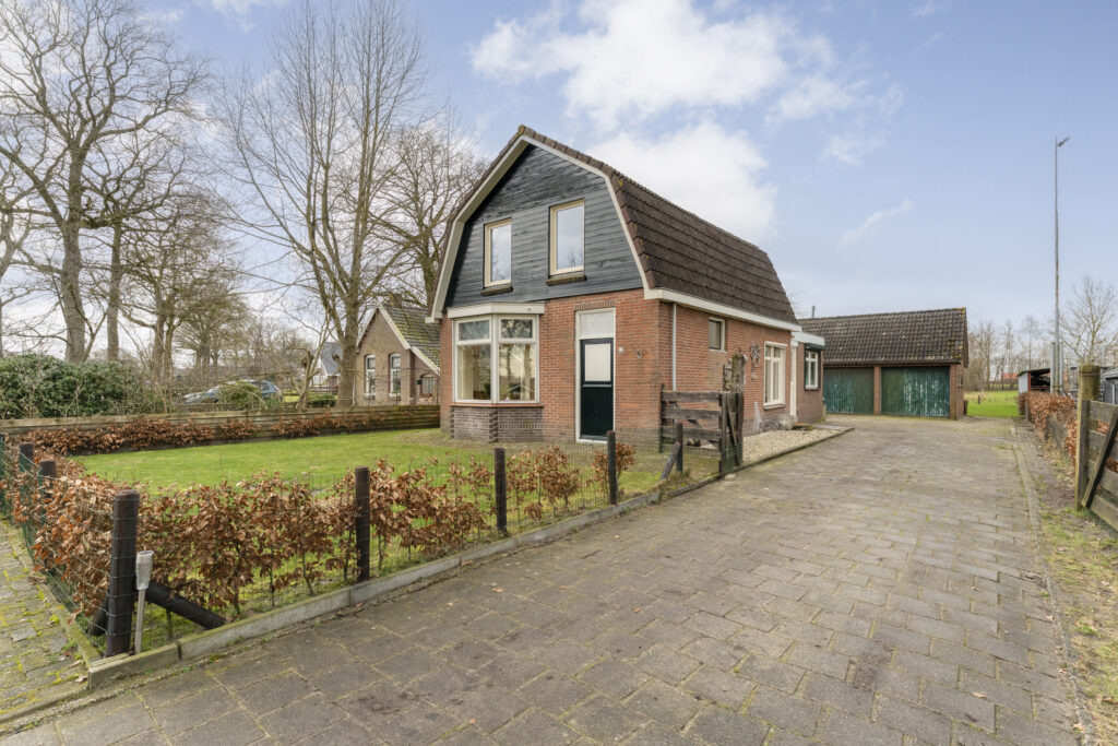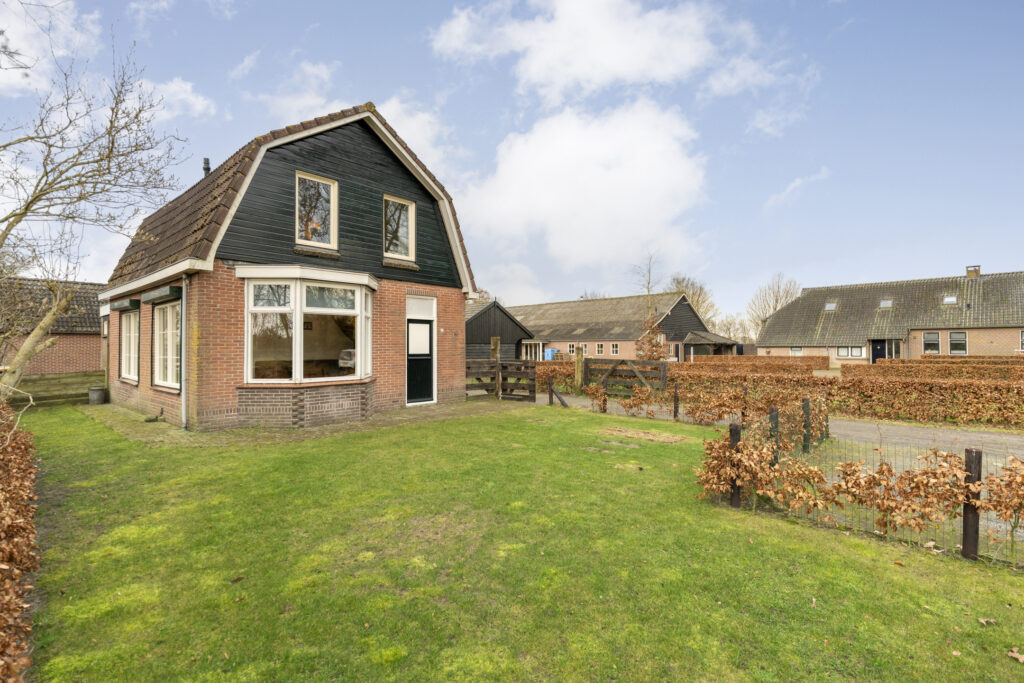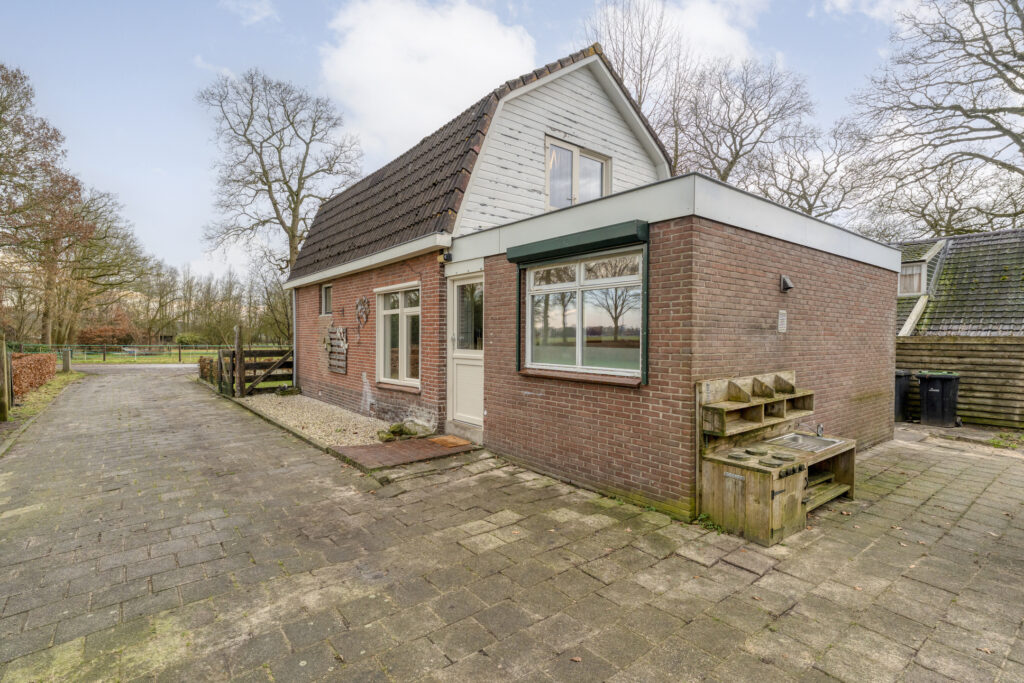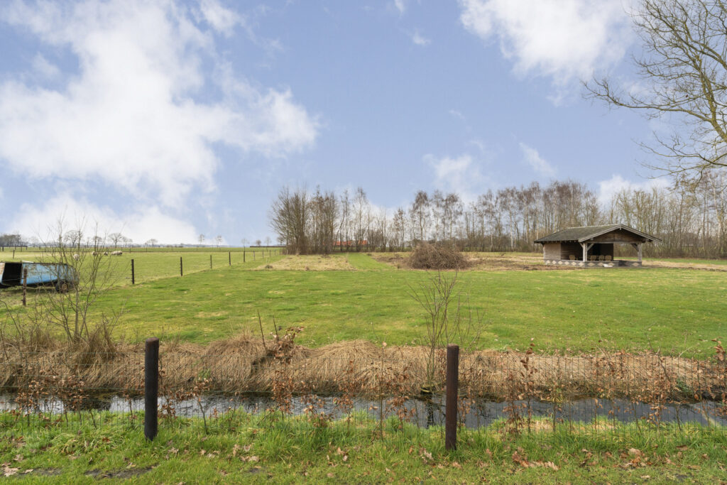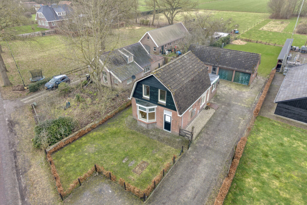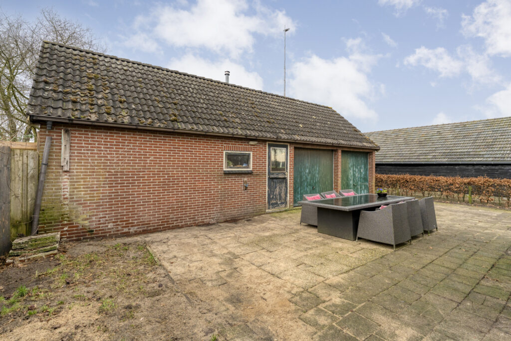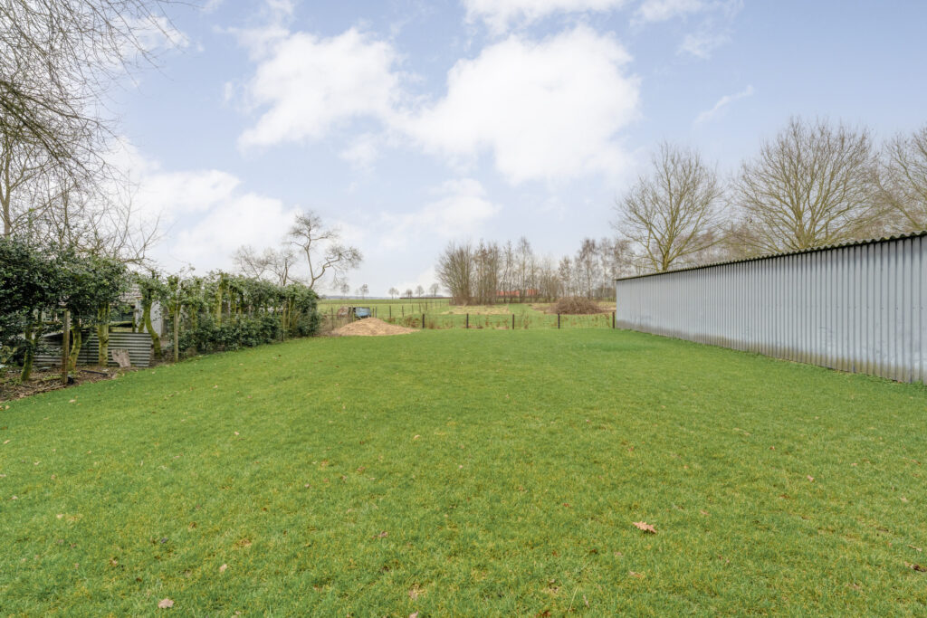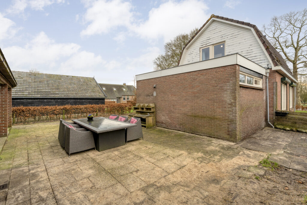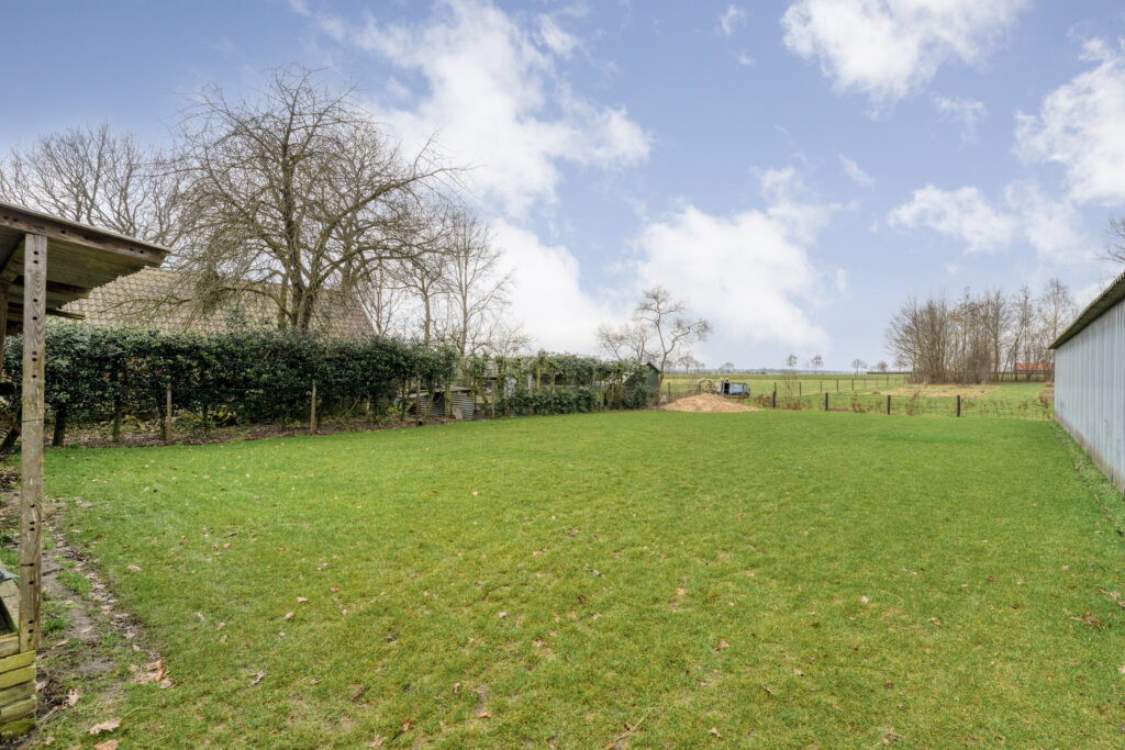 Buiten: aan de voorzijde van de woning ligt een groot gazon welke doorloopt tot langs de woning. Aan de andere zijde naast de woning tref je een lange oprit die naar achteren leidt. Deze oprit biedt volop parkeerruimte voor meerdere auto’s. Direct achter de woning ligt bestrating een er is een praktisch bijgebouw gesitueerd welke is opgedeeld in een garage en berging. Daarachter ligt een royaal gazon vanwaar je uitkijkt op de landerijen achter de woning.