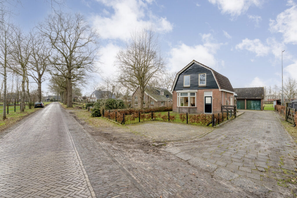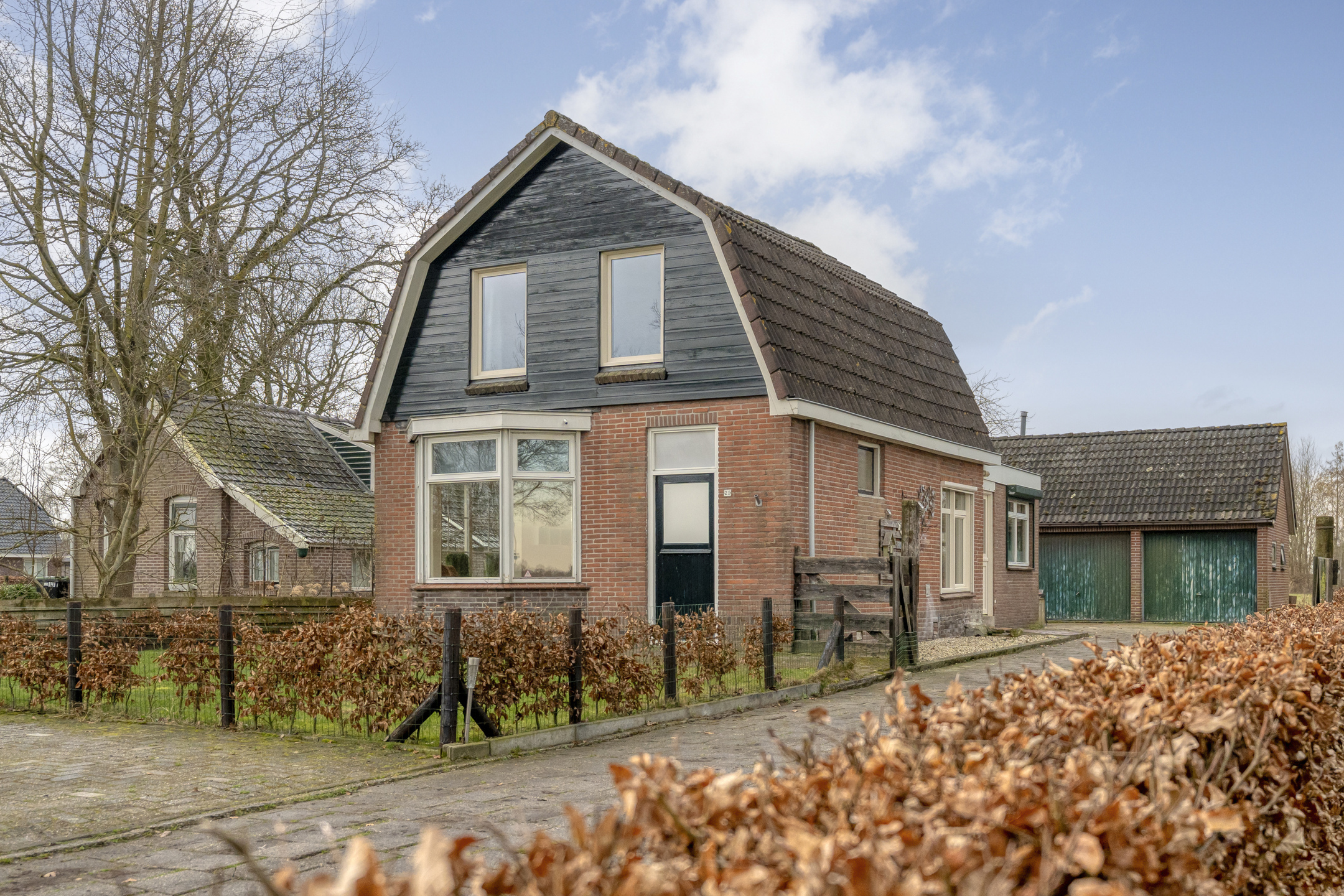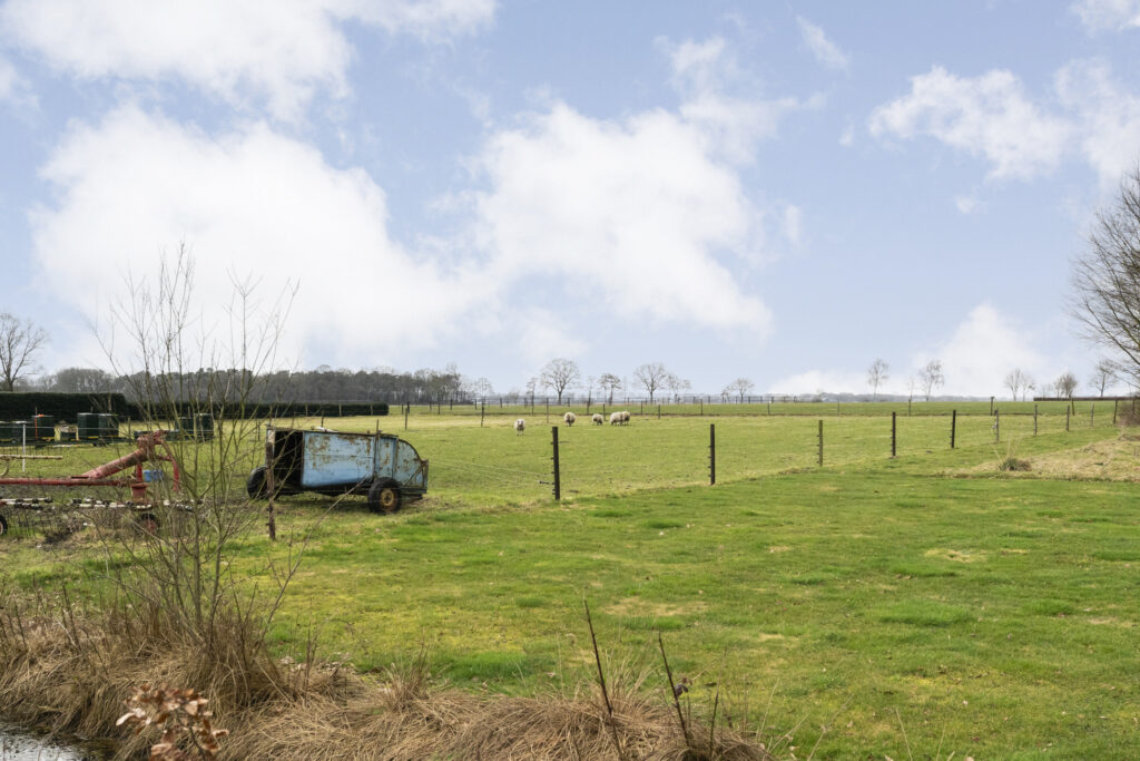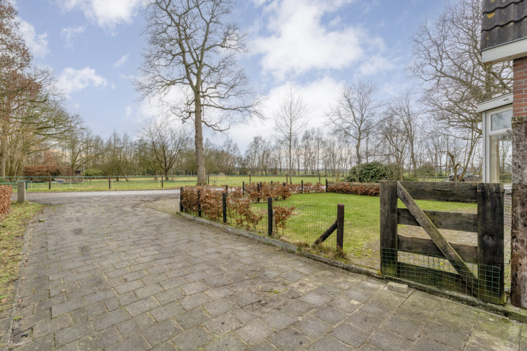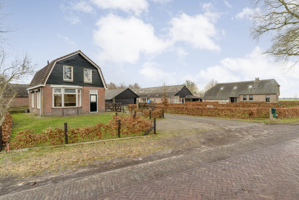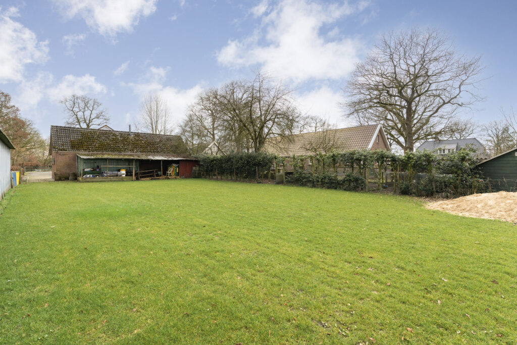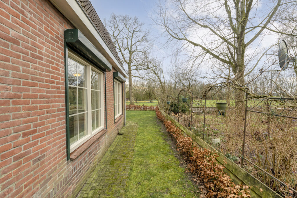 Buiten: aan de voorzijde van de woning ligt een groot gazon welke doorloopt tot langs de woning. Aan de andere zijde naast de woning tref je een lange oprit die naar achteren leidt. Deze oprit biedt volop parkeerruimte voor meerdere auto’s. Direct achter de woning ligt bestrating een er is een praktisch bijgebouw gesitueerd welke is opgedeeld in een garage en berging. Daarachter ligt een royaal gazon vanwaar je uitkijkt op de landerijen achter de woning.