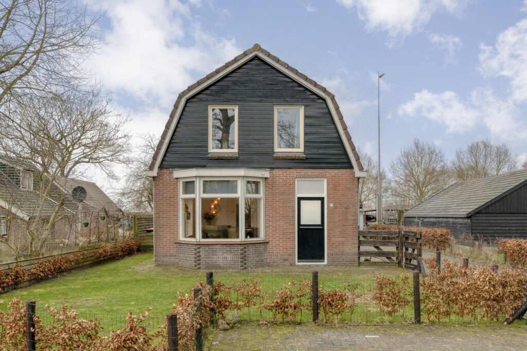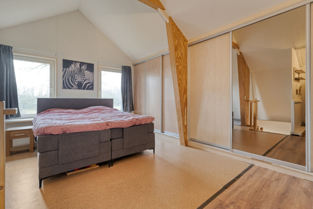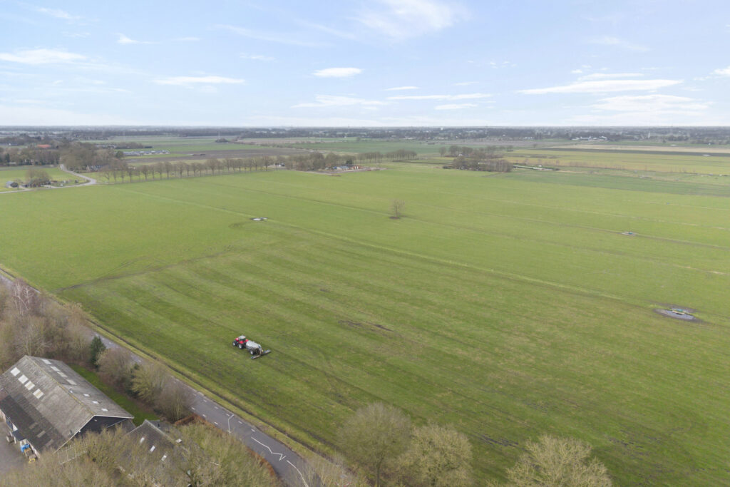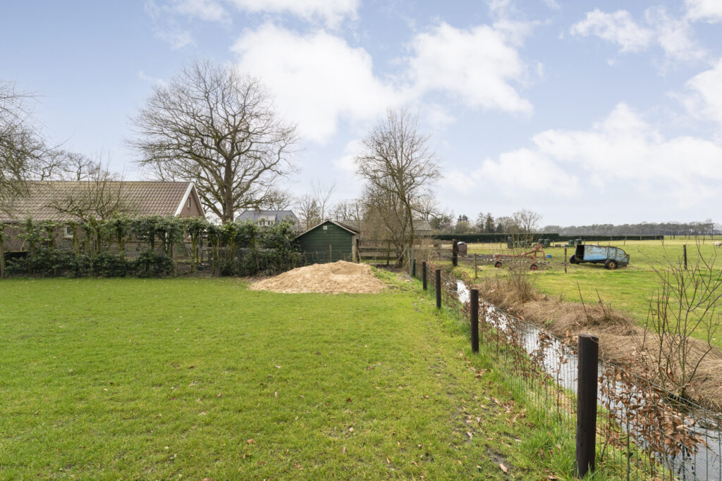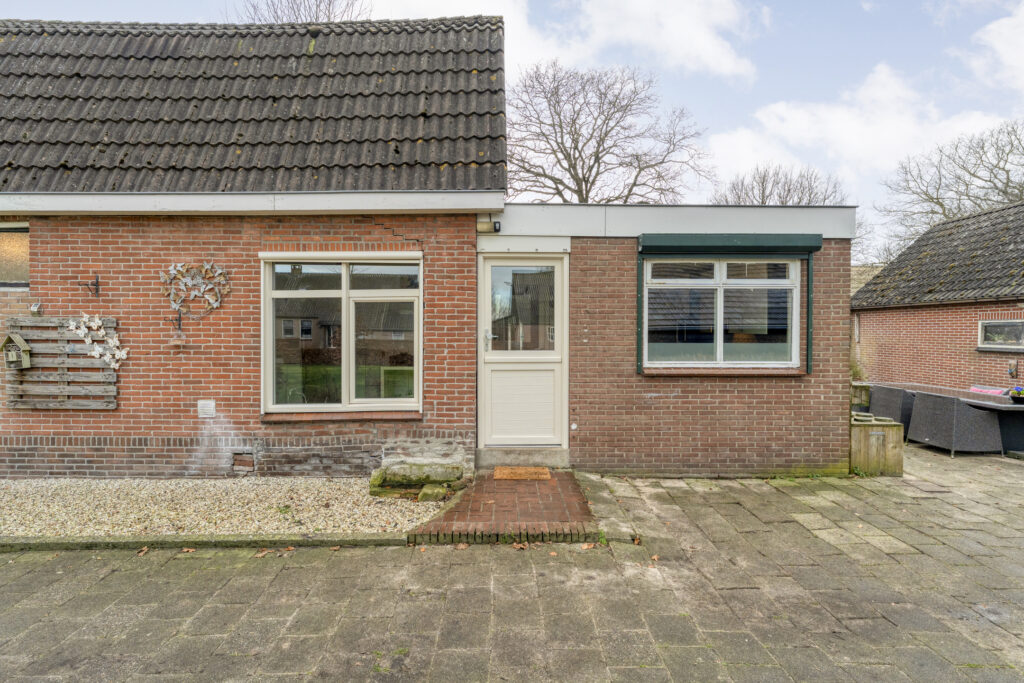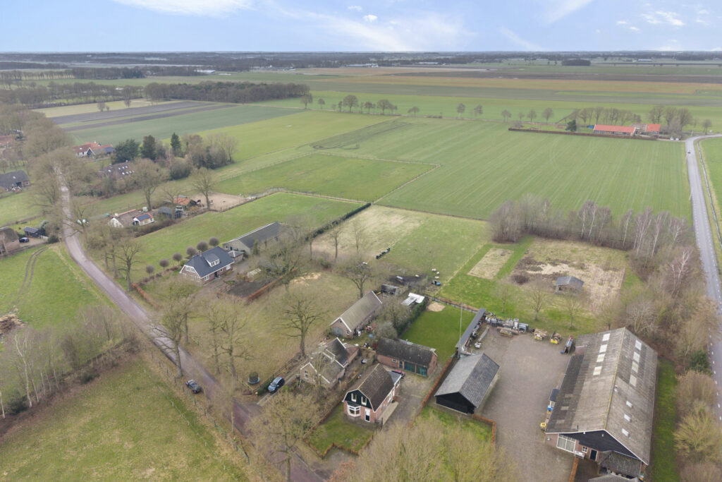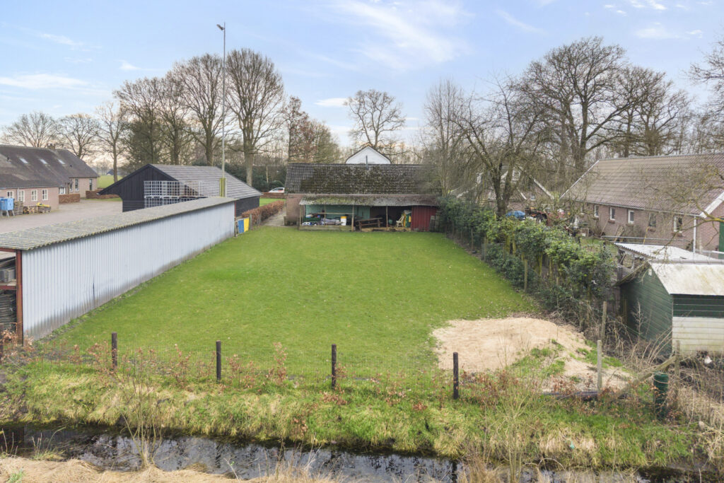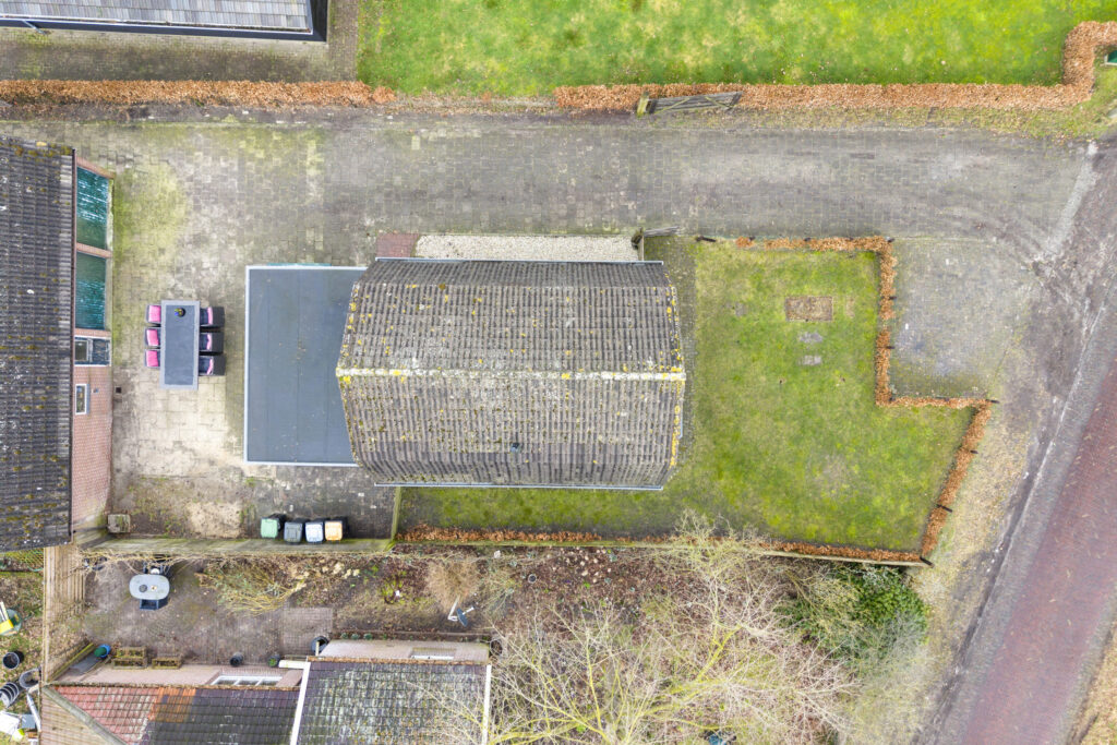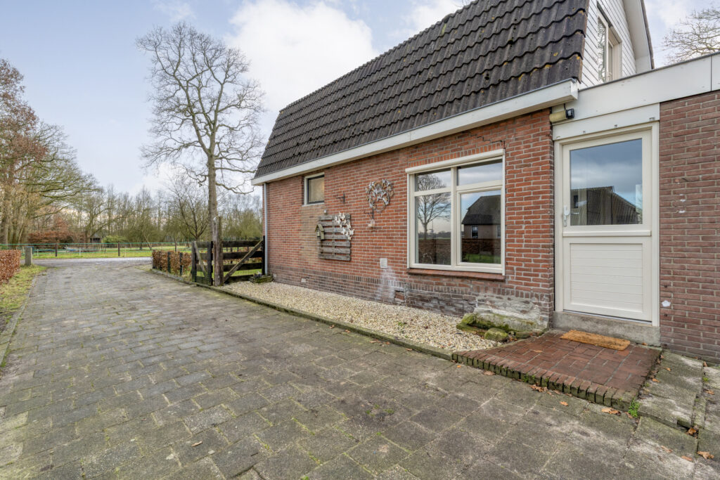 Buiten: aan de voorzijde van de woning ligt een groot gazon welke doorloopt tot langs de woning. Aan de andere zijde naast de woning tref je een lange oprit die naar achteren leidt. Deze oprit biedt volop parkeerruimte voor meerdere auto’s. Direct achter de woning ligt bestrating een er is een praktisch bijgebouw gesitueerd welke is opgedeeld in een garage en berging. Daarachter ligt een royaal gazon vanwaar je uitkijkt op de landerijen achter de woning.