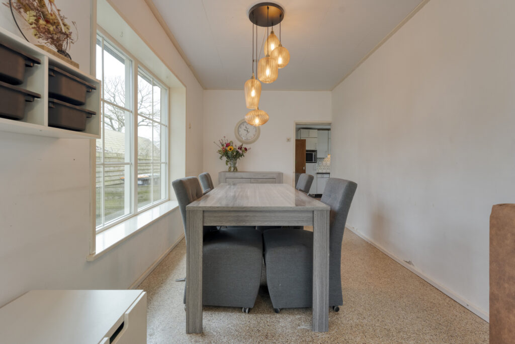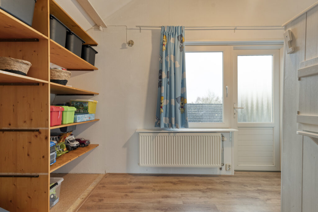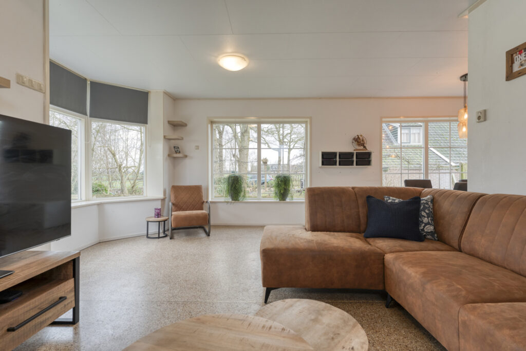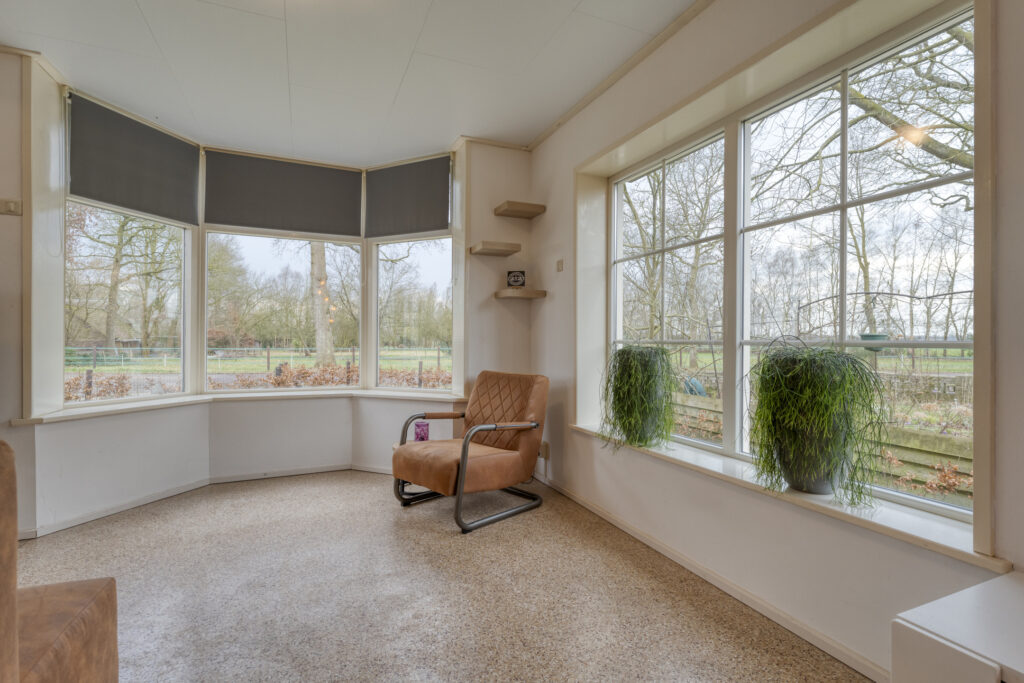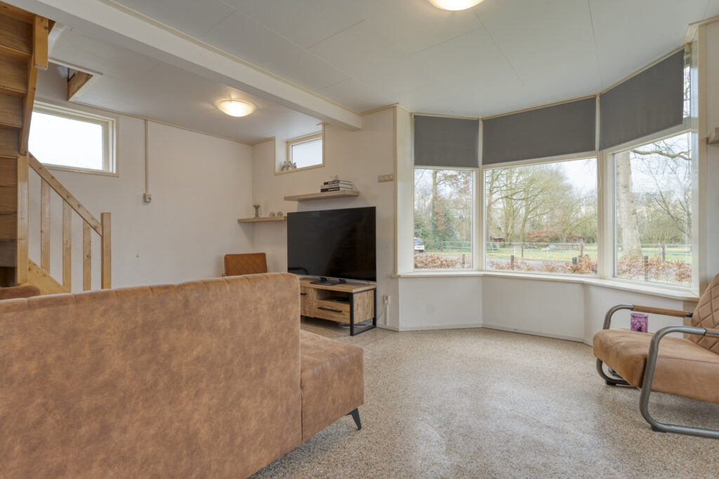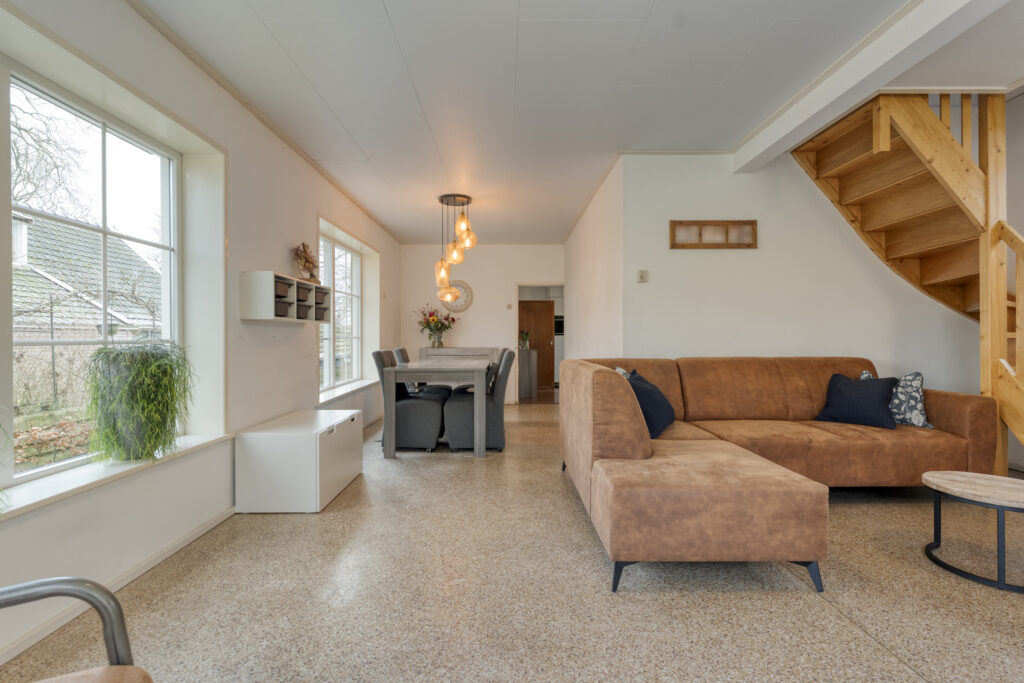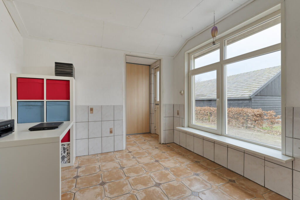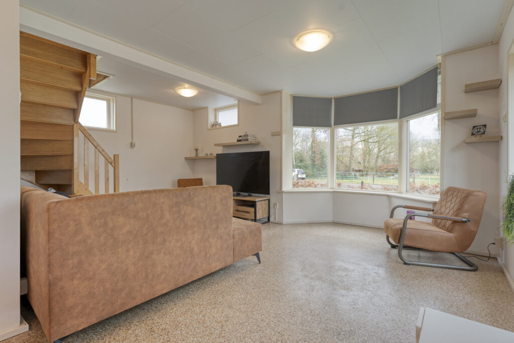 De L-vormige woonkamer is een gezellige ruimte waar de erker voor veel extra daglicht zorgt. Bovendien bieden de raampartijen een fraai uitzicht over de landerijen tegenover de woning. In de woonkamer bevindt zich de trap naar de eerste verdieping. Terug in de keuken tref je een gedateerde maar functionele keukenopstelling met inductiekookplaat en inbouwkoelkast aan. Vanuit de keuken is tevens de badkamer te bereiken, waar je de beschikking hebt over een wastafel en een douche. Via een open doorgang is een toilet met fonteintje te bereiken. Verder vind je in de royale bijkeuken de witgoedaansluitingen.
