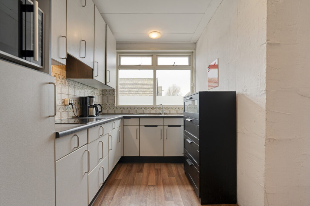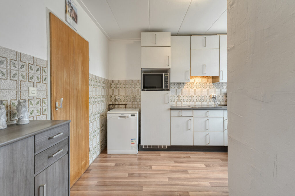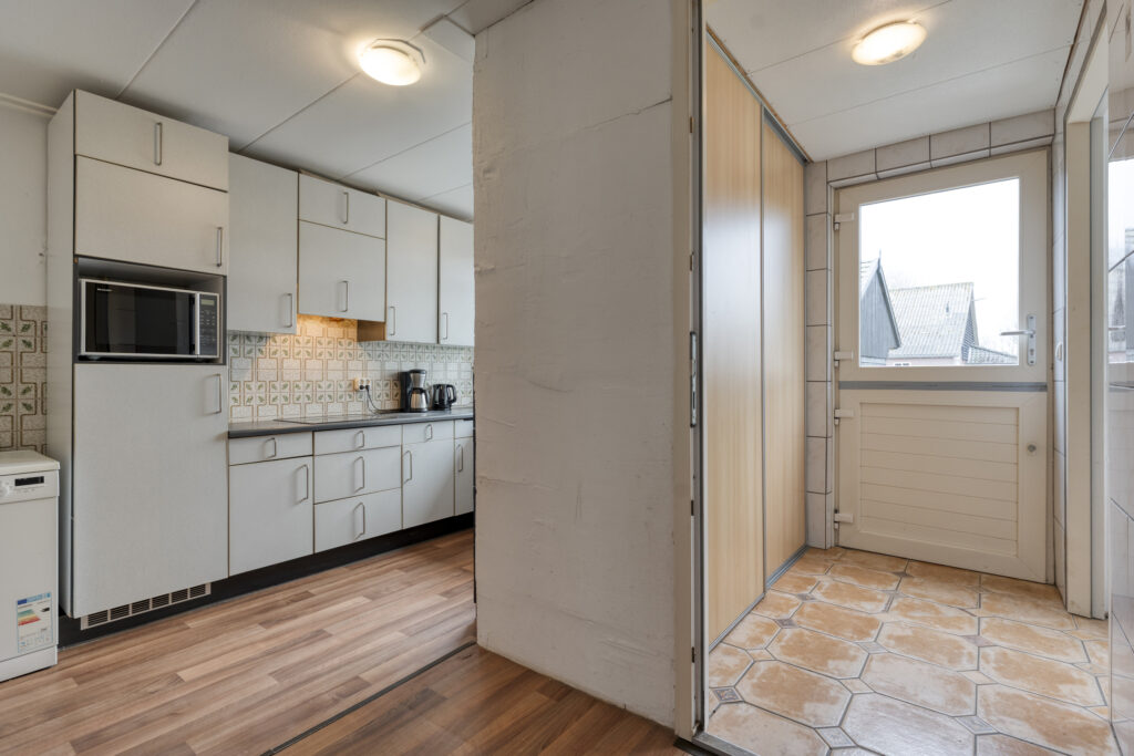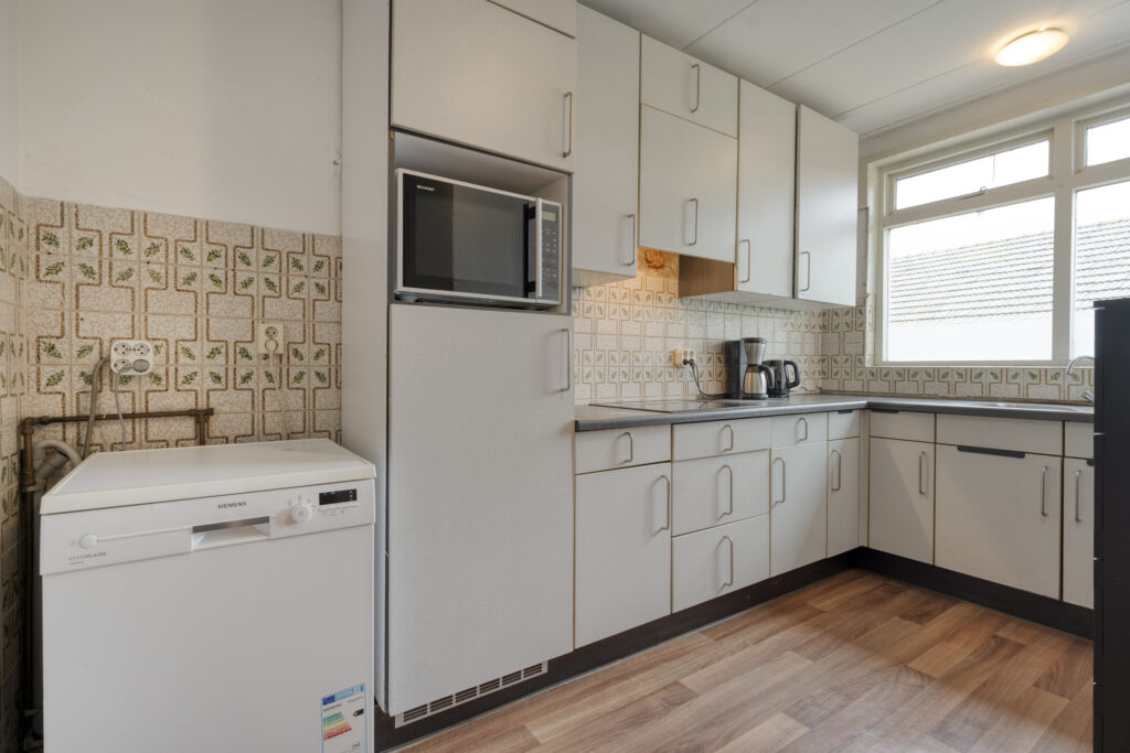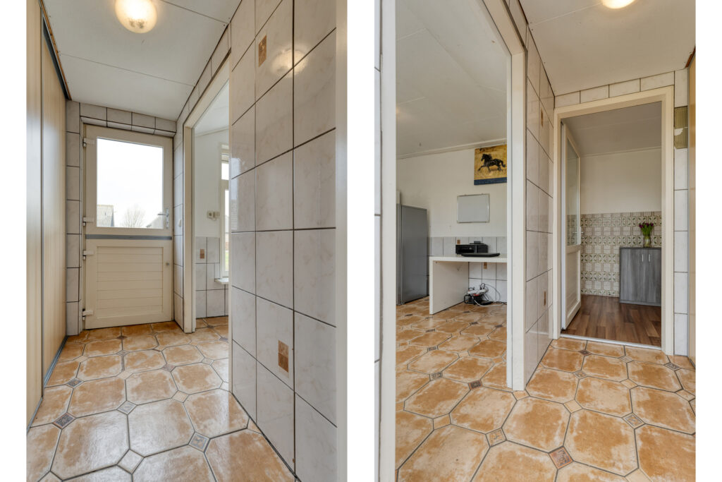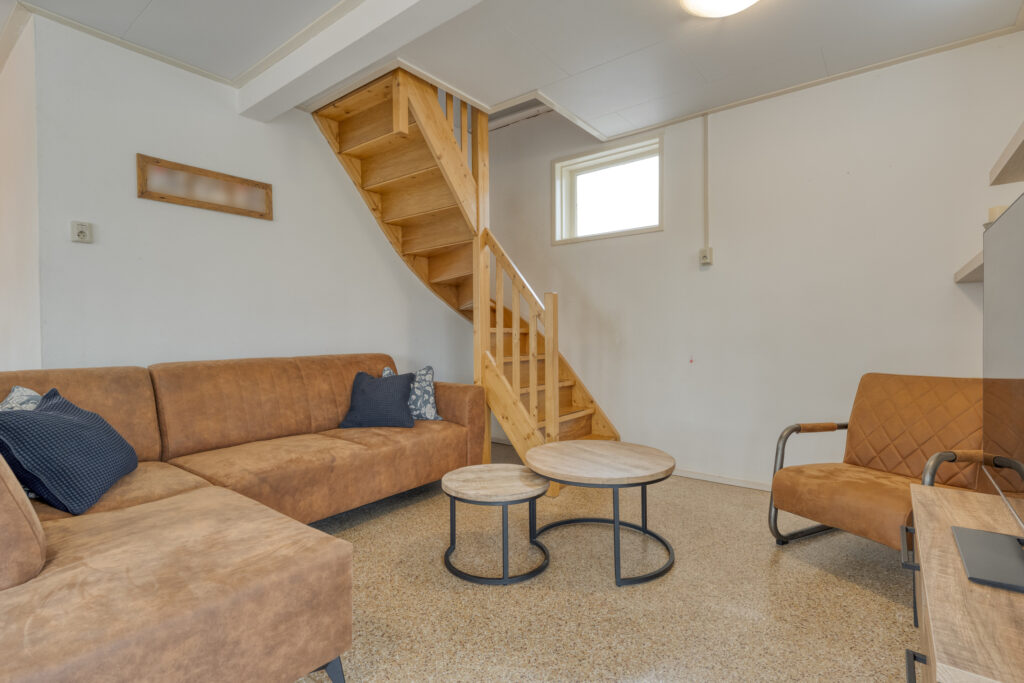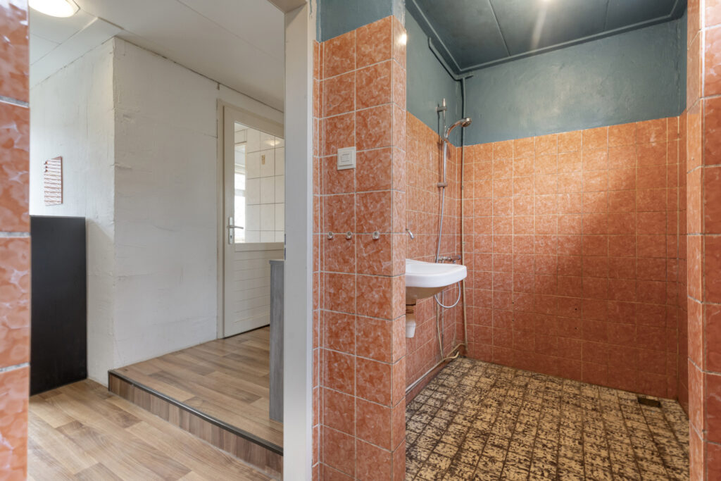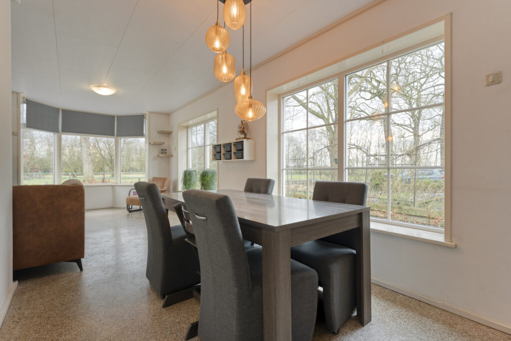 De L-vormige woonkamer is een gezellige ruimte waar de erker voor veel extra daglicht zorgt. Bovendien bieden de raampartijen een fraai uitzicht over de landerijen tegenover de woning. In de woonkamer bevindt zich de trap naar de eerste verdieping. Terug in de keuken tref je een gedateerde maar functionele keukenopstelling met inductiekookplaat en inbouwkoelkast aan. Vanuit de keuken is tevens de badkamer te bereiken, waar je de beschikking hebt over een wastafel en een douche. Via een open doorgang is een toilet met fonteintje te bereiken. Verder vind je in de royale bijkeuken de witgoedaansluitingen.