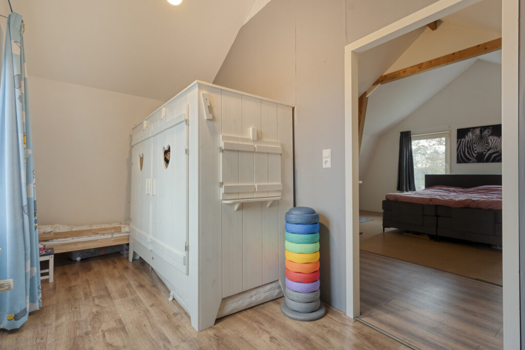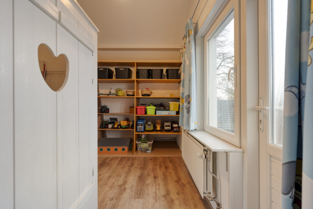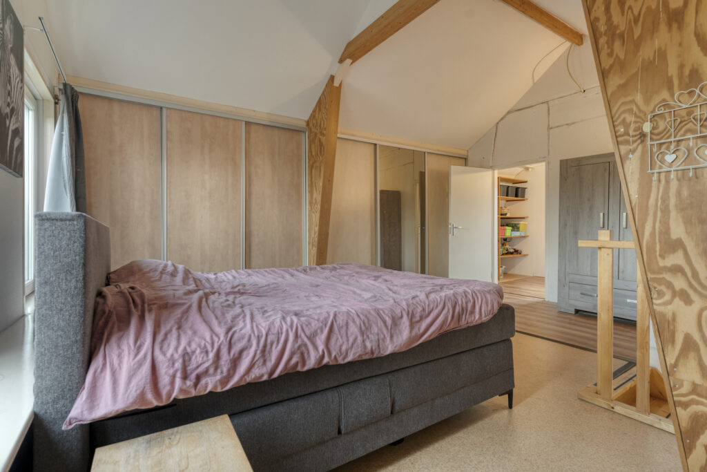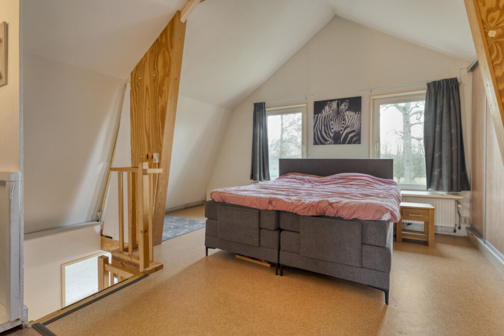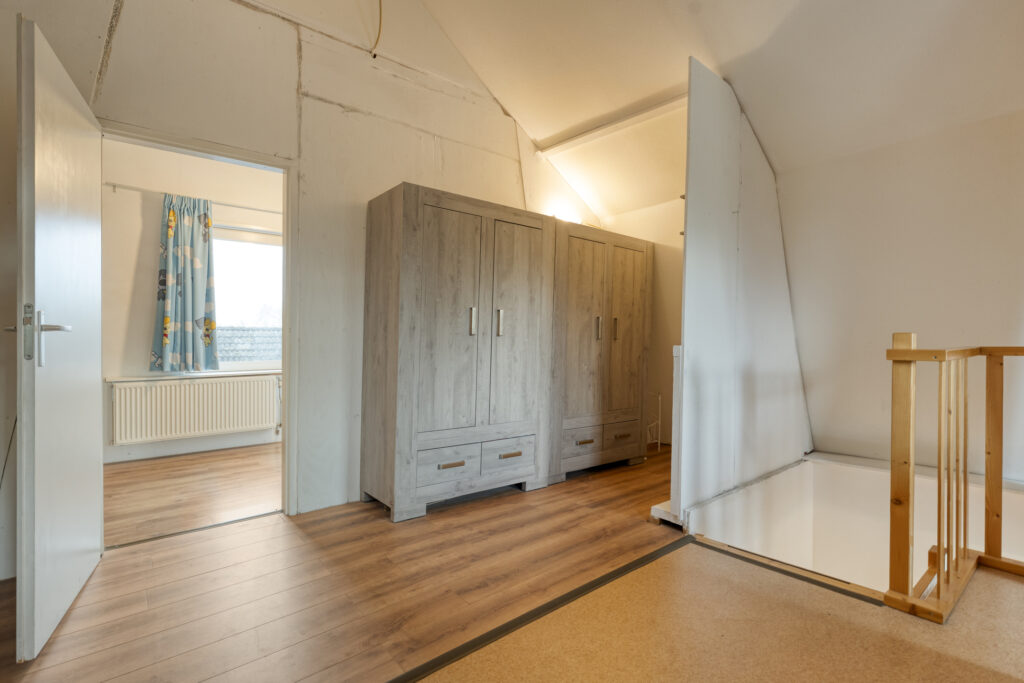 Eerste verdieping: de vaste trap brengt je op de eerste verdieping welke is opgedeeld in tweeën. Beide ruimtes zijn goed te gebruiken als slaapvertrek. De grootste ruimte beschikt tevens over praktische bergruimte waar tevens de CV-combiketel is gesitueerd.