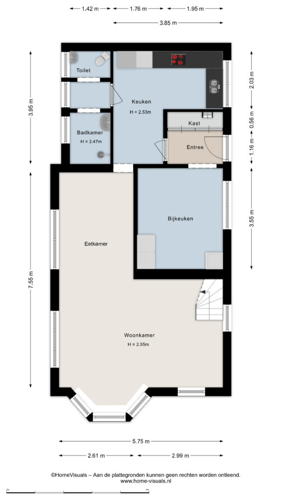 Begane grond: binnenkomst in entree aan zijkant van de woning met kastenwand met meterkast. Vanuit deze hal is er toegang tot de bijkeuken en de keuken. Via de keuken kom je in de woonkamer, welke zich aan de voorzijde van de woning bevindt.