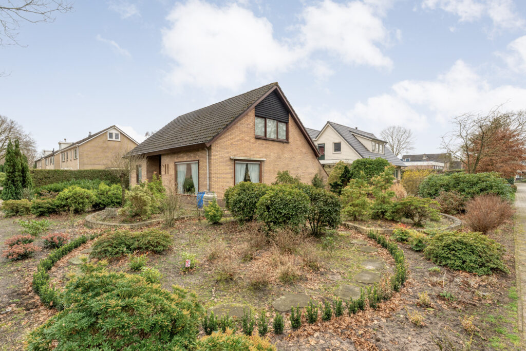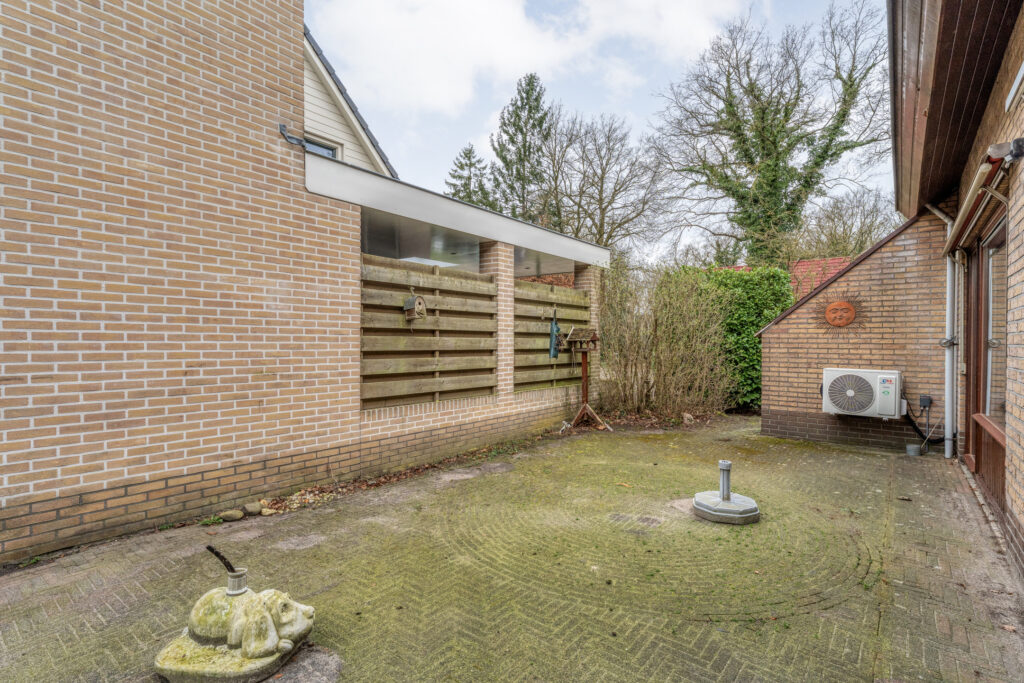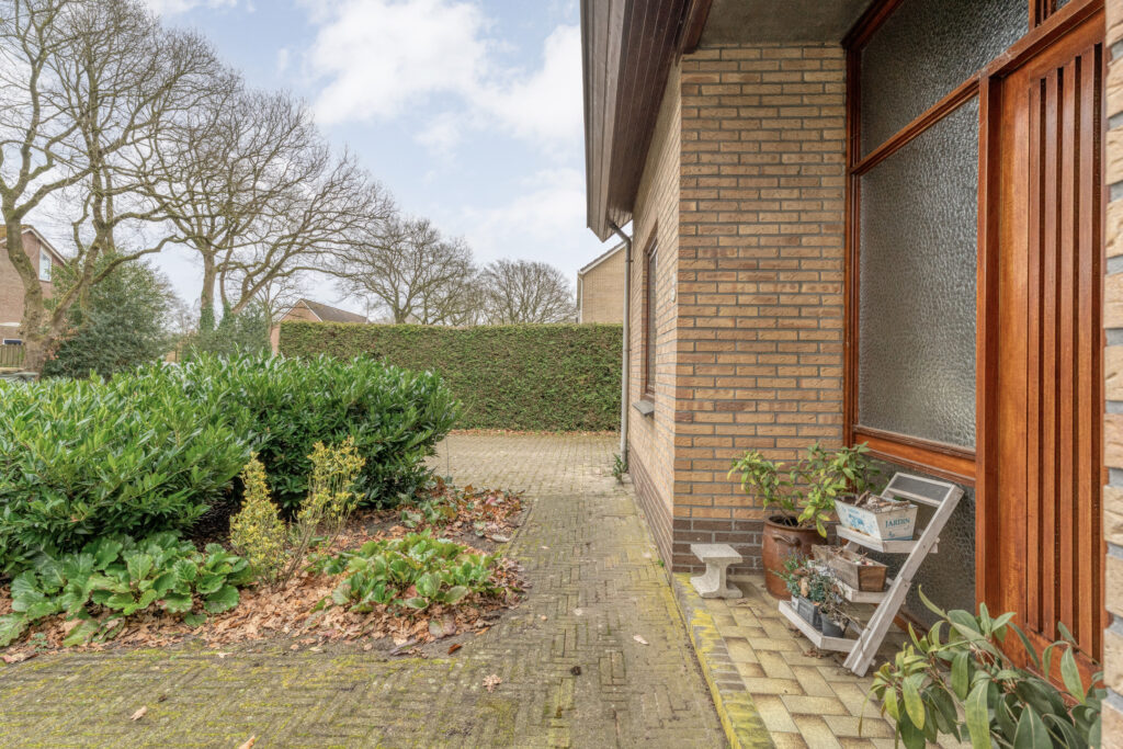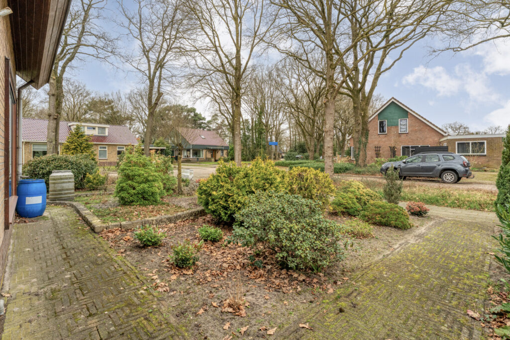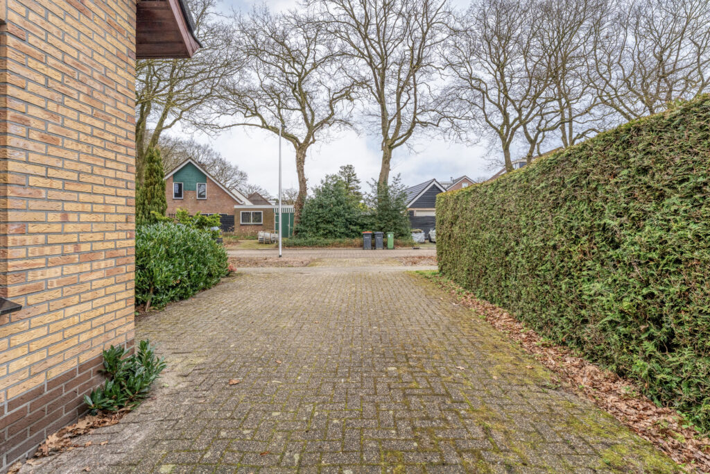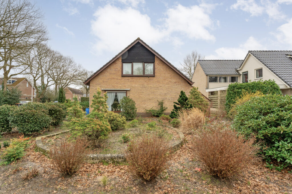 Buiten: rondom de woning ligt een flinke tuin met aan de voorzijde een oprit met ruimte voor twee auto’s. Voor- en rechts van de woning is de tuin voorzien van diverse beplanting en achter groot terras gelegen.