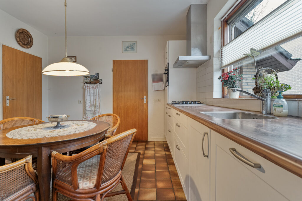 Begane grond: binnenkomst in ruime entree met de meterkast, trapopgang naar de eerste verdieping en het toilet met fonteintje. Vanuit de hal is de woonkamer, keuken en slaapkamer te bereiken. De woonkamer is verrassend ruim en dankzij de grote raampartijen aan weerszijden wordt de kamer voorzien van veel daglichtinval. Aan de voorzijde is er voldoende ruimte voor een zitgedeelte en aan de achterzijde kun je een eetgedeelte creëren, vanwaar de halfopen keuken te bereiken is. Deze is voorzien van een rechte keukenopstelling met combioven en inbouwkoelkast. Vanuit de keuken kom je in de bijkeuken, waar naast de witgoedaansluitingen een stookruimte met de CV-combiketel is gesitueerd. De bijkeuken biedt verder toegang tot de tuin en de aangebouwde garage met vliering. De slaapkamer op de begane grond is te bereiken vanuit de hal en beschikt over vaste kasten en een eigen wastafel.