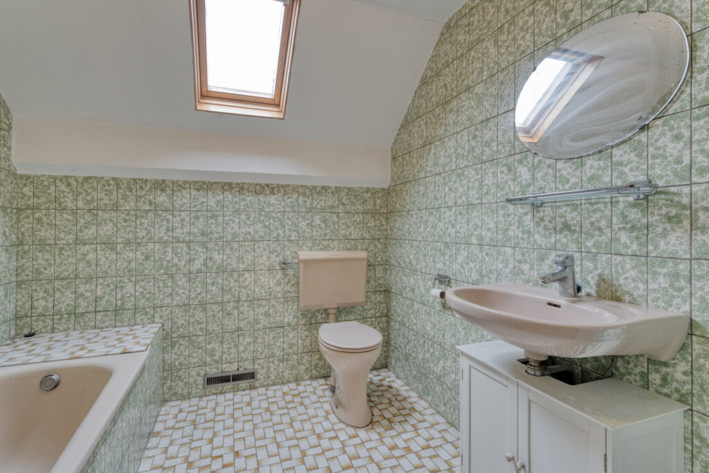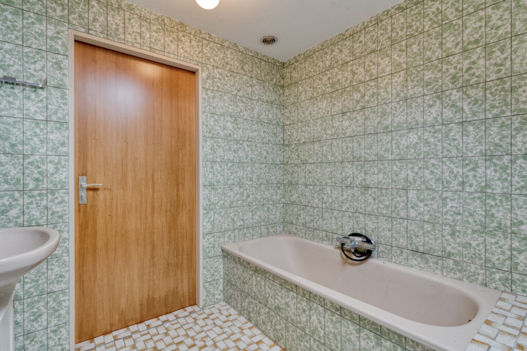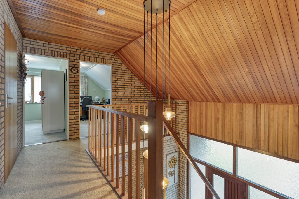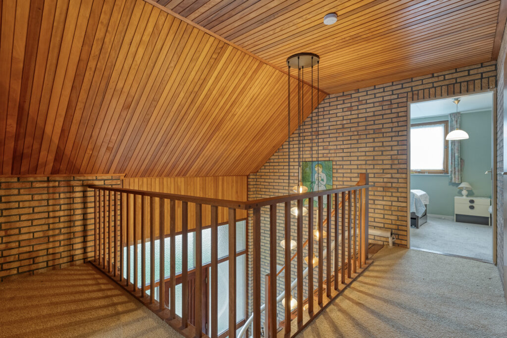 Eerste verdieping: vanaf de overloop met vide is een drietal slaapkamers, een badkamer en een berging te bereiken. De retrobadkamer is voorzien van een ligbad, toilet en wastafel.