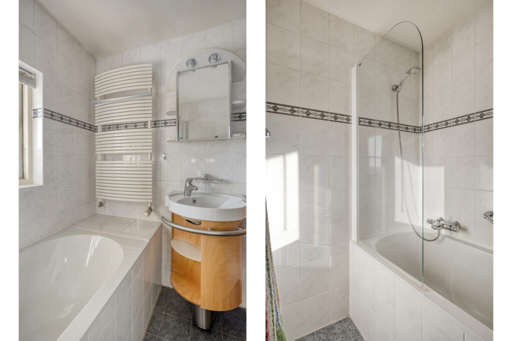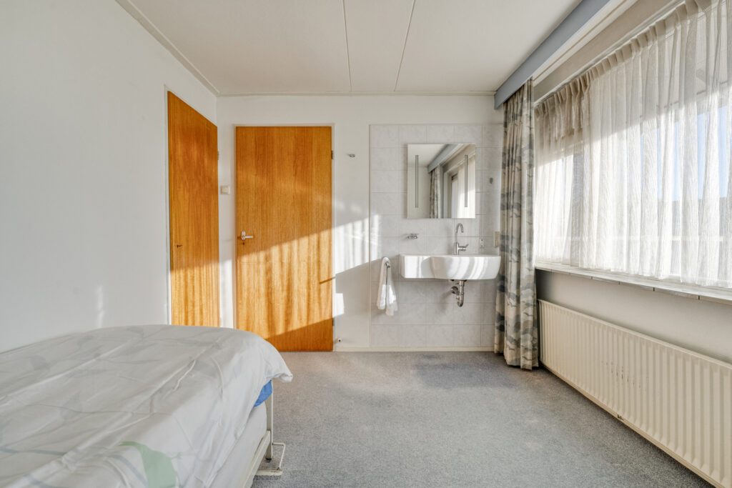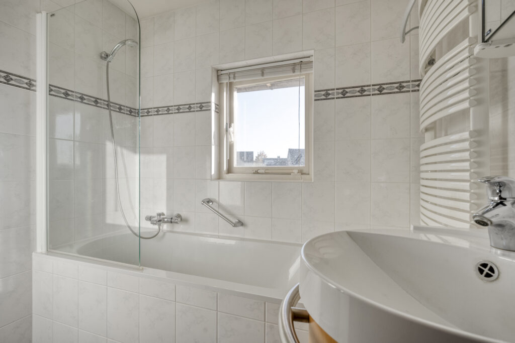 1e verdieping: Overloop met toegang tot 2 slaapkamers, vaste kast, apart toilet en de badkamer. De slaapkamer aan de voorzijde geef toegang tot het balkon en heeft een wastafel. De ruime slaapkamer aan de achterzijde is voorzien van 2 royale inbouwkasten, hier kan eventueel eenvoudig een extra slaapkamer gerealiseerd worden. De badkamer is voorzien van een ligbad, radiator en wastafelmeubel.