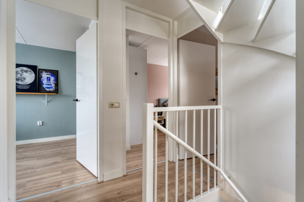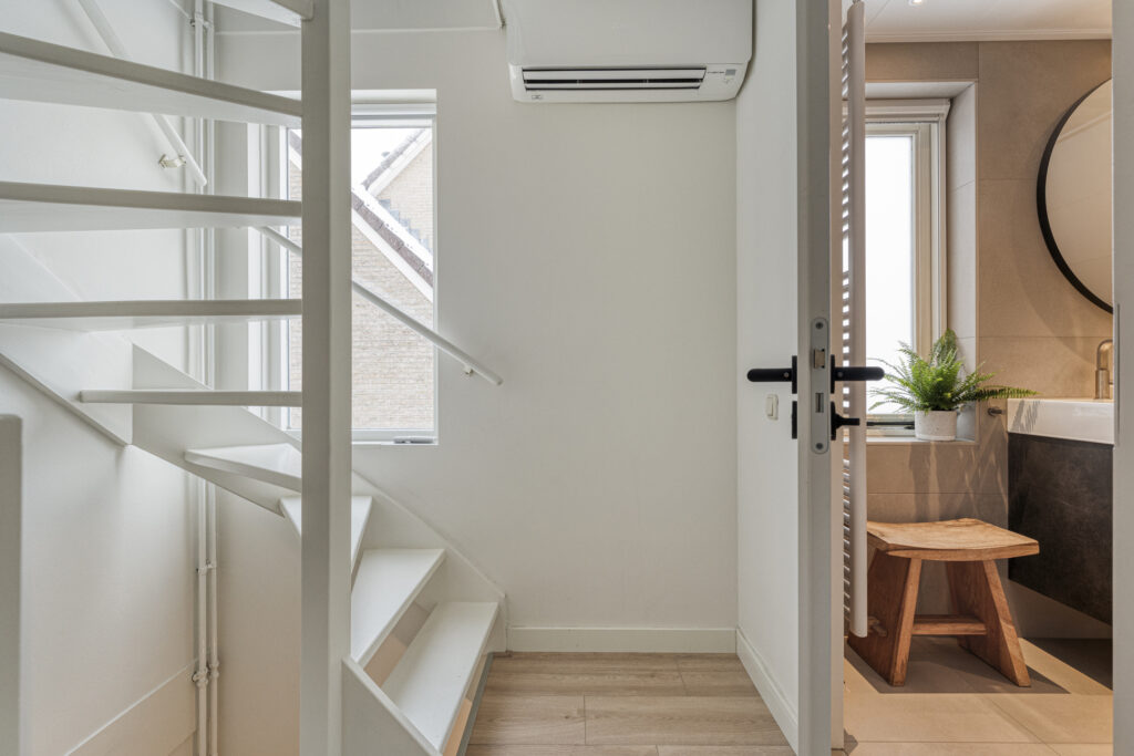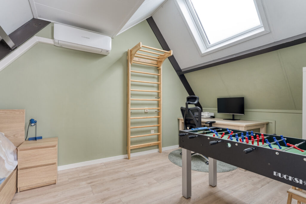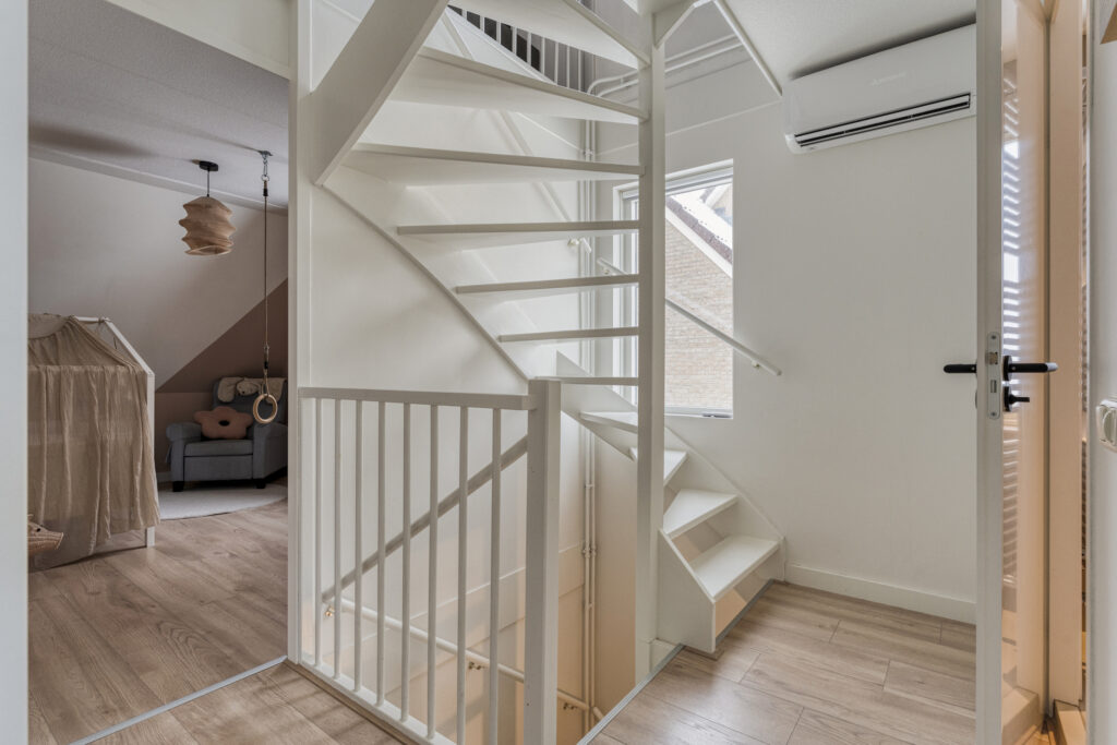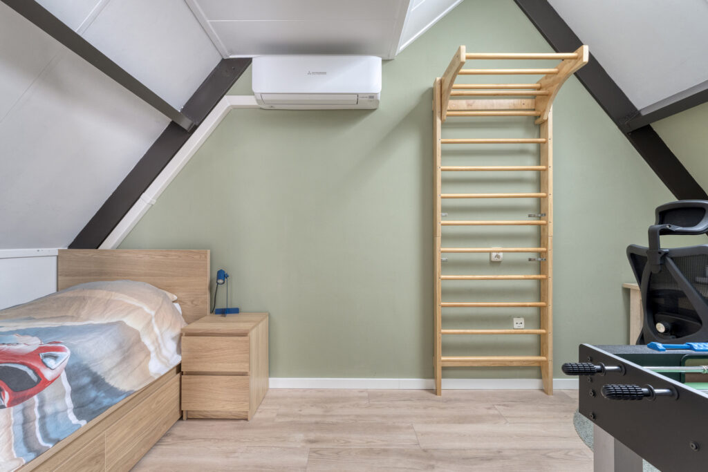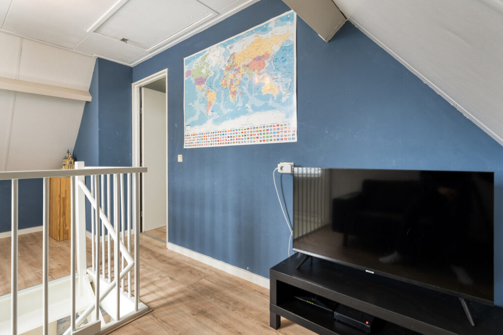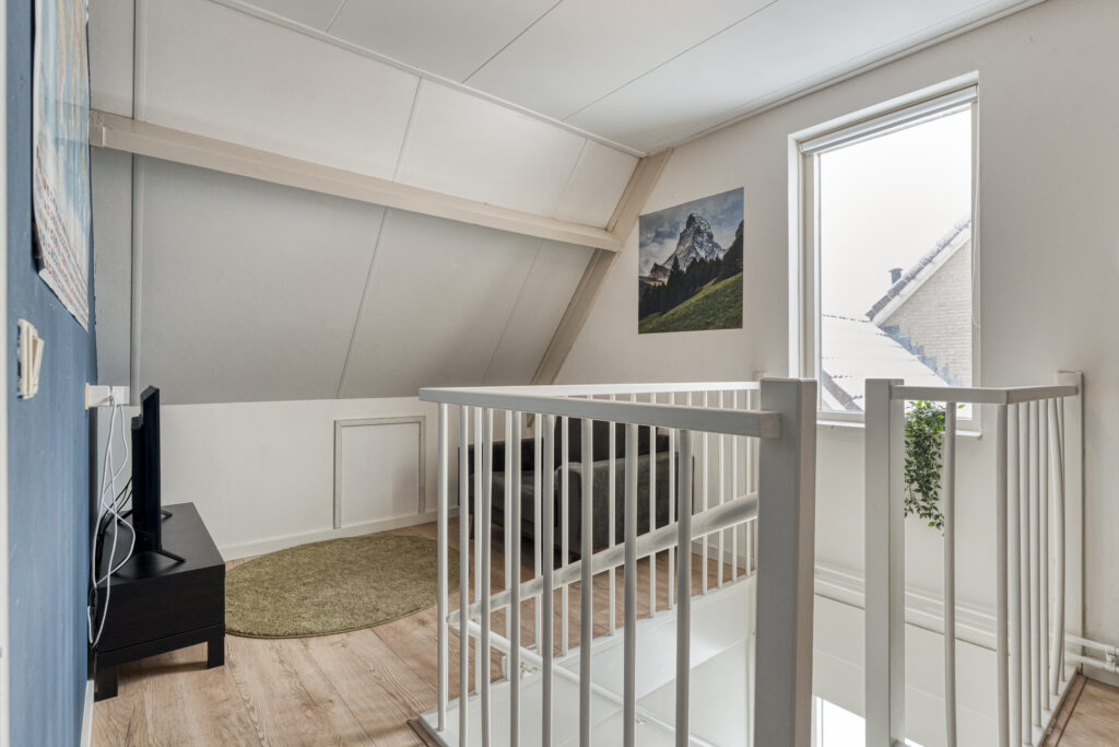 Tweede verdieping: de tweede verdieping is middels een vaste trap te bereiken die je naar de ruime overloop leidt. De trap is recentelijk van beneden tot boven geschilderd. Op de overloop tref je een knus zitje en de CV-combiketel (uit 2025) aan en er is toegang tot de riante vierde slaapkamer. Net als de eerste verdieping beschikt deze slaapkamer over een airco-installatie die zowel kan koelen als verwarmen. Daarnaast is er zowel in de slaapkamer als de overloop veel bergruimte achter de knieschotten tot je beschikking. Bovendien is er een praktische vliering aanwezig.
