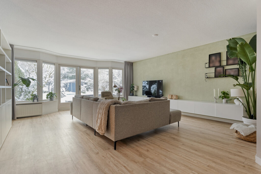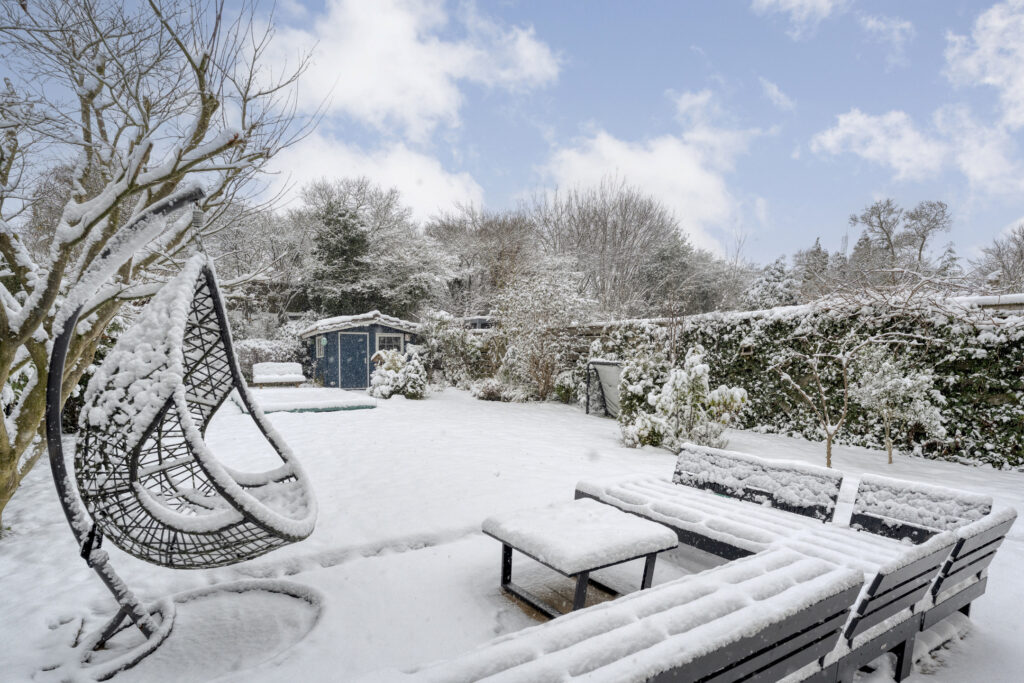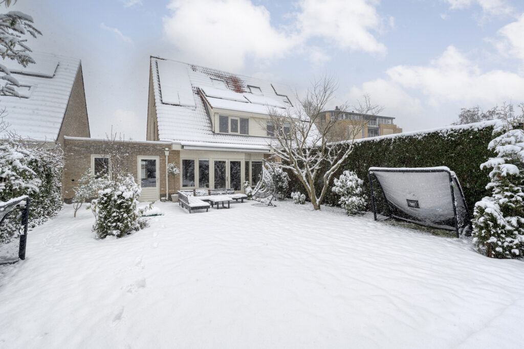 Achter de woning ligt een privacy-volle achtertuin met een breed terras, diverse beplanting en een strak gazon. Dankzij de afwezigheid van directe achterburen en de begroeiing achter de woning kun je hier genieten van veel privacy.