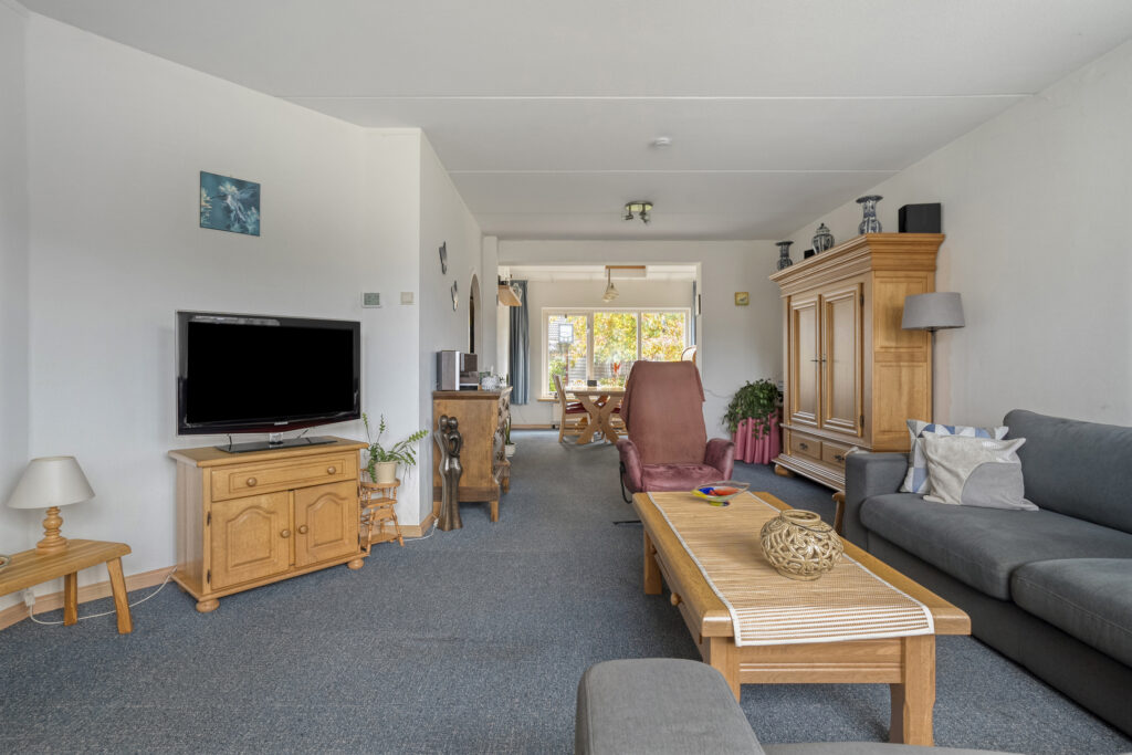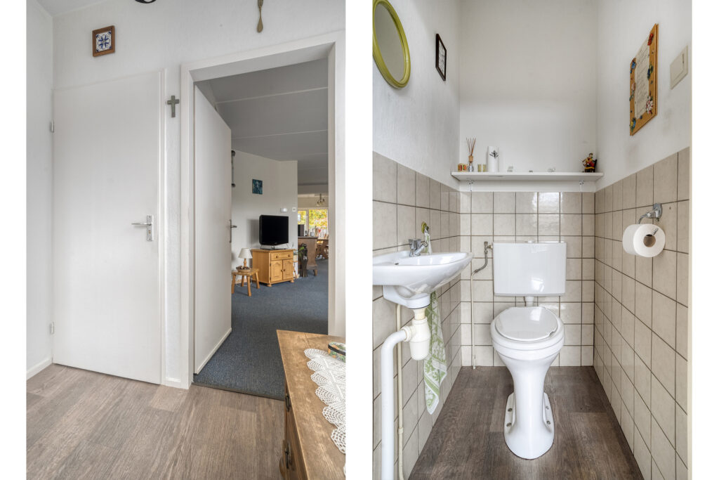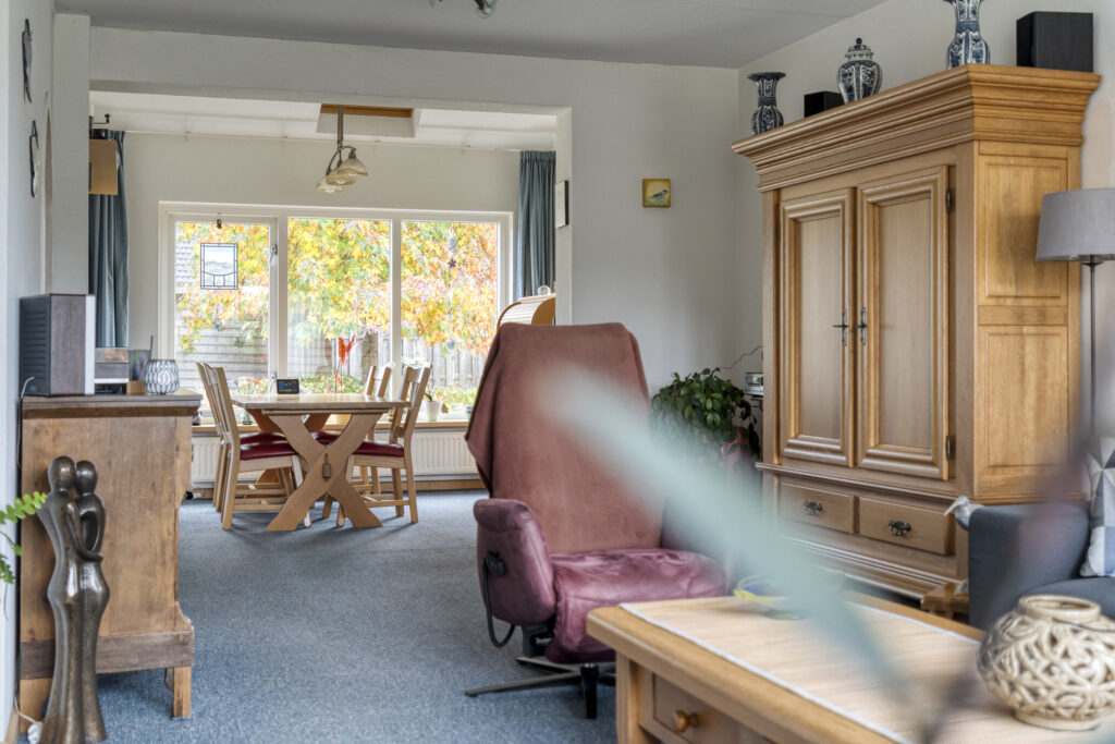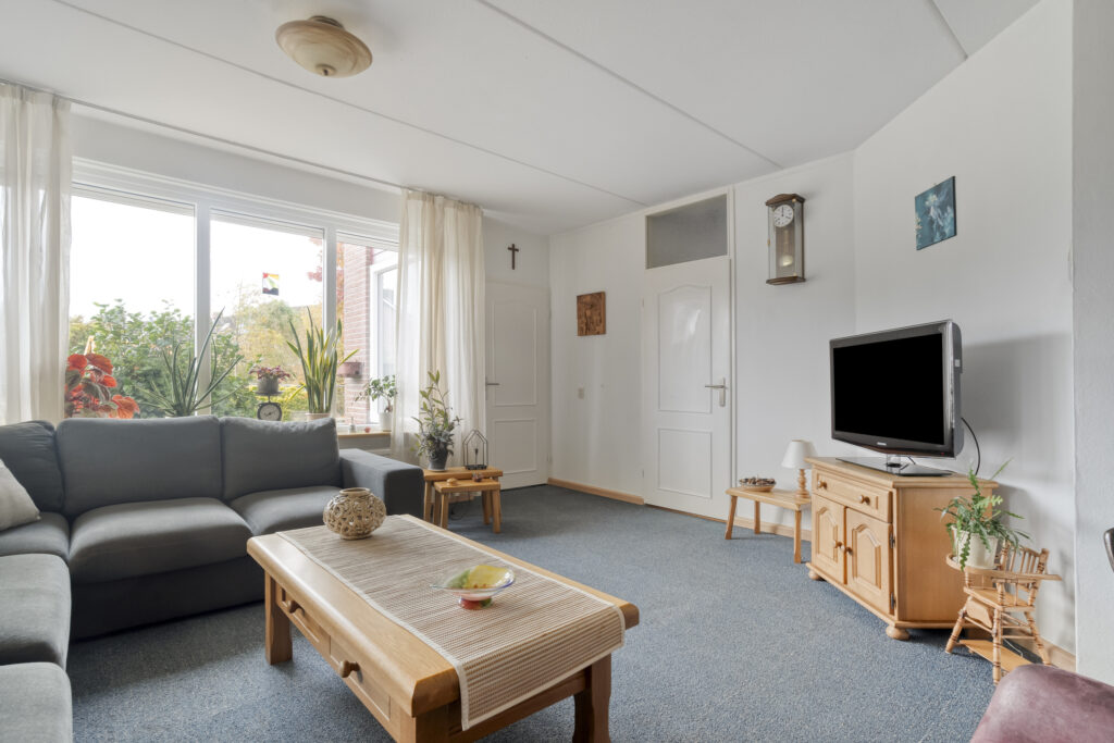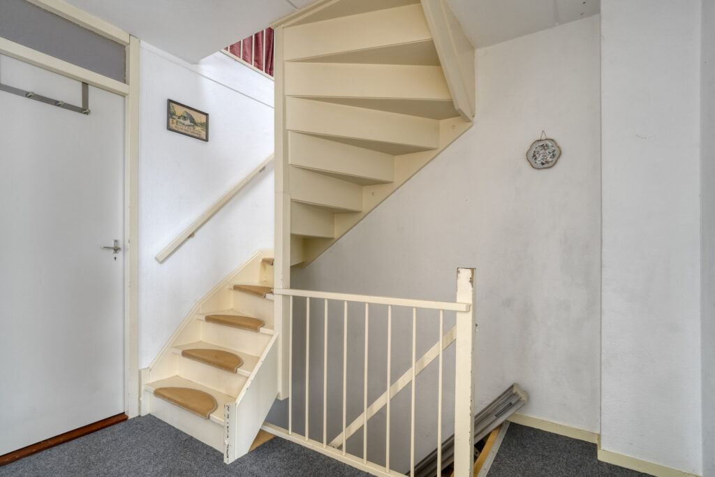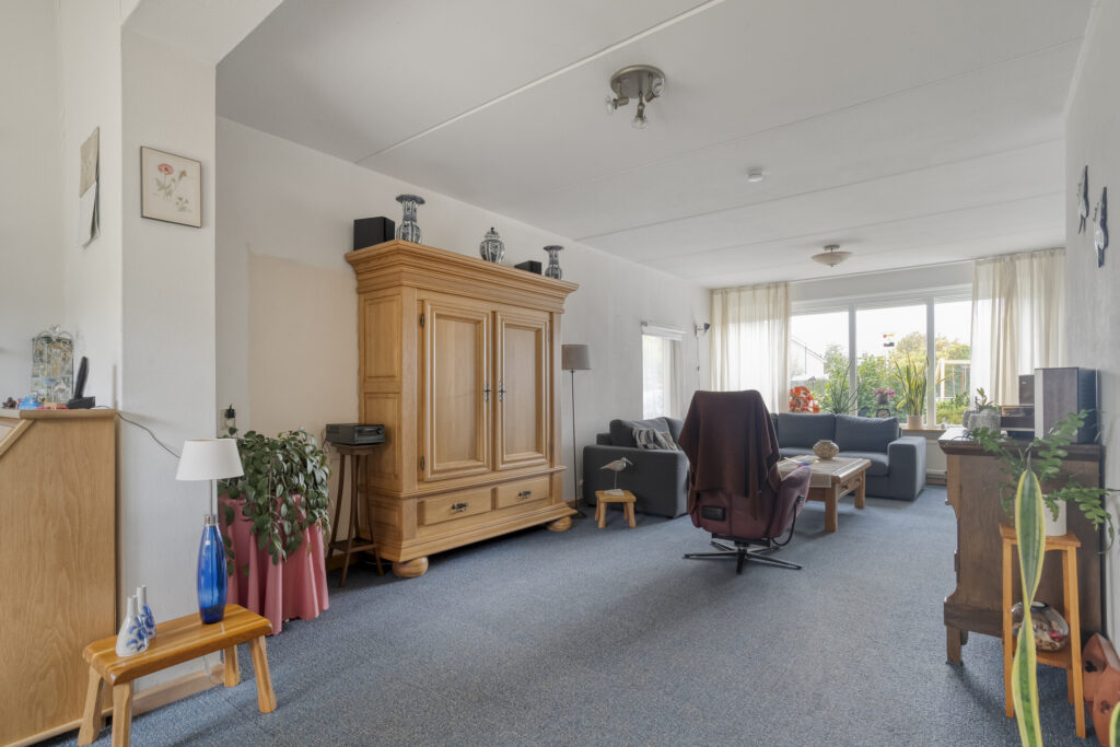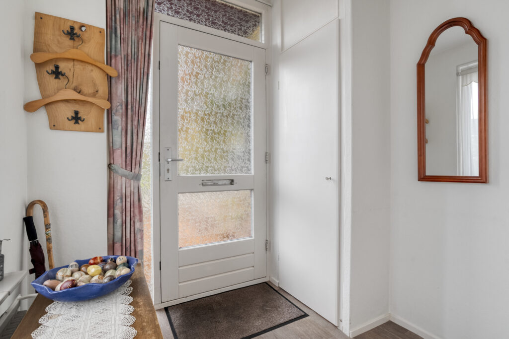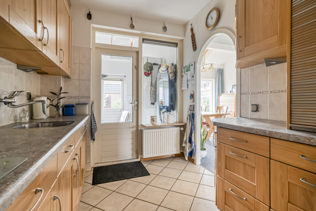 Begane grond: Via de entree is er toegang tot de meterkast, het toilet en de lichte doorzonwoonkamer. De woonkamer beschikt over grote raampartijen en veel lichtinval. De achterzijde van de woning is uitgebouwd, waardoor de woonkamer ruimer is geworden en er een praktische bijkeuken is toegevoegd. Vanuit de woonkamer is er toegang tot de hal met trapopgang naar de eerste verdieping. De keuken is via een open doorgang vanuit de woonkamer bereikbaar en voorzien van diverse inbouwapparatuur. Vanuit de keuken kom je in de bijkeuken, waar zich de witgoedaansluitingen bevinden en een achterdeur naar de tuin.