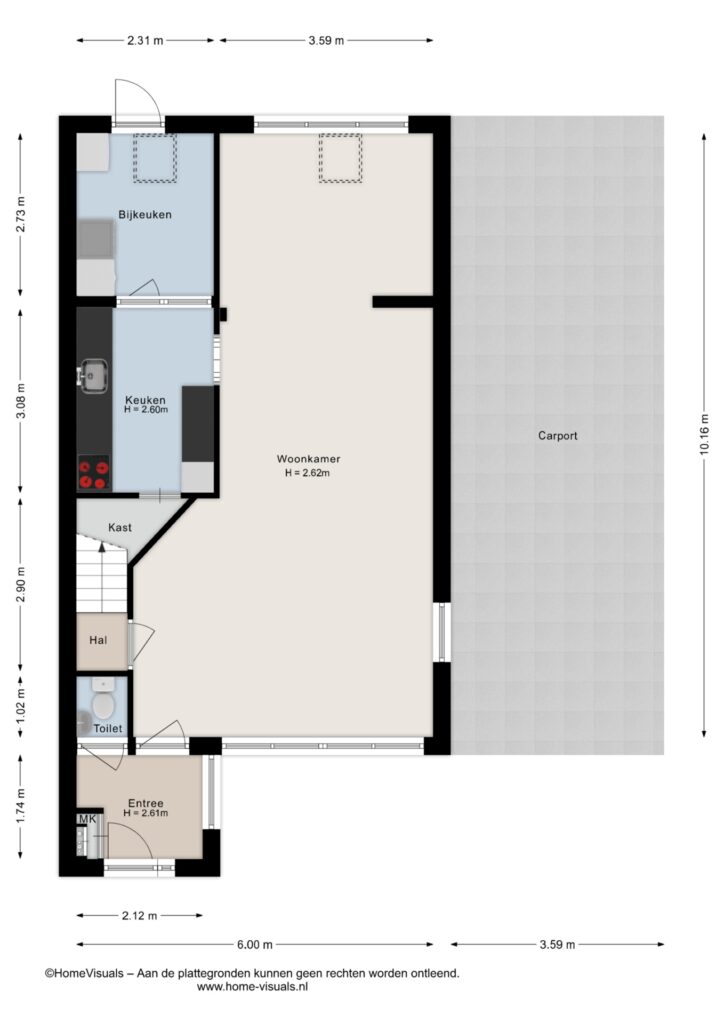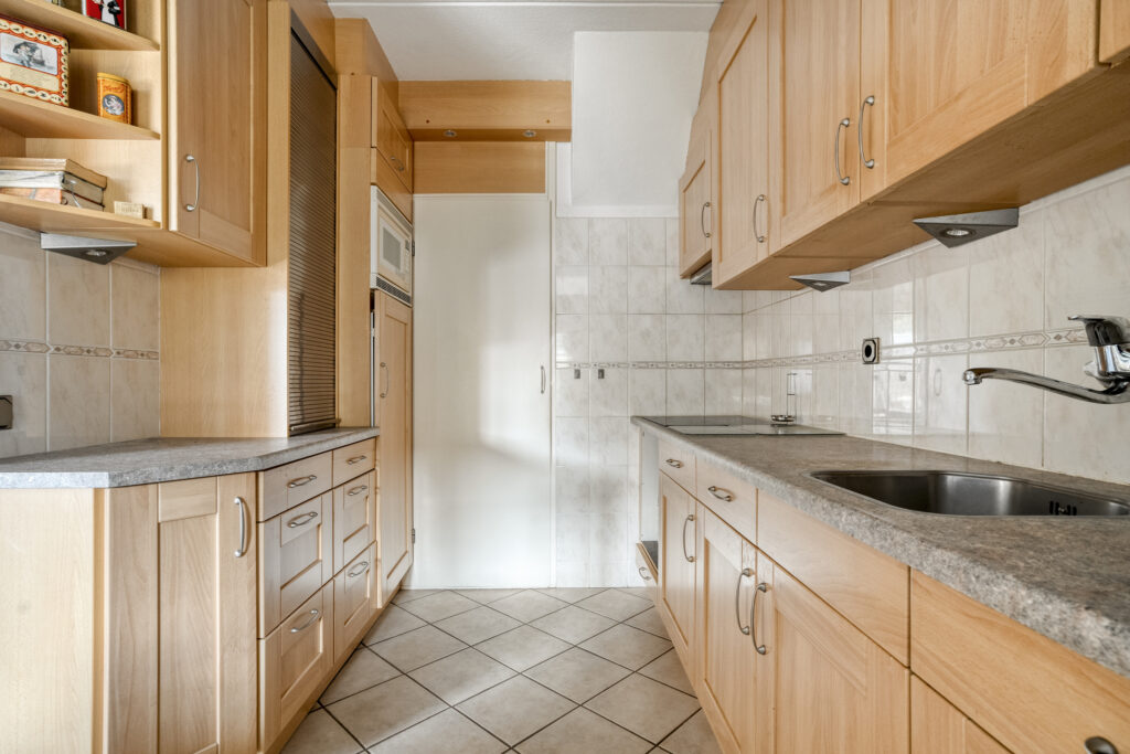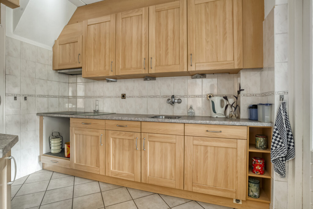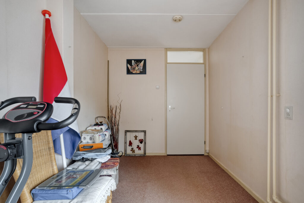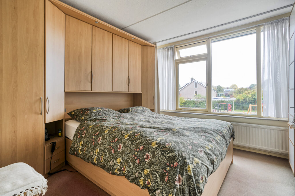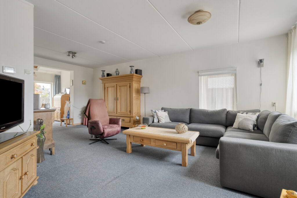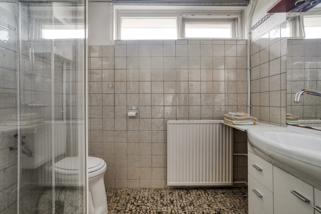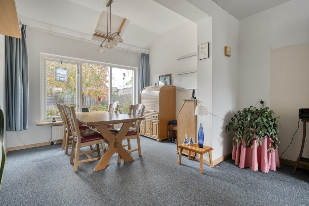 Begane grond: Via de entree is er toegang tot de meterkast, het toilet en de lichte doorzonwoonkamer. De woonkamer beschikt over grote raampartijen en veel lichtinval. De achterzijde van de woning is uitgebouwd, waardoor de woonkamer ruimer is geworden en er een praktische bijkeuken is toegevoegd. Vanuit de woonkamer is er toegang tot de hal met trapopgang naar de eerste verdieping. De keuken is via een open doorgang vanuit de woonkamer bereikbaar en voorzien van diverse inbouwapparatuur. Vanuit de keuken kom je in de bijkeuken, waar zich de witgoedaansluitingen bevinden en een achterdeur naar de tuin.