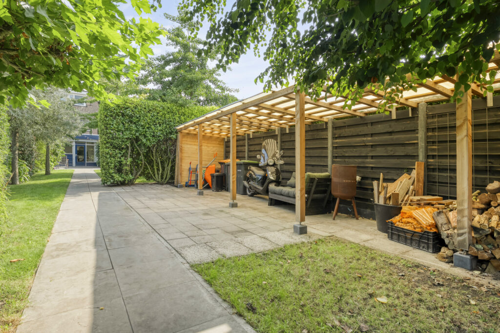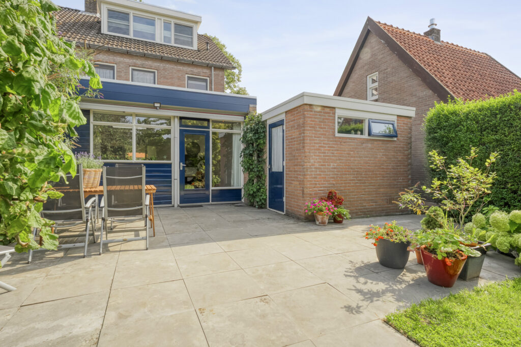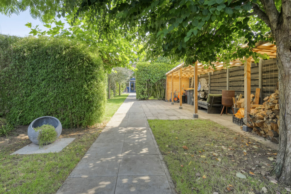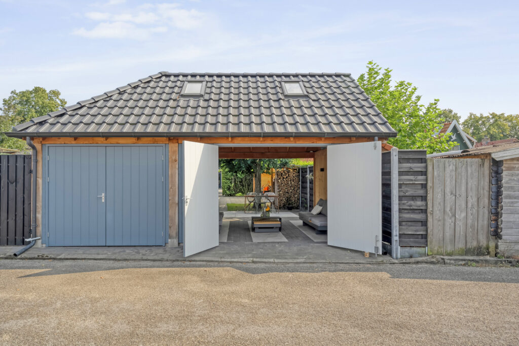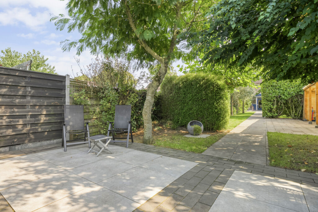 Buiten: De achtertuin is royaal en biedt volop privacy. De garage is voorzien van een dubbele deuren en een loopdeur naar de tuin. Via de vloer van de garage kom je onder de vloer van de keuken, waar zich de grondwaterpomp bevindt. Achterin de tuin staat een kapschuur met twee dubbele deuren, bergruimte en een zolder. Tevens zijn er meerdere grondwater-tappunten aanwezig in de tuin, ideaal voor tuinonderhoud. De tuin is tevens bereikbaar via een achterom.