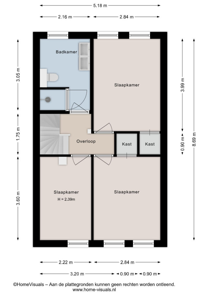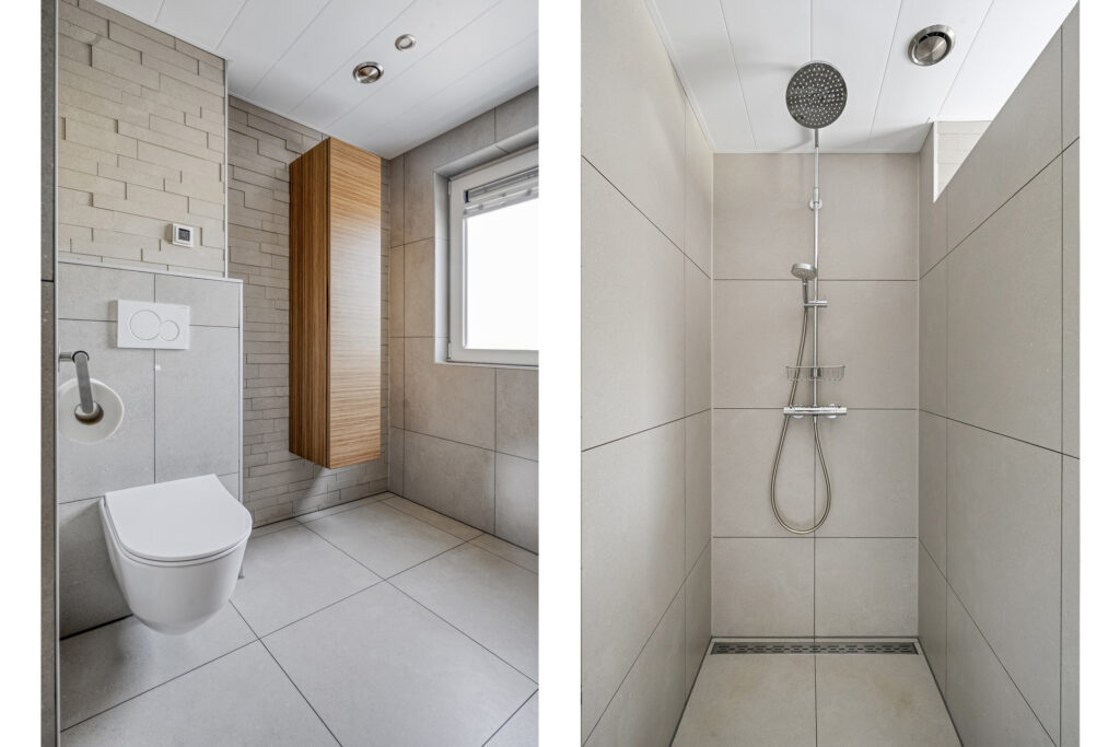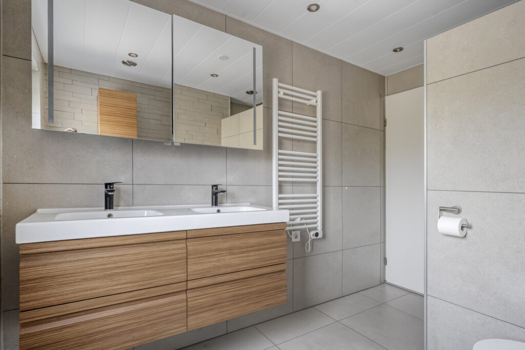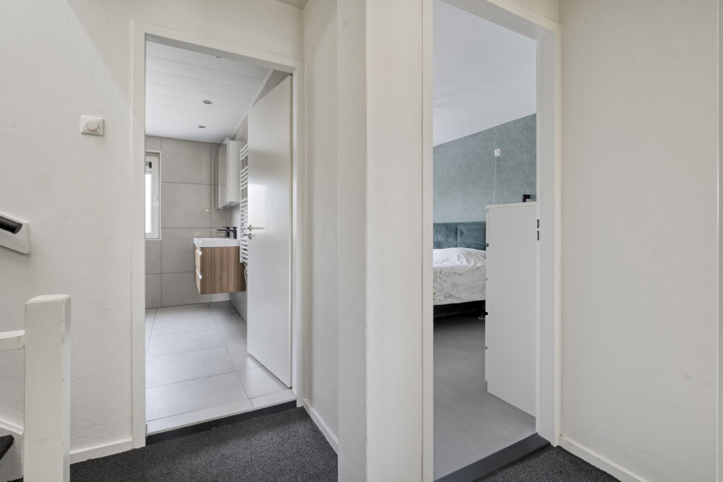 Eerste verdieping: Overloop met toegang tot drie slaapkamers en de badkamer. Twee van de drie slaapkamers beschikken over een vaste kast. De moderne badkamer met elektrische vloerverwarming is voorzien van een toilet, een inloopdouche, een wastafelmeubel met dubbele wasbak en elektrische handdoekradiator.