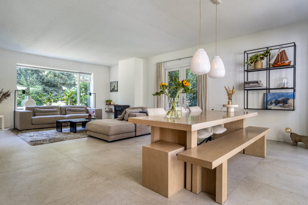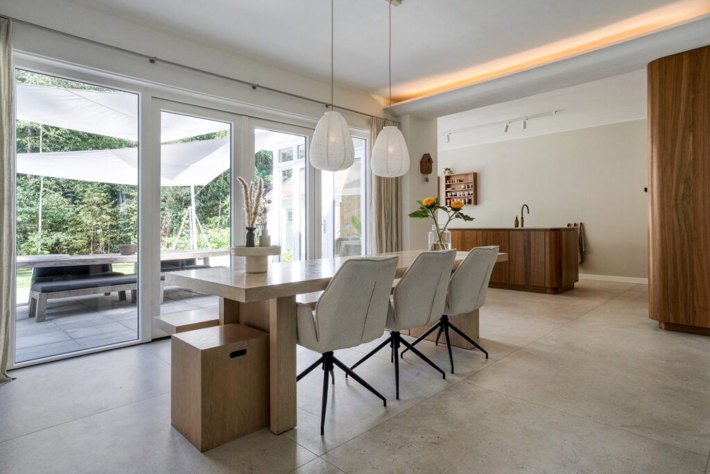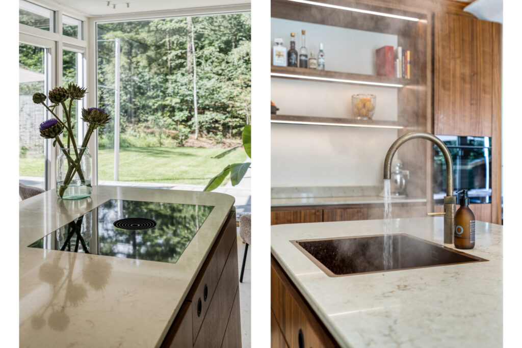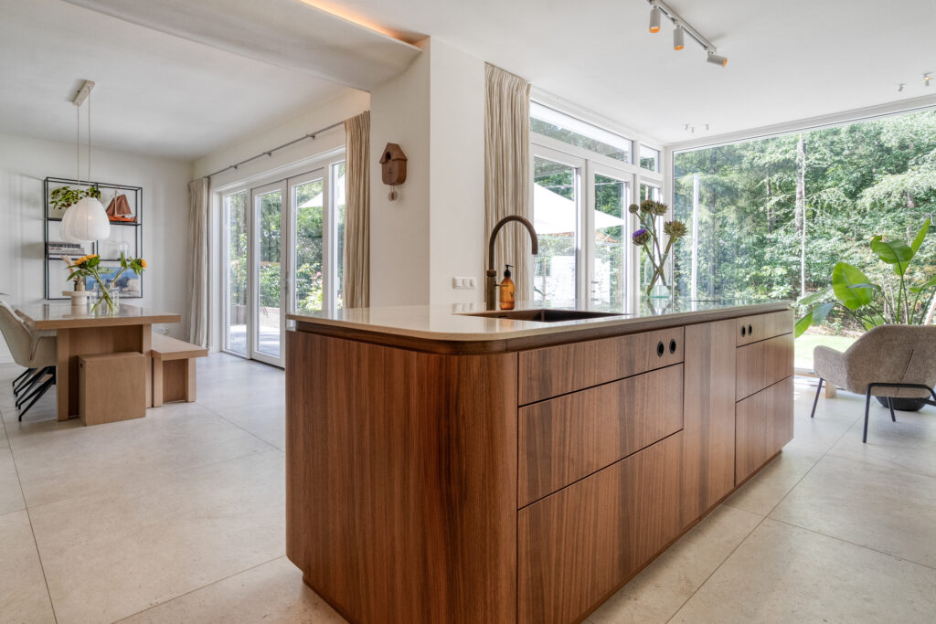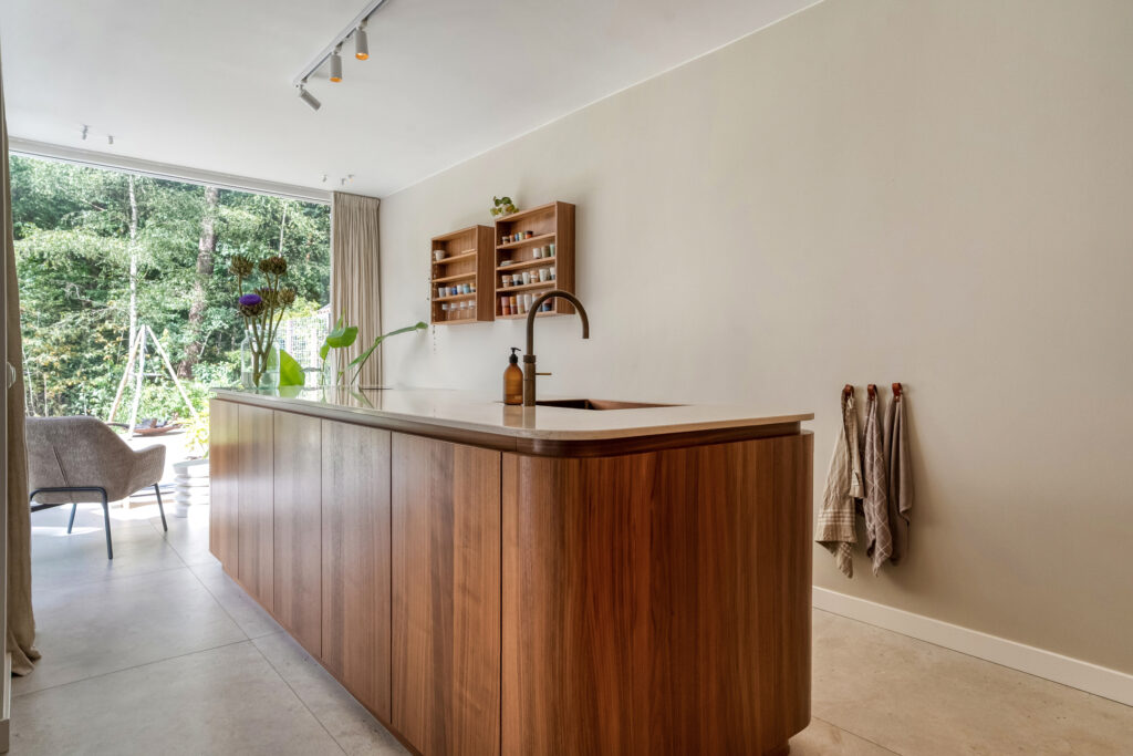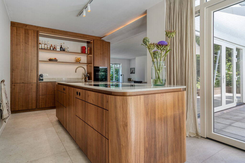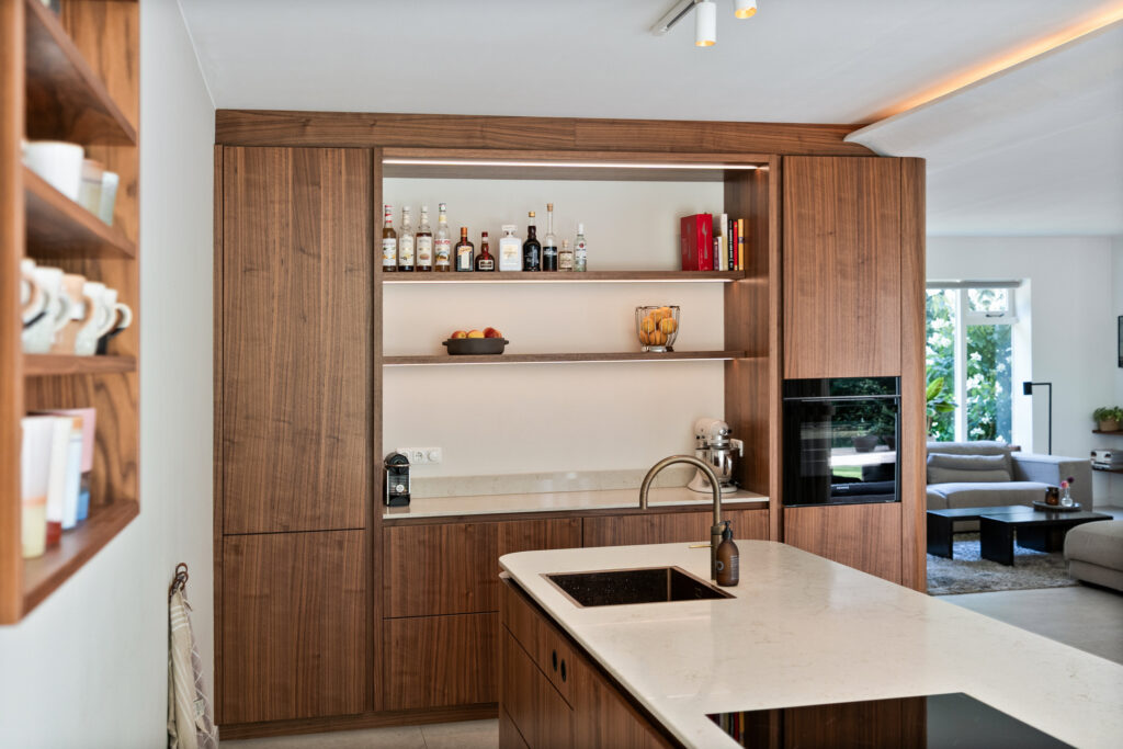 De prachtige maatwerk keuken met luxe afwerking, vaste kastenwand met koffiecorner en kook-/spoeleiland is in 2023 geplaatst en voorzien van een oven met stoomfunctie, koel-vries combinatie, vaatwasser, Quooker en inductie-kookplaat met down draft systeem. Door middel van openslaande tuindeuren is ook via de keuken de tuin met terras te bereiken.