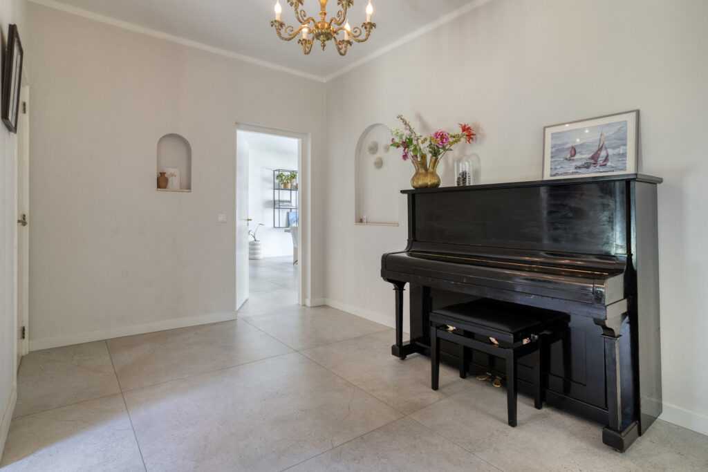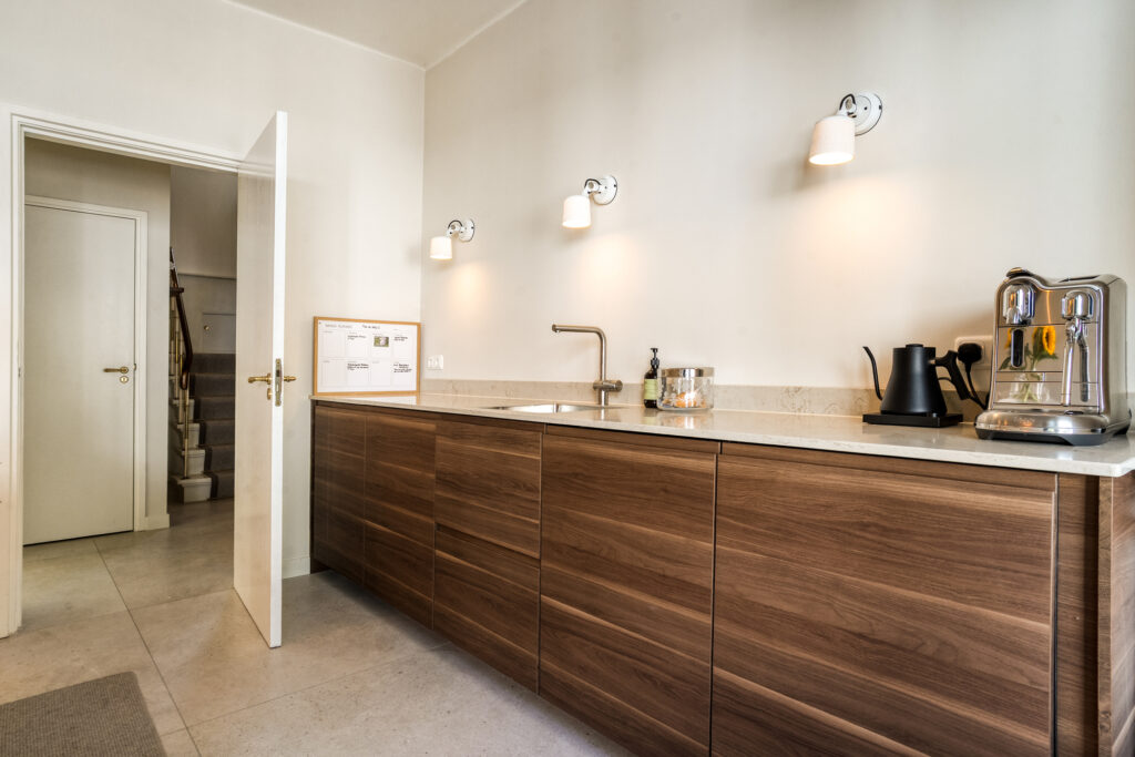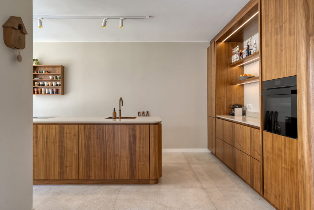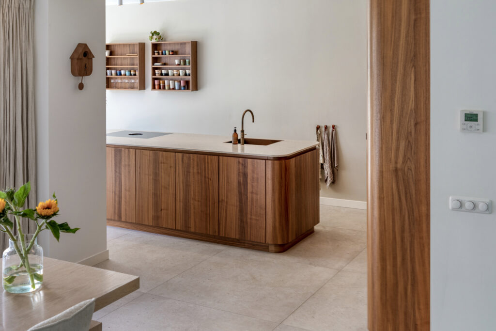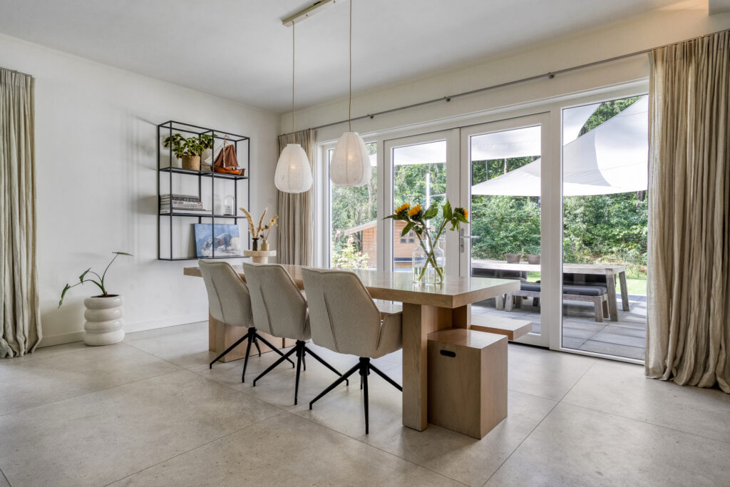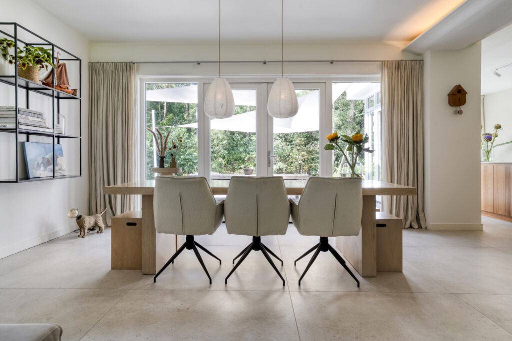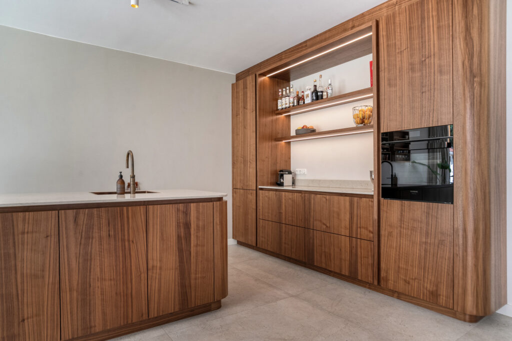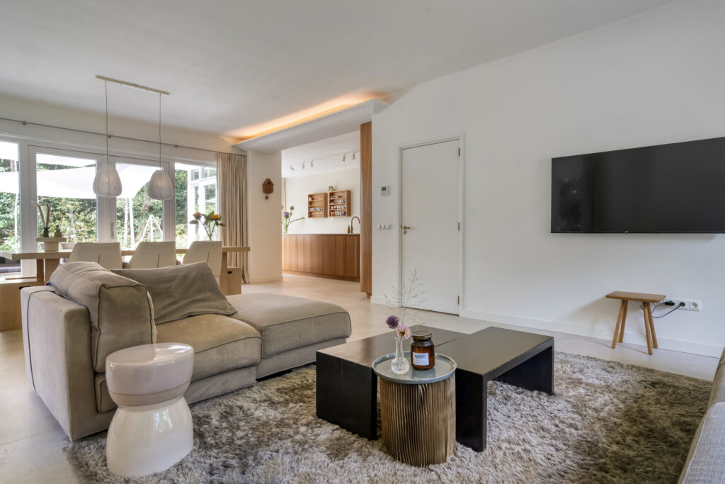De prachtige maatwerk keuken met luxe afwerking, vaste kastenwand met koffiecorner en kook-/spoeleiland is in 2023 geplaatst en voorzien van een oven met stoomfunctie, koel-vries combinatie, vaatwasser, Quooker en inductie-kookplaat met down draft systeem. Door middel van openslaande tuindeuren is ook via de keuken de tuin met terras te bereiken.