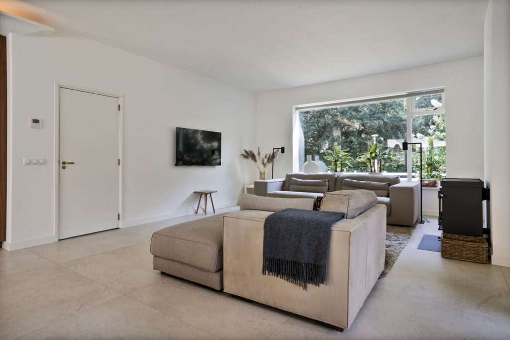 Begane grond: Entree/hal met voorportaal, royale hal, toilet en toegang naar de verdieping, kelder, woonkamer, kamer met keuken en kantoor beneden. De ruime woonkamer is voorzien van een sfeervolle en duurzame Jacobushaard, openslaande tuindeuren naar het terras en geeft toegang tot de open keuken.