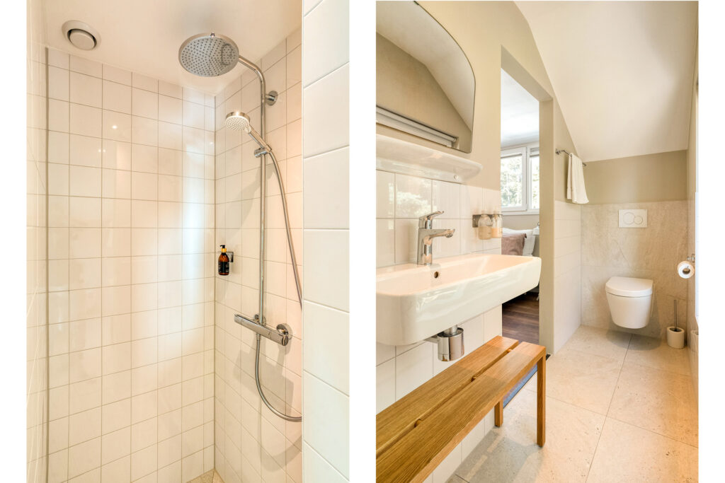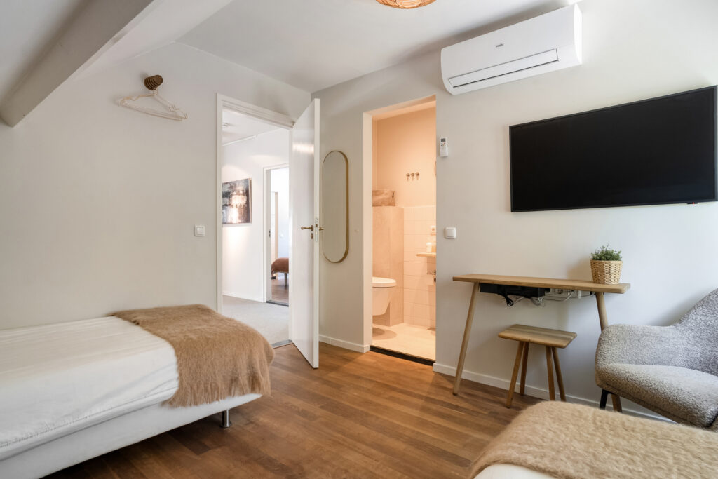 Kamer 3: Slaapkamer met airconditioning, verwarming, televisie, twee aparte bedden en badkamer voorzien van inloopdouche, toilet en wastafel.