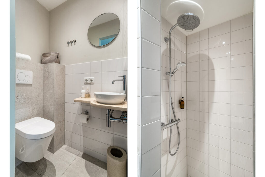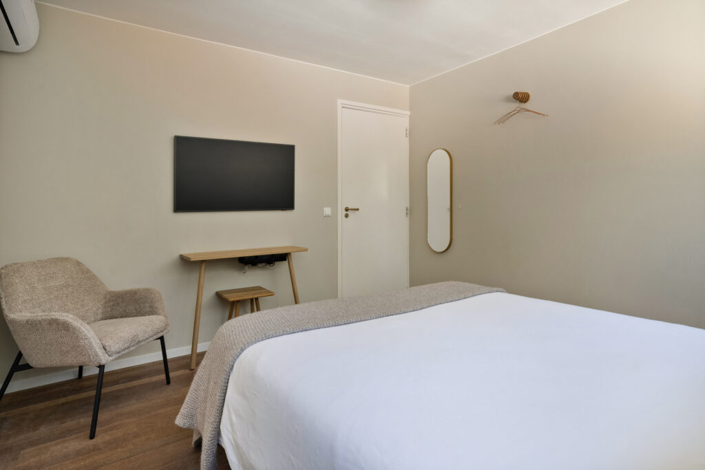 Kamer 1: Slaapkamer met airconditioning, verwarming, televisie, tweepersoonsbed en badkamer voorzien van inloopdouche, toilet en wastafel.